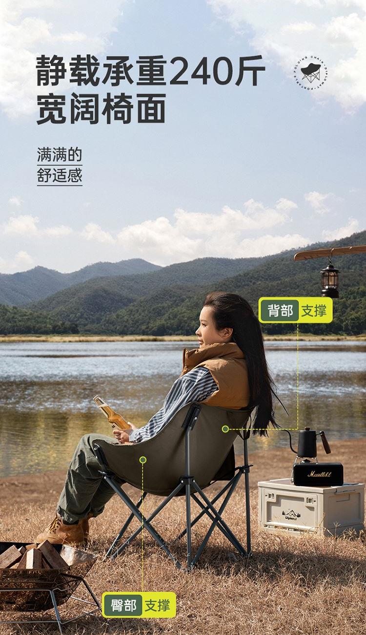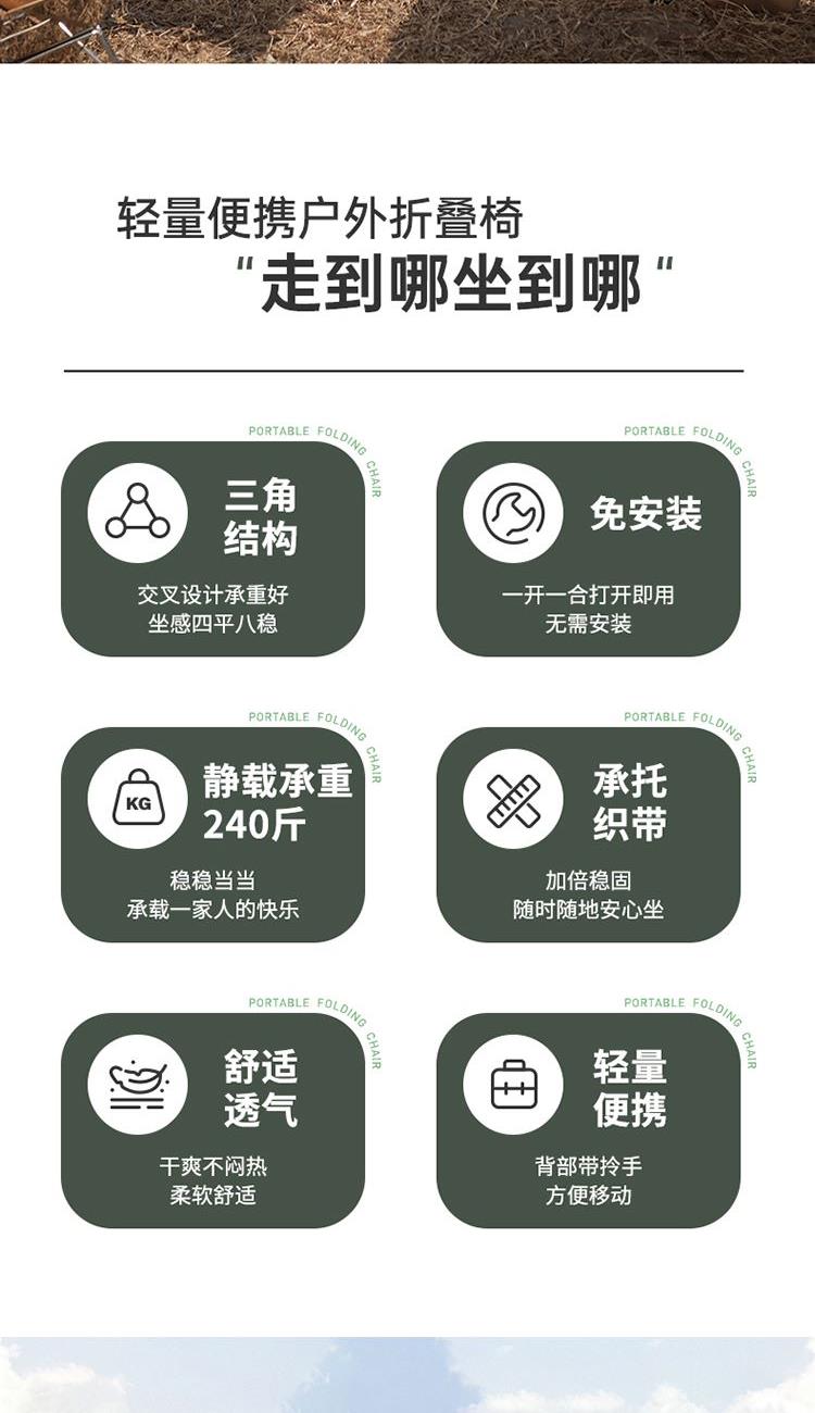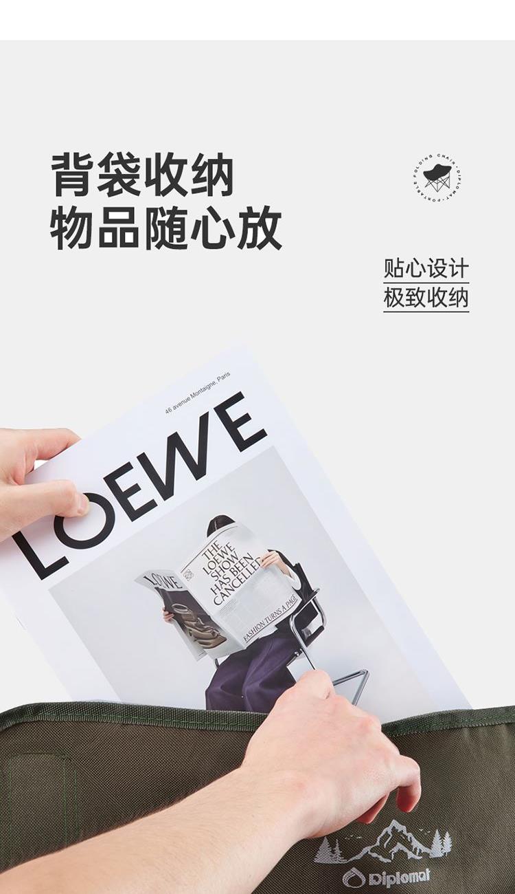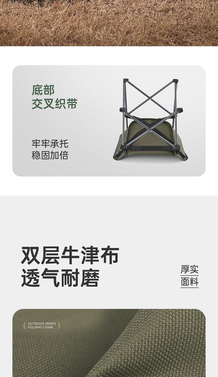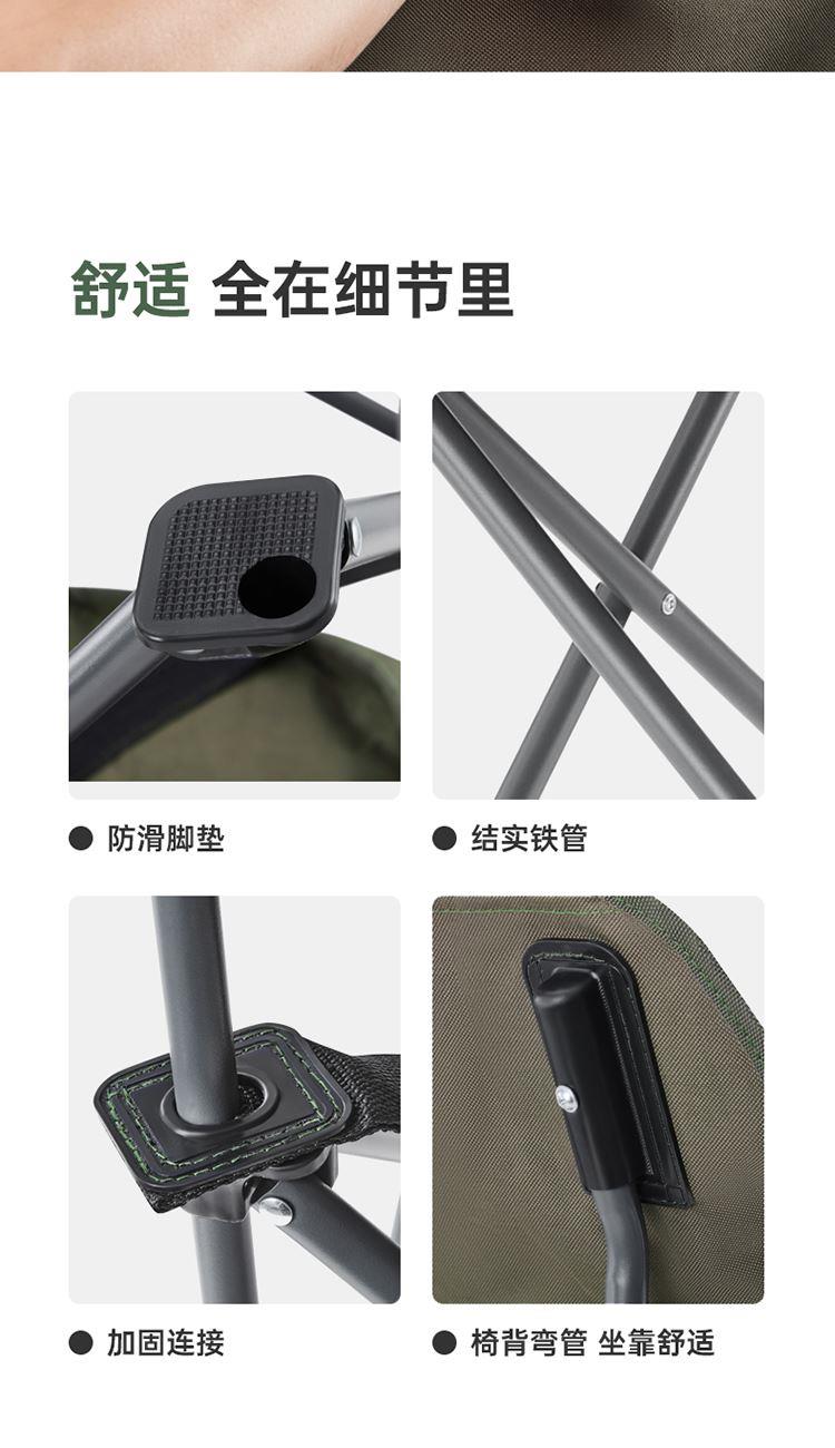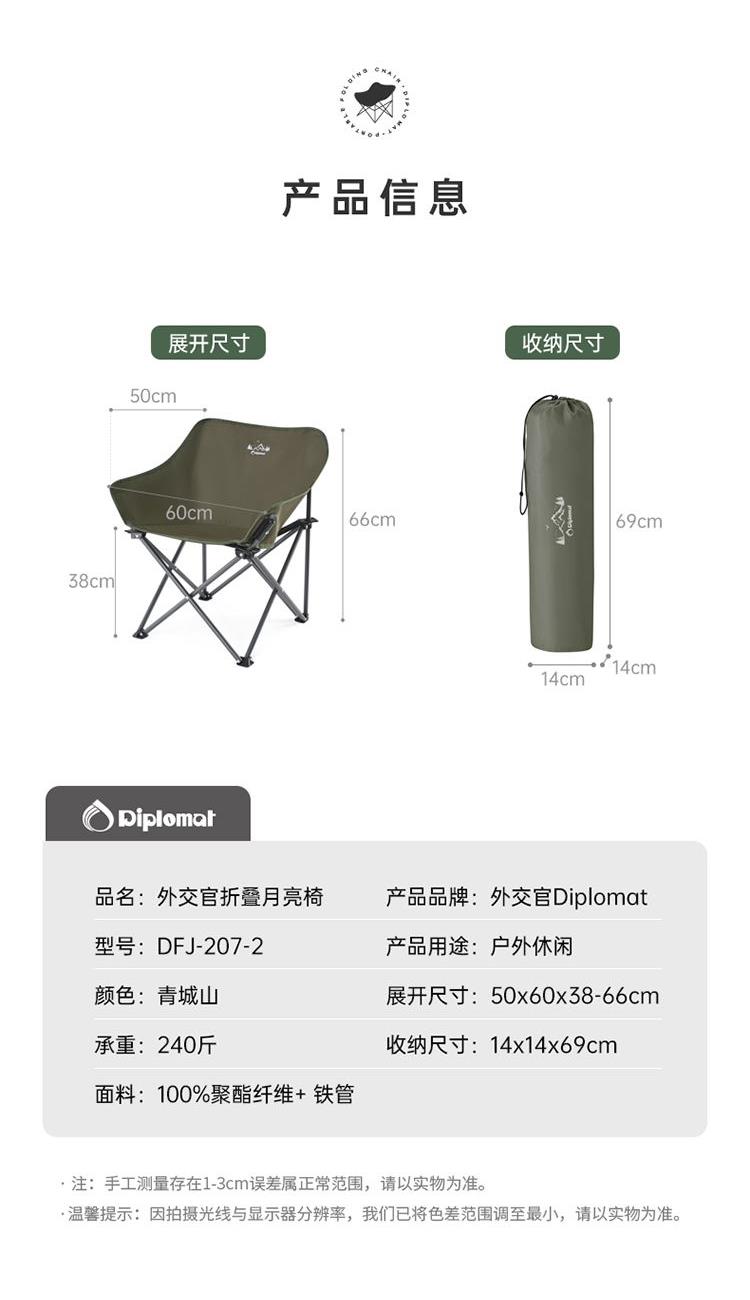 产品尺寸:50x60x38-66cm 收纳尺寸:14x14x69cm 产品材质:聚酯纤维+铁管 产品颜色:青城山 产品包装:收纳布袋+邮购盒 1、底部升级承托带,静载承重可达240斤。 2、后背双层开口,可存放随身物品。 3、靠背升级弯管,坐靠更舒适。