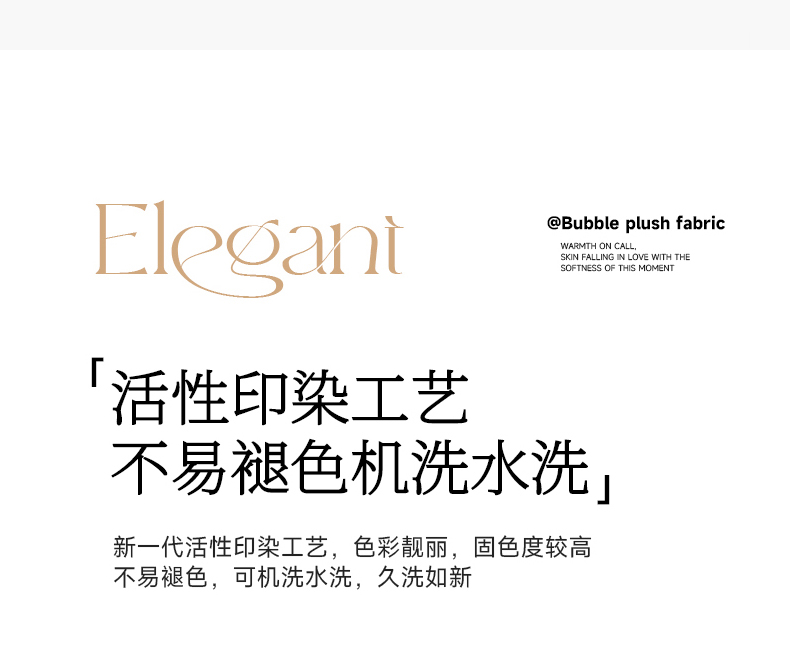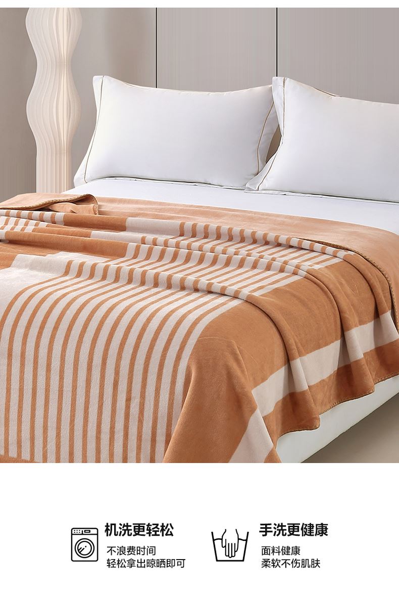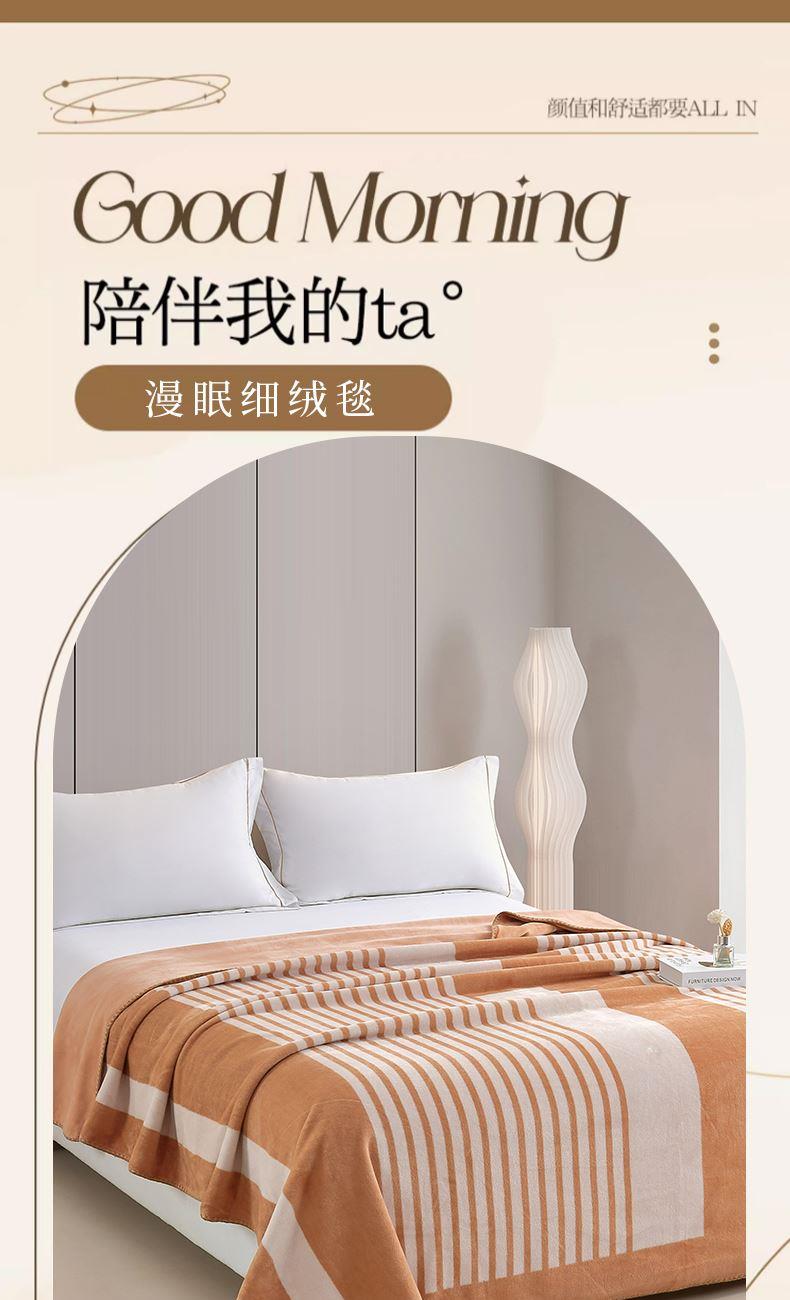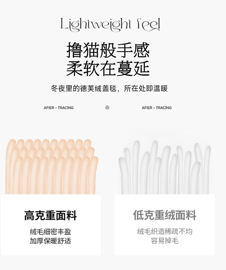 规格:200*230cm 面料:德芙绒 克重:2300g 执行标准:FZ/T61002-2019 安全类别:GB18401-2010 B类 采用德芙绒面料,加厚绒毛形成空气保温层,贴身瞬间即可锁住体温,带来云朵包裹般的温暖体验。面料通过立体压花工艺呈现细腻光泽,在光影间流转着温柔质感。 毯身蓬松轻盈却拥有良好的垂坠感,绒毛经过防静电处理,久用仍保持柔软蓬松,不易起球掉毛。可机洗设计方便日常打理,洗涤后依然保持柔糯触感。