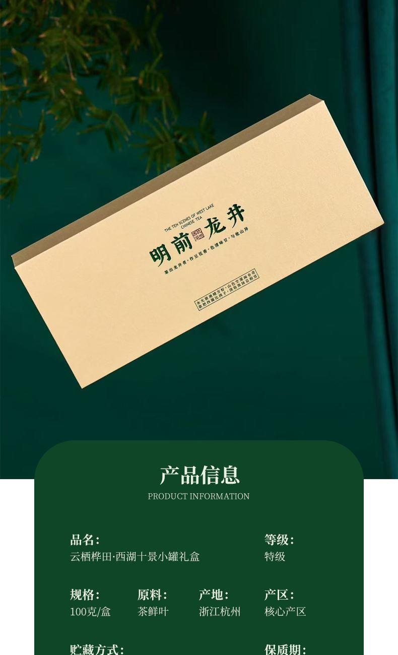 规格:100克/盒 明前龙井100克(10克X10罐) 原料产地:杭州钱塘核心产区 保质期:18个月 甄选核心产区、自然转化风味正、简约罐装礼盒 1. 核心产区茶韵浓厚 2. 传统工艺,香而不腻,清爽甘甜 3. 雅致礼盒,小罐分装;自饮臻享,赠礼有品