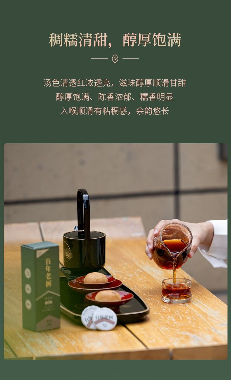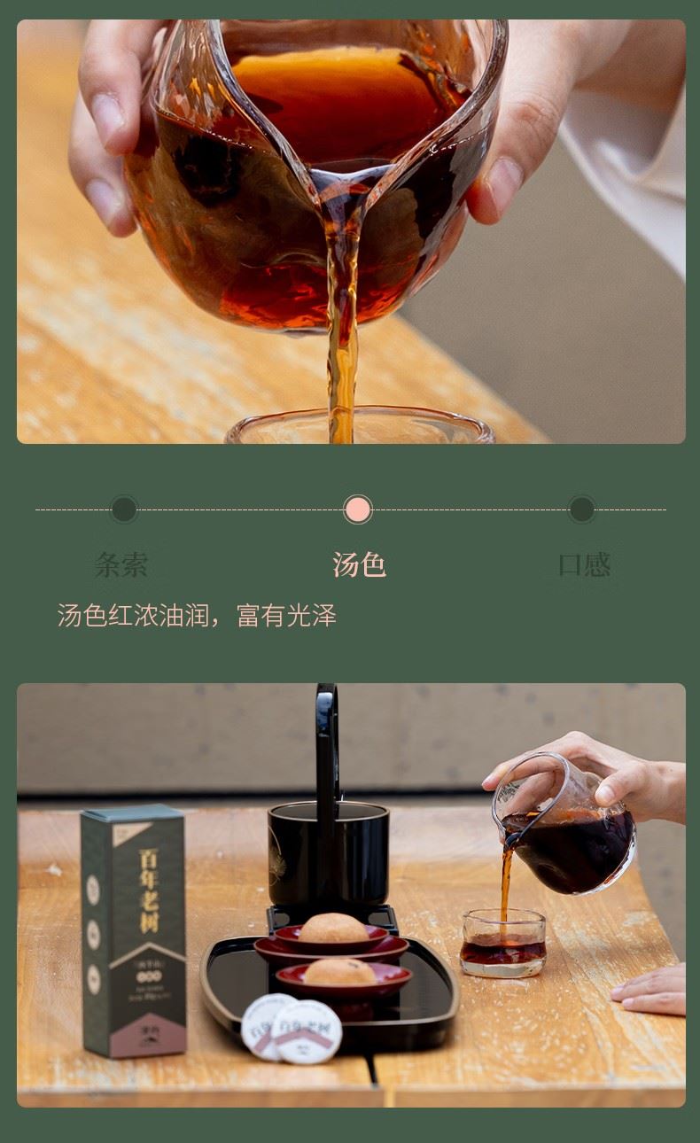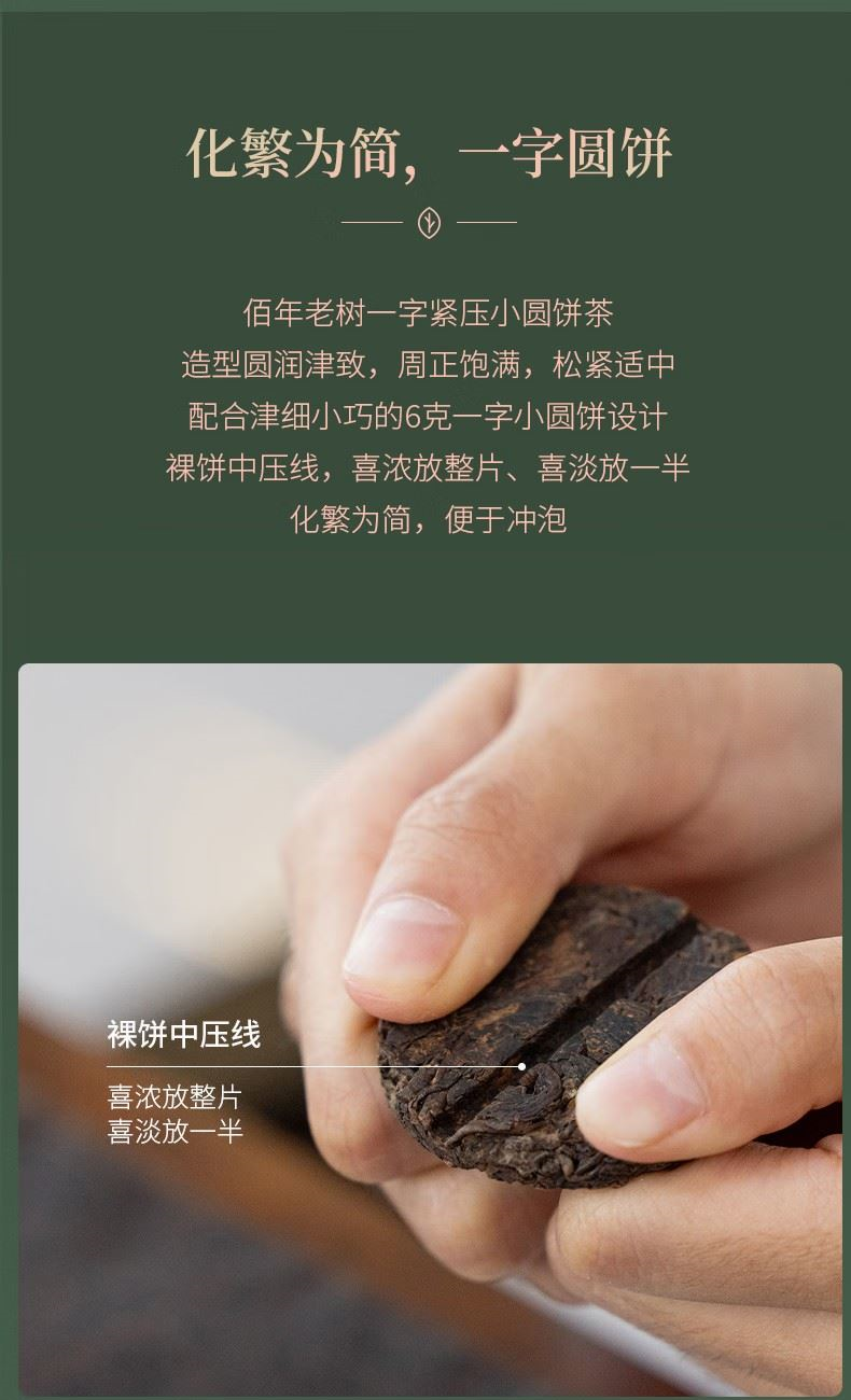 百年老树一字饼”采用“6g一字饼形制”,独立绵纸包装,还可一掰两半,便捷又趣味,开启更加多样冲泡模式。 独立酵间,离地发酵,采用特殊设计的独立窑间窑池,实现单个窑池的控温控湿,让工艺得以良好展现。熟茶汤色红浓莹润,稠糯清甜。