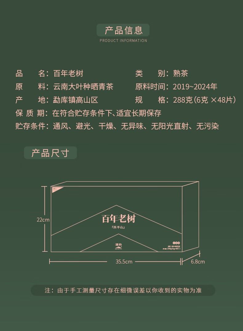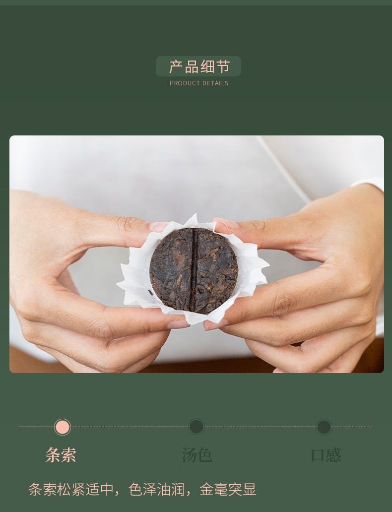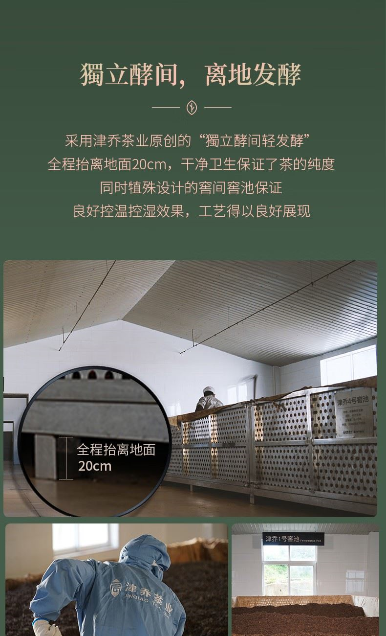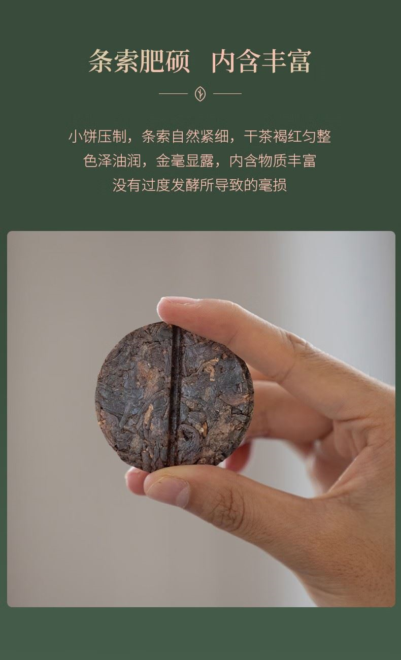 百年老树一字饼”采用“6g一字饼形制”,独立绵纸包装,还可一掰两半,便捷又趣味,开启更加多样冲泡模式。 独立酵间,离地发酵,采用特殊设计的独立窑间窑池,实现单个窑池的控温控湿,让工艺得以良好展现。熟茶汤色红浓莹润,稠糯清甜。