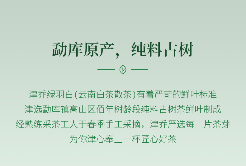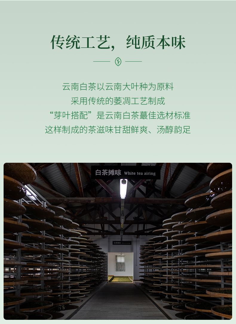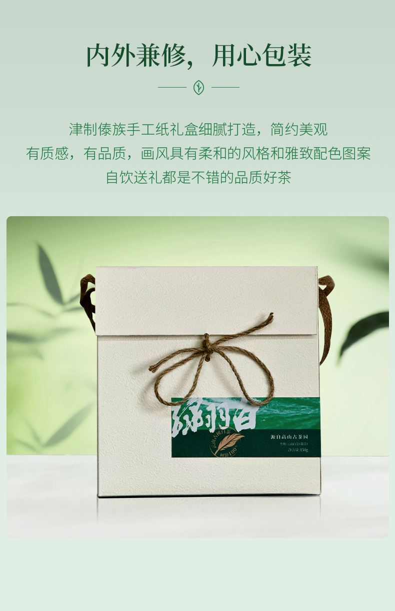 明前头采,早春嫩芽。津选勐库镇高山区佰年树龄段纯料古树茶鲜叶,以一芽一、二叶为原料。采用传统的萎凋工艺制成“芽叶搭配”是云南白茶蕞佳选材标准。傣族手工纸礼盒细腻打造,简约美观有质感,有品质,画风具有柔和的风格和雅致配色图案。