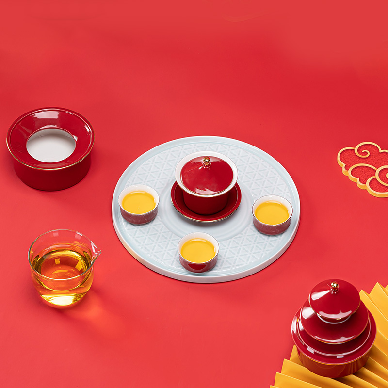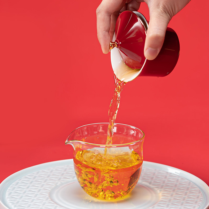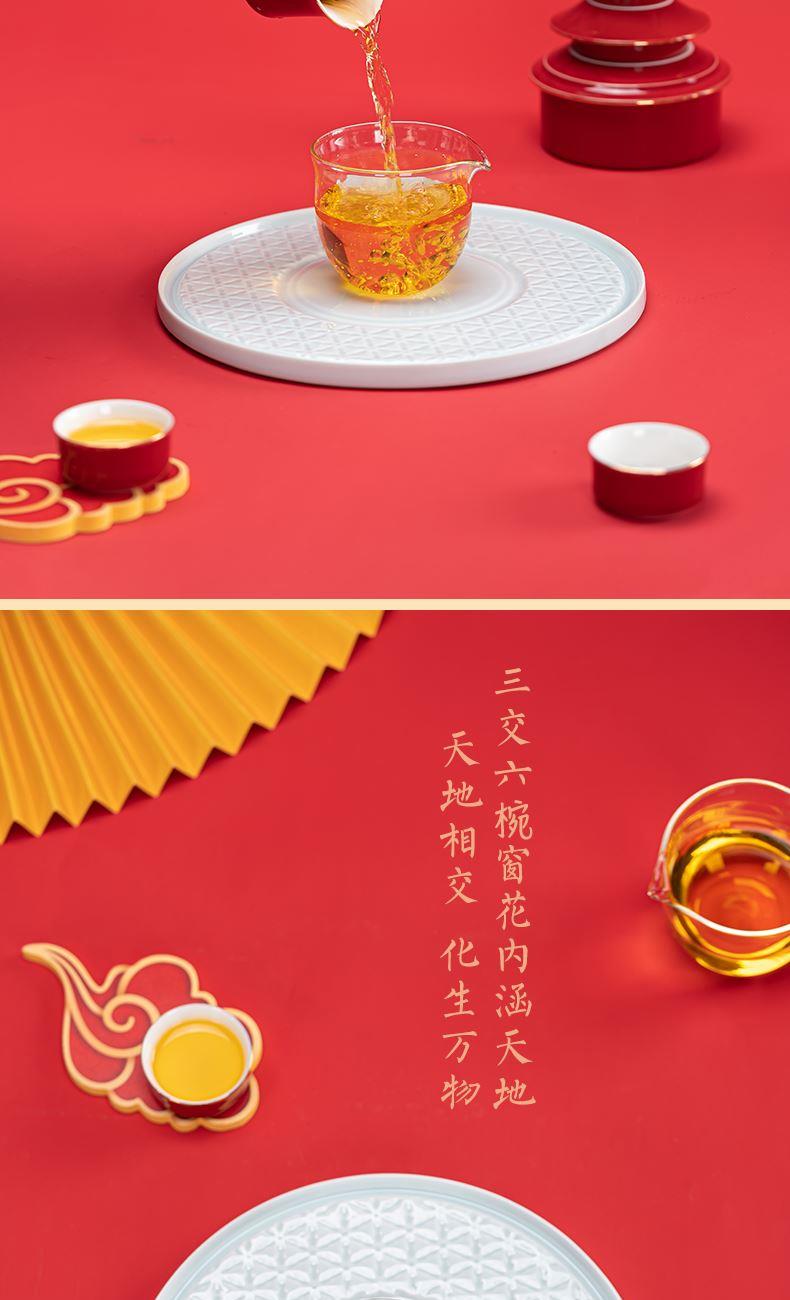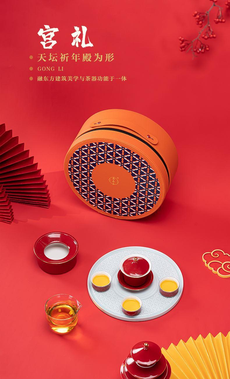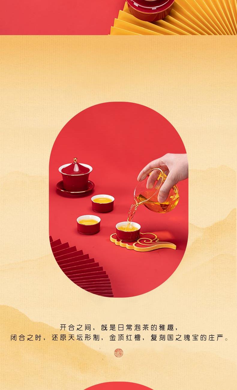 1.以天坛祈年殿为形,融东方建筑美学与茶器功能于一体,开合之间,既是日常泡茶的雅趣,闭合之时,还原天坛祈年的形制,金顶红檐,复刻国之瑰宝的庄严雅致。 2.干泡盘将祈年殿基座与三交六椀窗花融为一体。三交六椀窗花内涵天地,寓意天地相交、化生万物。 3.甄选高纯度故宫红釉,经1300°高温窑变淬炼,釉色匀净莹润,红而不艳、亮而不燥,彰显东方美学的质感。 材 质:高白玉瓷、高硼硅玻璃 容 量:盖碗130ml、茶海280ml、茶杯30ml、水方260ml 包装尺寸:Φ28cm  H12.3cm 配 置:盖碗、茶海、干泡盘各一个,两件式水方一套,茶杯三个,带提手皮革礼盒包装。