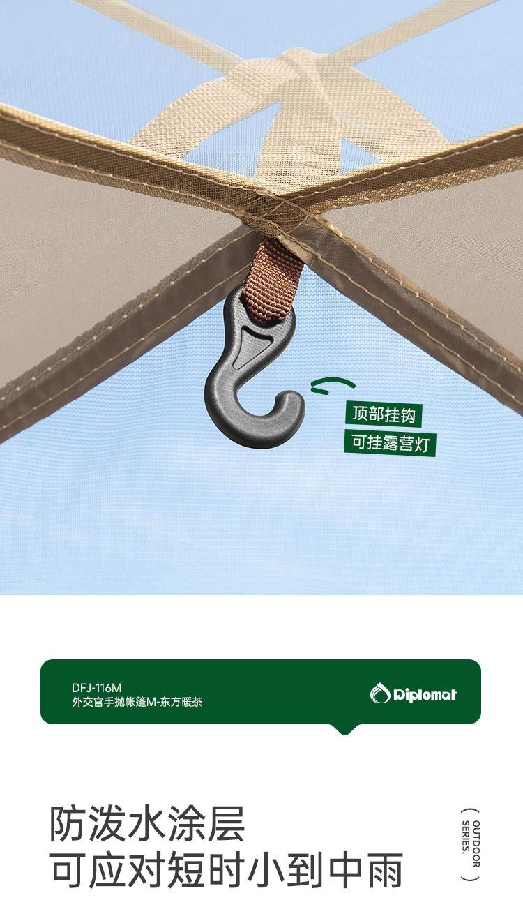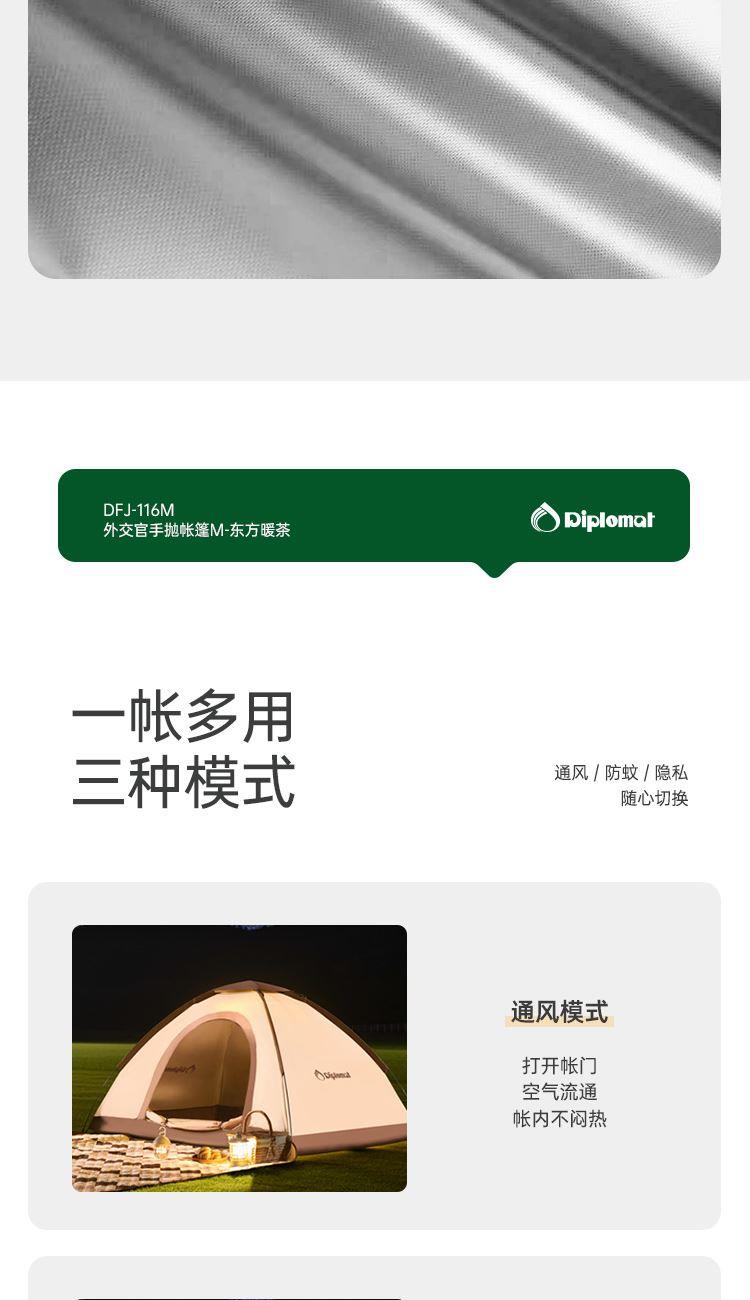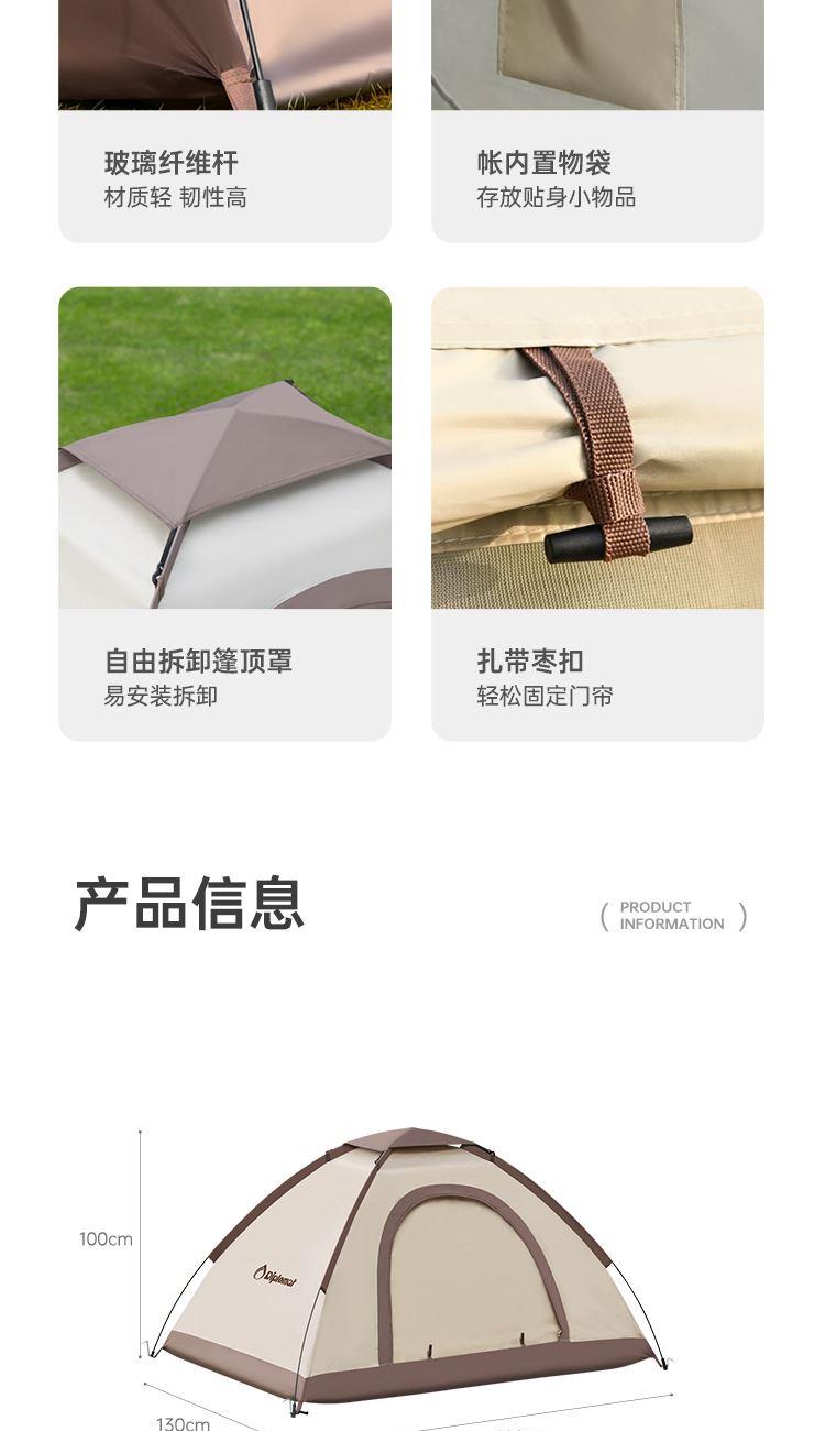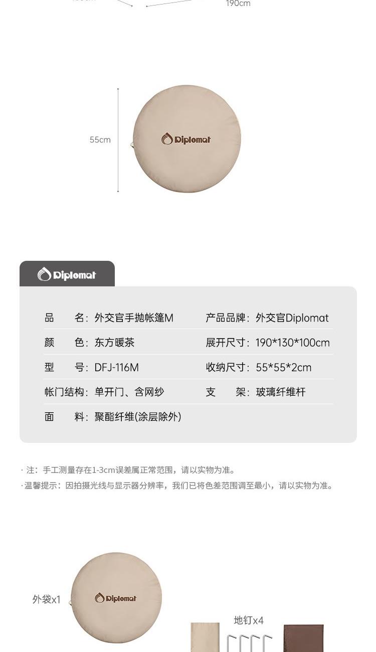 产品尺寸:190x130x100cm 收纳尺寸:55x55x2cm 产品材质:聚酯纤维(涂层除外)+玻璃纤维杆 产品颜色:东方暖茶 产品包装:双肩收纳布袋 1、单开门内附网纱,天窗网纱拼接,加强空气循环。 2、全新折叠科技,一秒速开,开收便捷。 3、帐面及底帐防泼水,银胶防晒。 4、双肩收纳袋,携带方便。