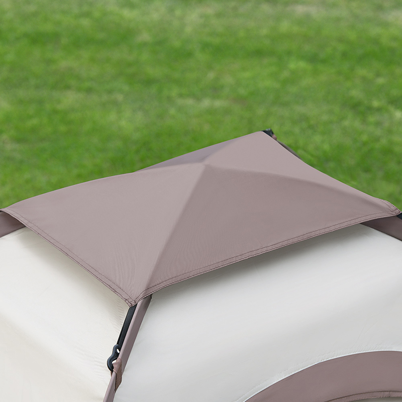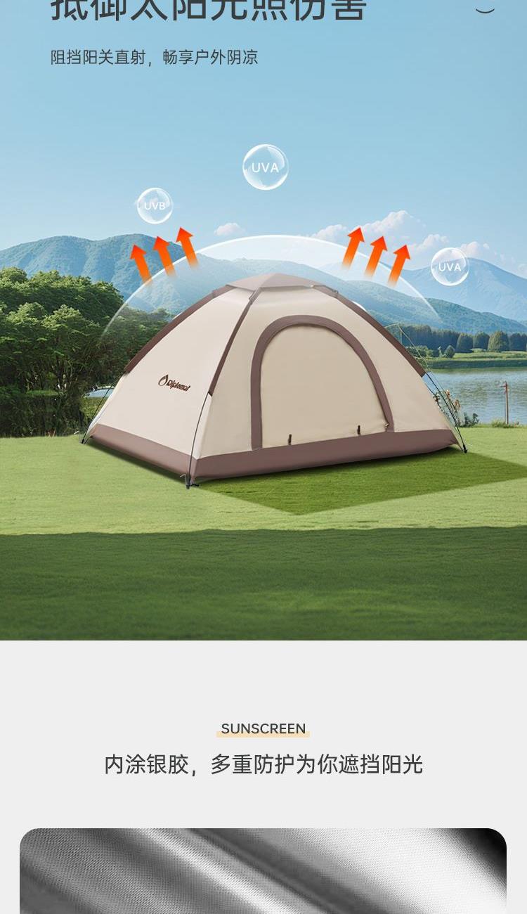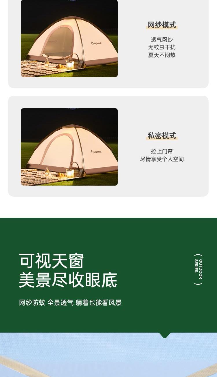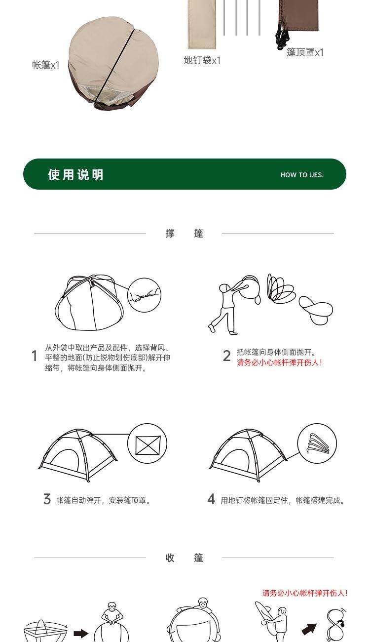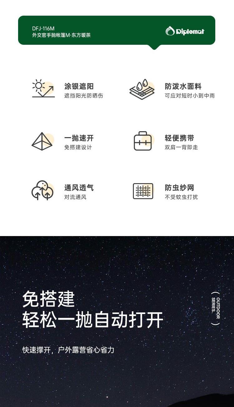 产品尺寸:190x130x100cm 收纳尺寸:55x55x2cm 产品材质:聚酯纤维(涂层除外)+玻璃纤维杆 产品颜色:东方暖茶 产品包装:双肩收纳布袋 1、单开门内附网纱,天窗网纱拼接,加强空气循环。 2、全新折叠科技,一秒速开,开收便捷。 3、帐面及底帐防泼水,银胶防晒。 4、双肩收纳袋,携带方便。