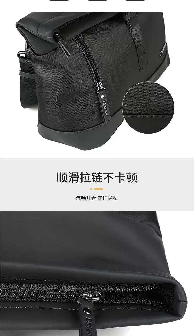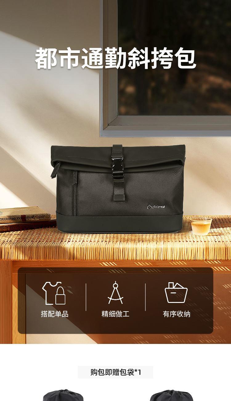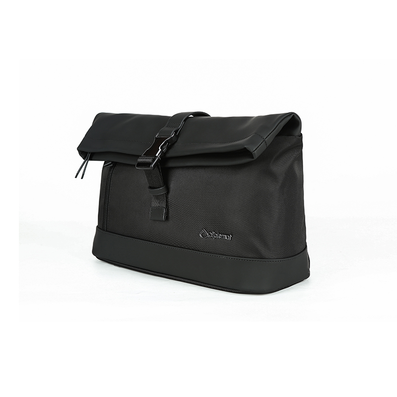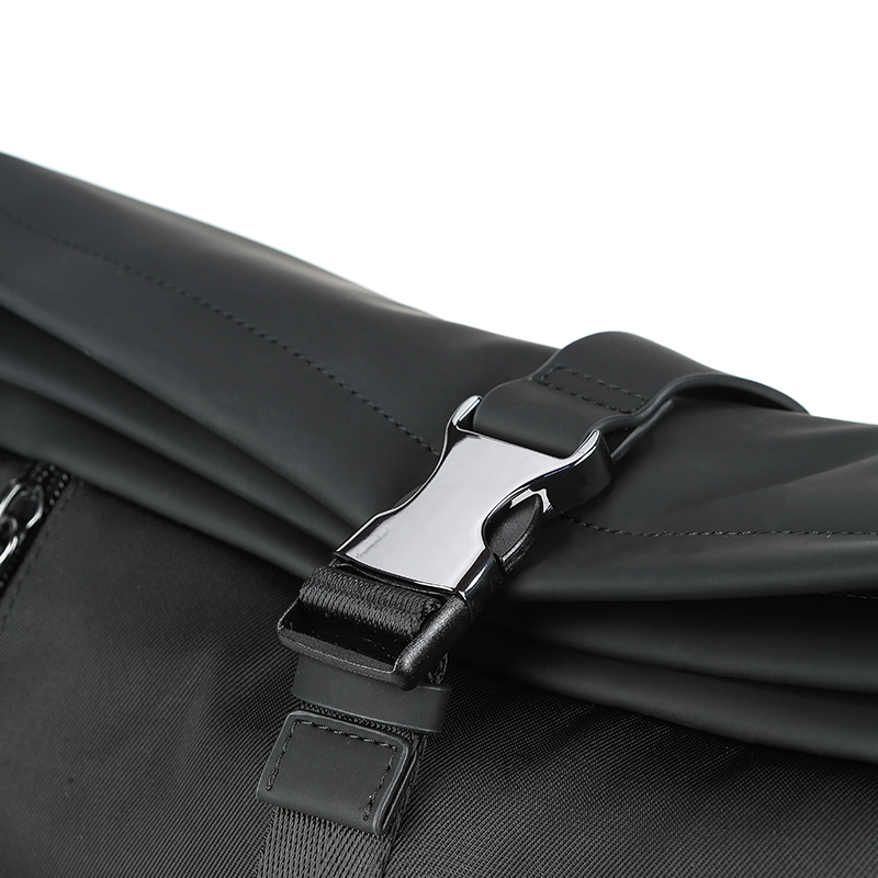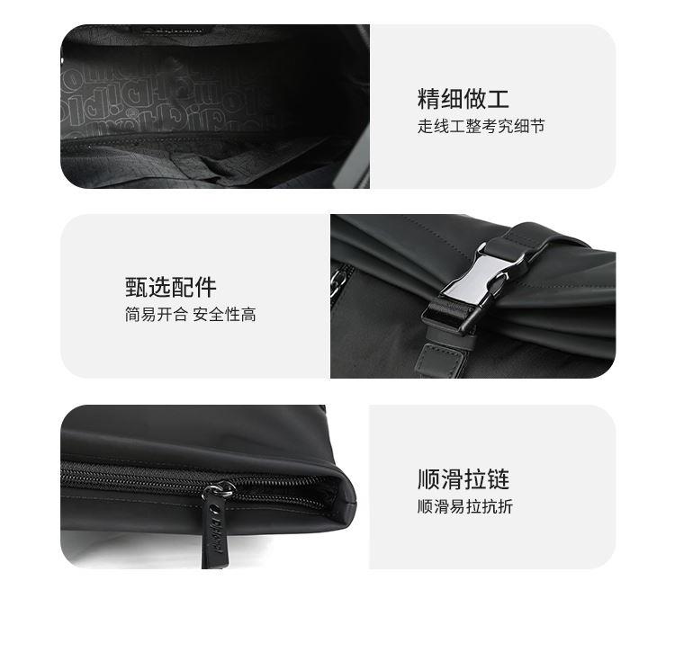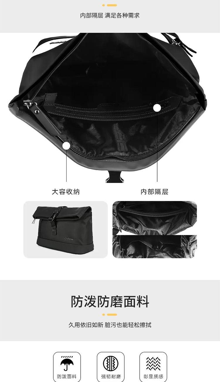 产品材质:织物料+合成材料 产品颜色:黑色 外观尺寸:300*130*220mm 1、卷盖设计,灵活扩容,轻松置物 2、高密度PU+优质面料,防泼耐磨,无惧风雨 3、顶部大开口,直通主仓,秒速存取 4、拉链金属卡扣设计,防止物品倒出 5、前置小物仓,背部隐形收纳仓,手机证件随取随用