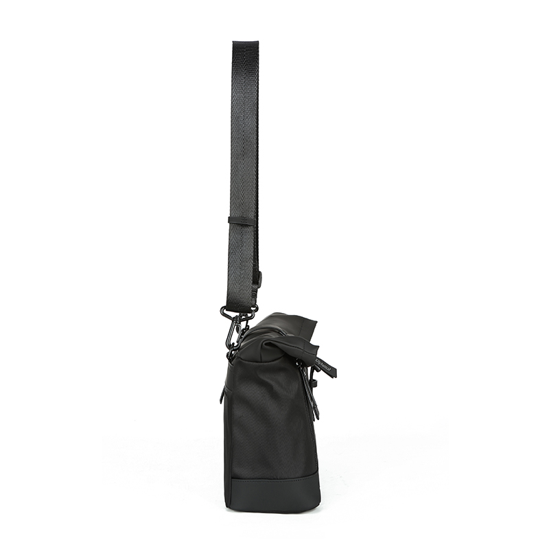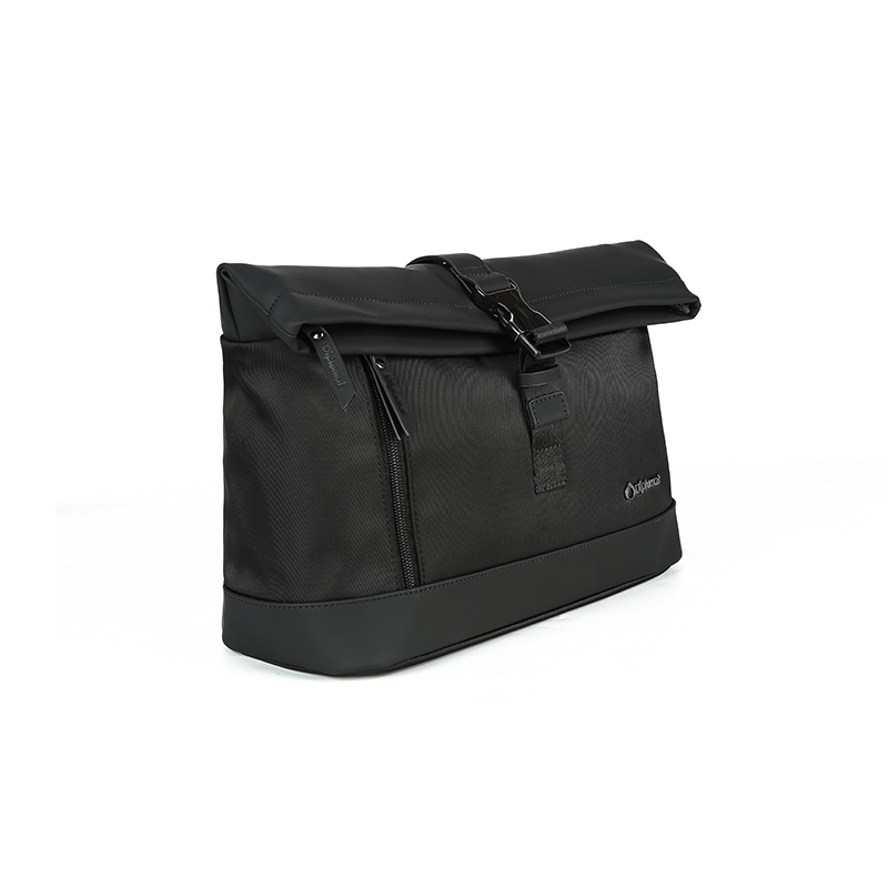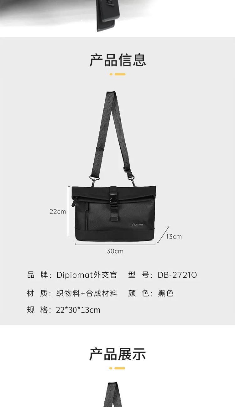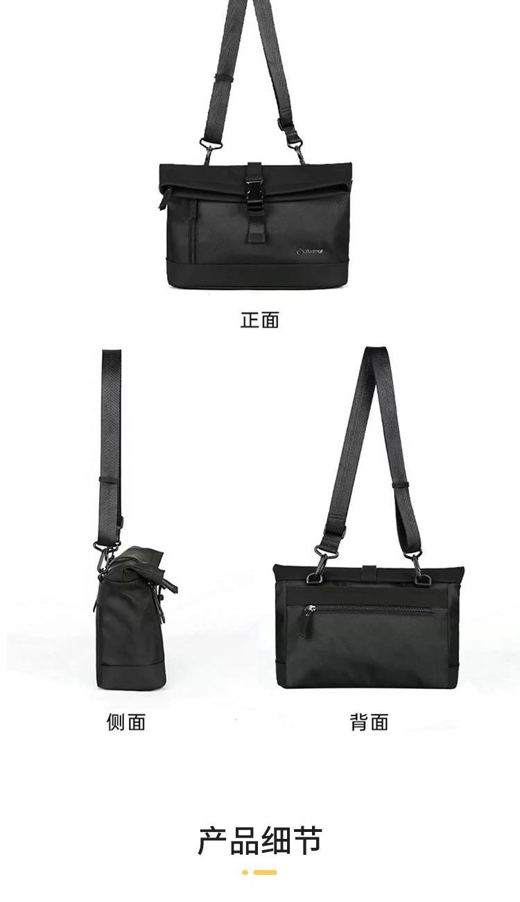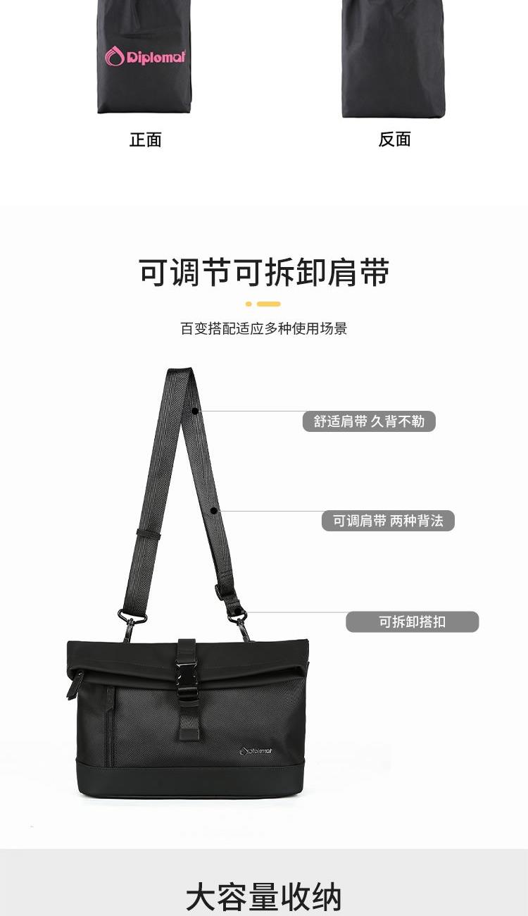 产品材质:织物料+合成材料 产品颜色:黑色 外观尺寸:300*130*220mm 1、卷盖设计,灵活扩容,轻松置物 2、高密度PU+优质面料,防泼耐磨,无惧风雨 3、顶部大开口,直通主仓,秒速存取 4、拉链金属卡扣设计,防止物品倒出 5、前置小物仓,背部隐形收纳仓,手机证件随取随用
