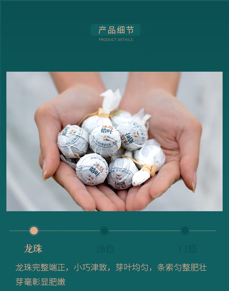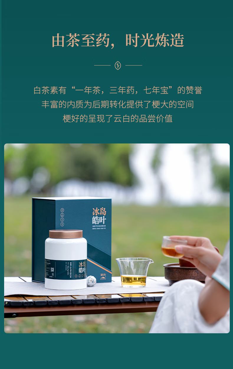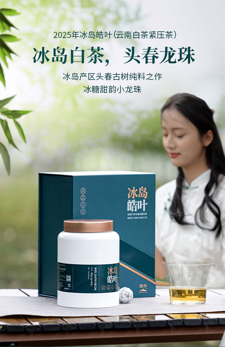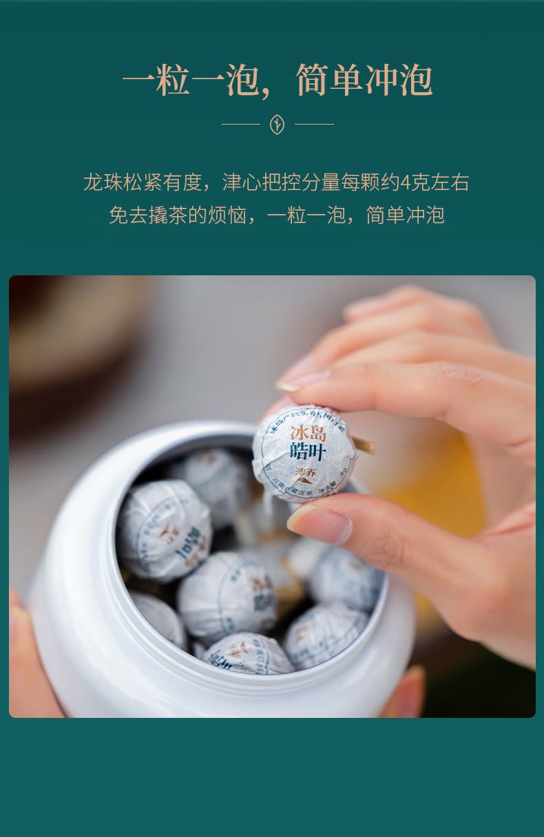 2025年冰岛皓叶(云南白茶紧压茶)180克。甄选津乔勐库镇西半山冰岛产区佰年树龄段纯料古茶树原料。每年清明前后黄金采摘期。采用传统的自然萎凋工艺制成。“芽叶搭配”是云南白茶蕞佳选材标准。这样制成的茶滋味甘甜鲜爽、汤醇韵足。简约大气礼盒+马口铁罐细腻打造,美观实用兼具内獨立单颗绵纸包装,干净卫生,锁住茶香便携方便。龙珠松紧有度,津心把控分量每颗约4克左右免去撬茶的烦恼,一粒一泡,简单冲泡
