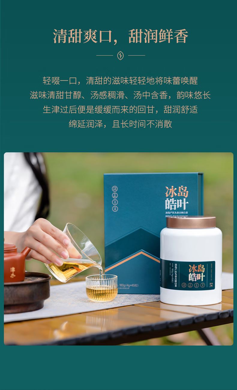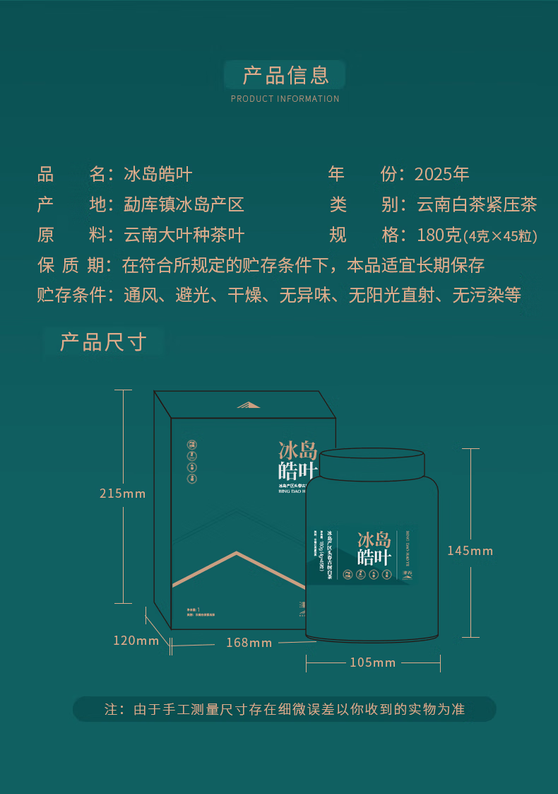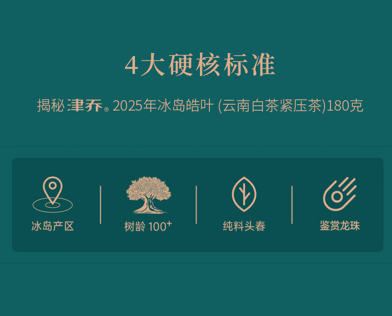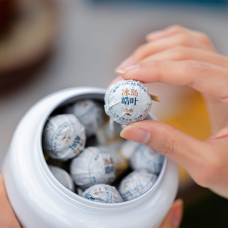 2025年冰岛皓叶(云南白茶紧压茶)180克。甄选津乔勐库镇西半山冰岛产区佰年树龄段纯料古茶树原料。每年清明前后黄金采摘期。采用传统的自然萎凋工艺制成。“芽叶搭配”是云南白茶蕞佳选材标准。这样制成的茶滋味甘甜鲜爽、汤醇韵足。简约大气礼盒+马口铁罐细腻打造,美观实用兼具内獨立单颗绵纸包装,干净卫生,锁住茶香便携方便。龙珠松紧有度,津心把控分量每颗约4克左右免去撬茶的烦恼,一粒一泡,简单冲泡