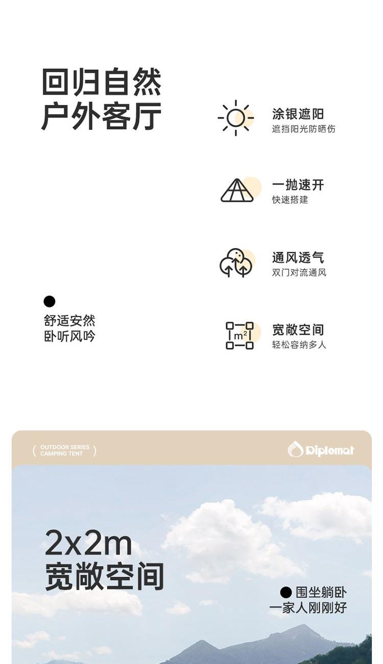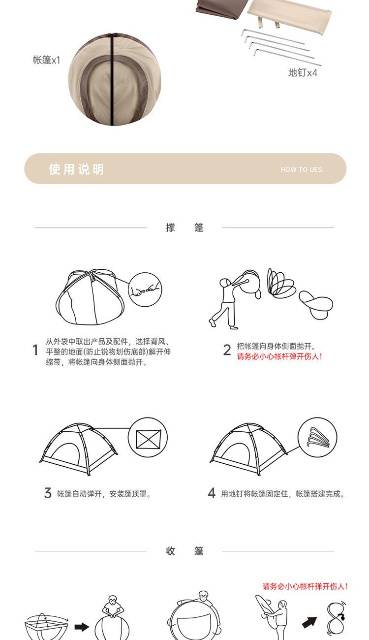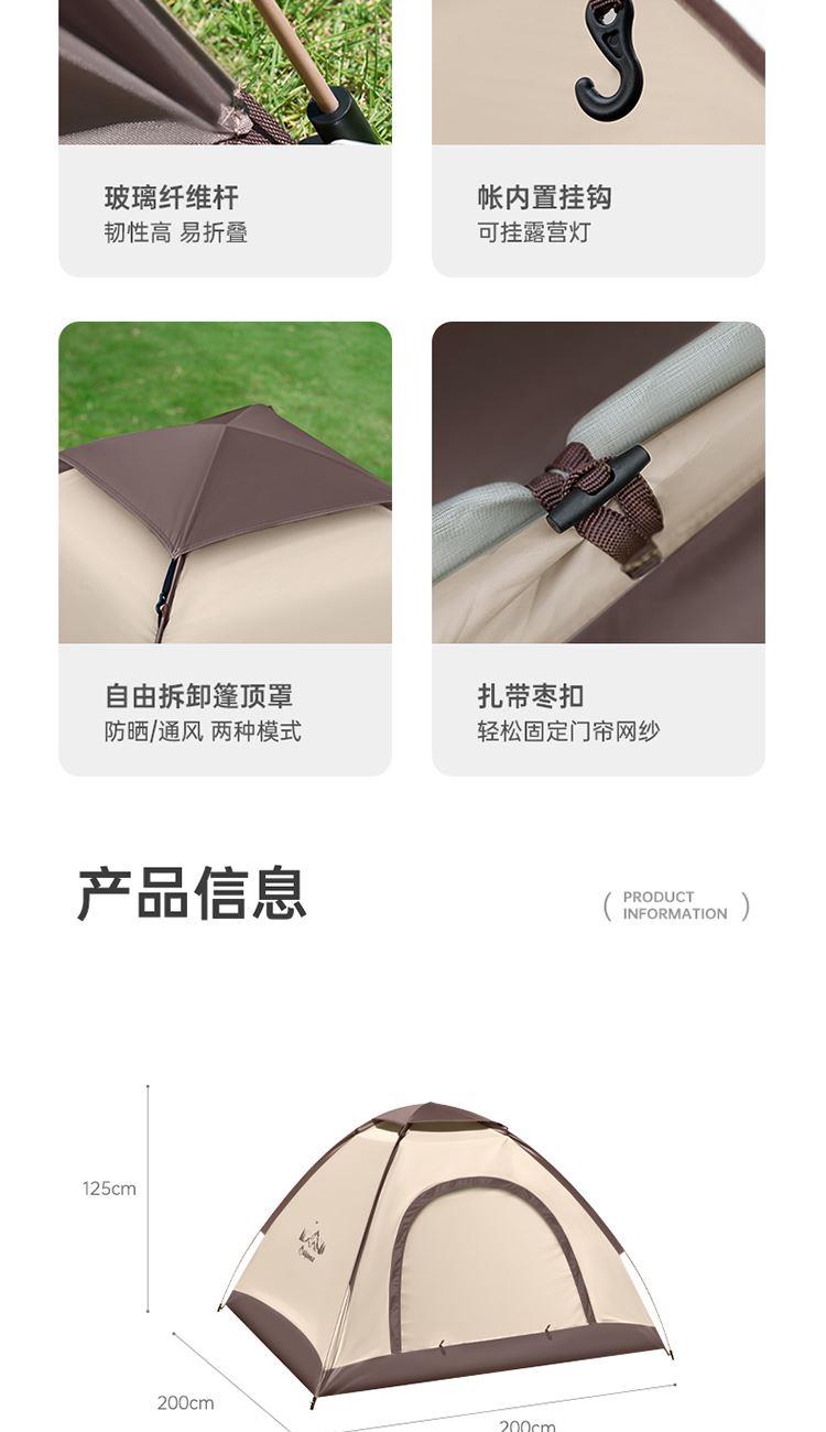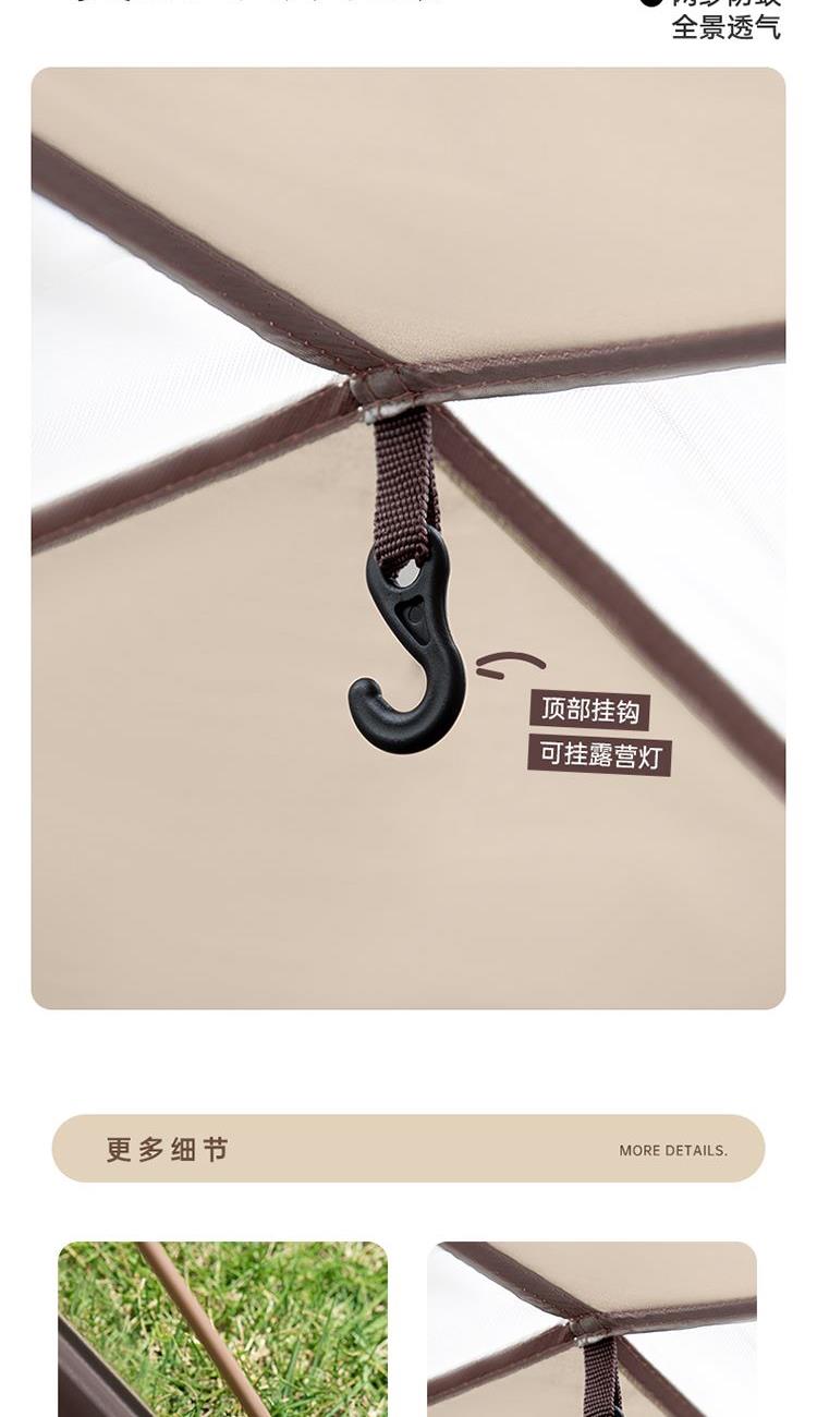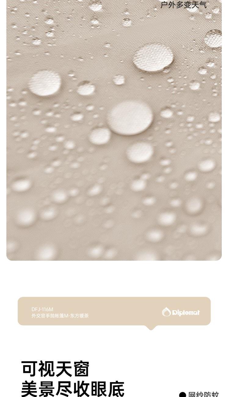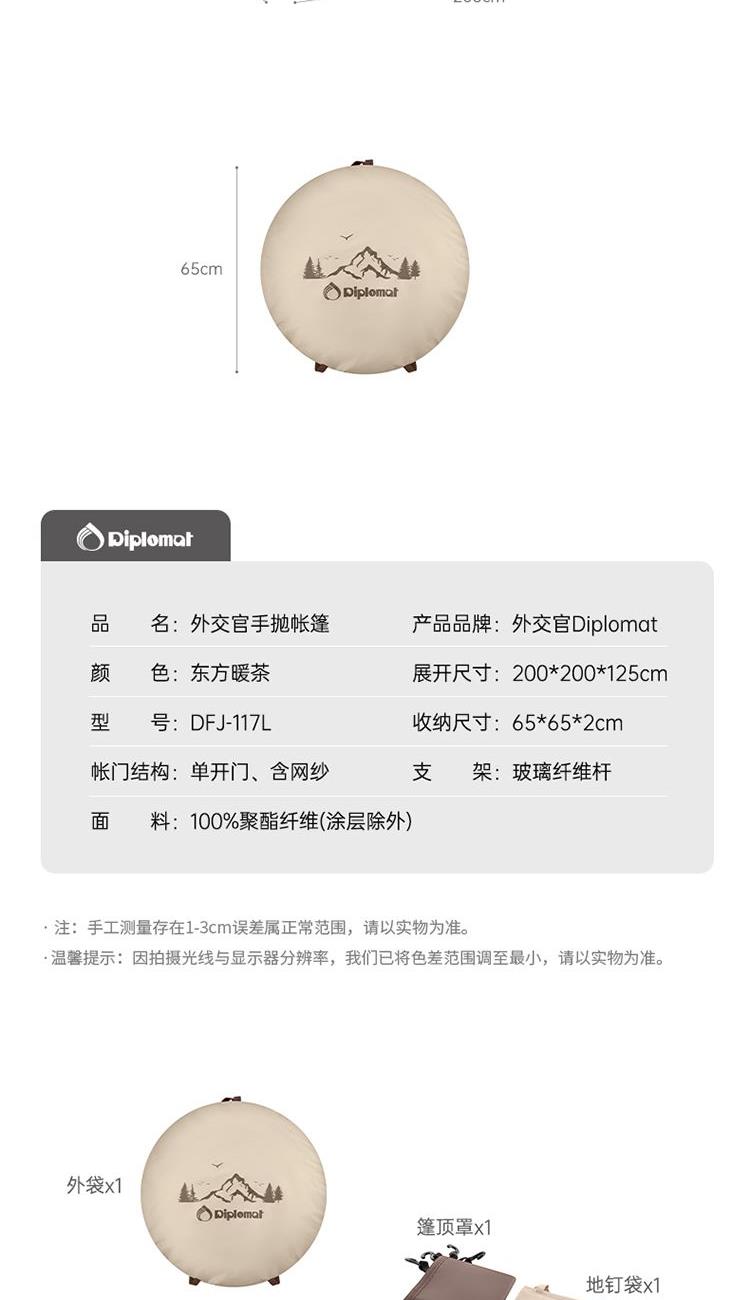 产品尺寸:200x200x120cm 收纳尺寸:65x65x2cm 产品材质:聚酯纤维(涂层除外)+玻璃纤维杆 产品颜色:东方暖茶 产品包装:双肩收纳布袋 1、双开门附纱网,网纱天窗,通风对流循环。 2、一秒速开,便捷压缩折叠,收纳无感。 3、帐面及底帐防泼水,银胶防晒。 4、双肩收纳袋,携带方便。