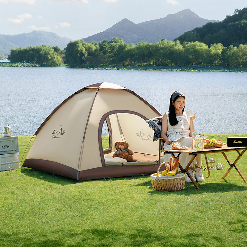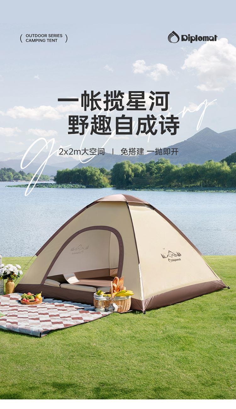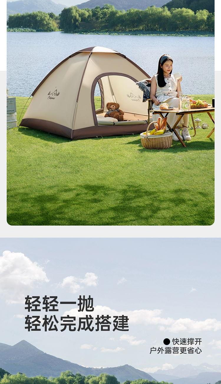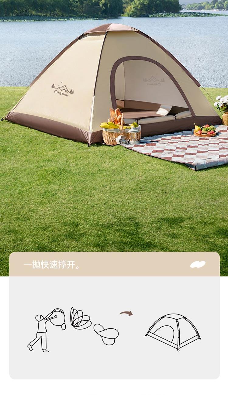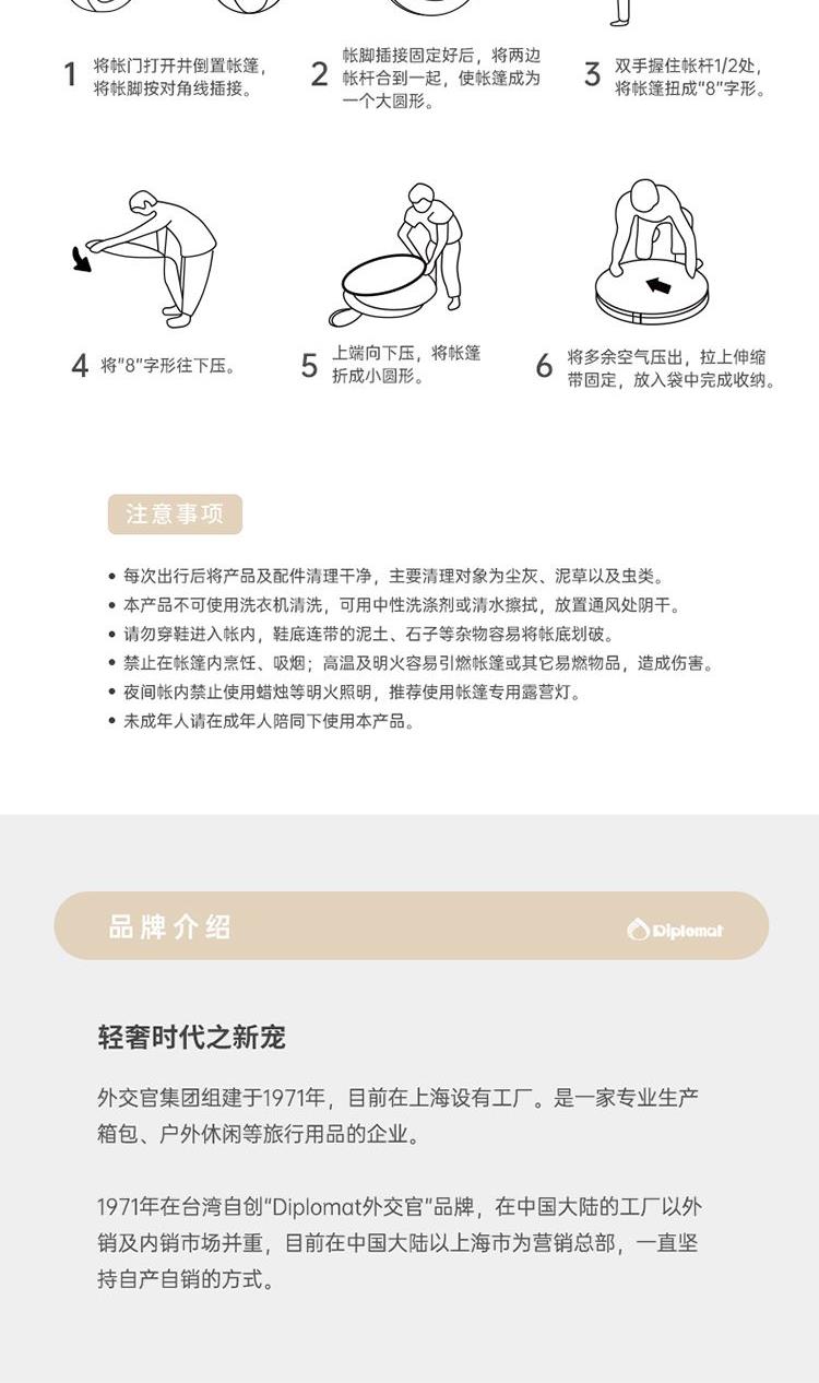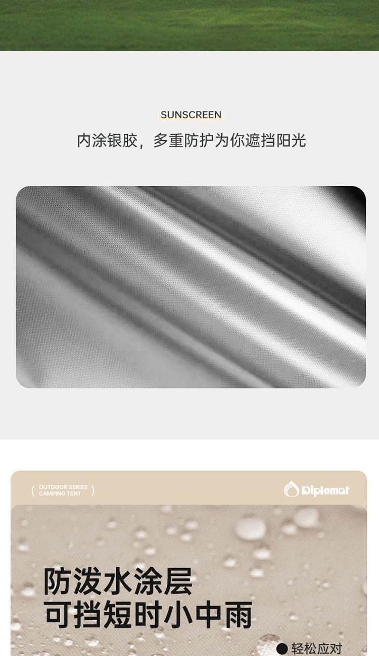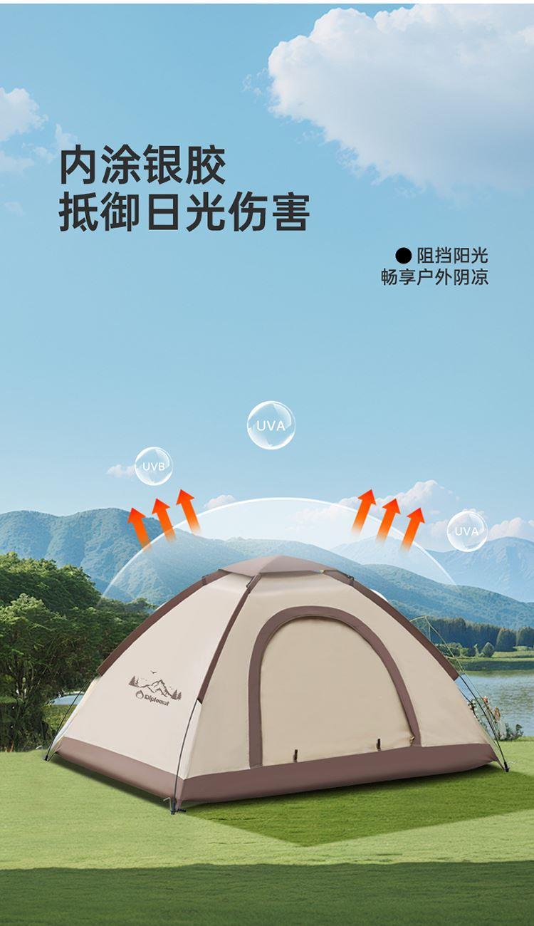 产品尺寸:200x200x120cm 收纳尺寸:65x65x2cm 产品材质:聚酯纤维(涂层除外)+玻璃纤维杆 产品颜色:东方暖茶 产品包装:双肩收纳布袋 1、双开门附纱网,网纱天窗,通风对流循环。 2、一秒速开,便捷压缩折叠,收纳无感。 3、帐面及底帐防泼水,银胶防晒。 4、双肩收纳袋,携带方便。