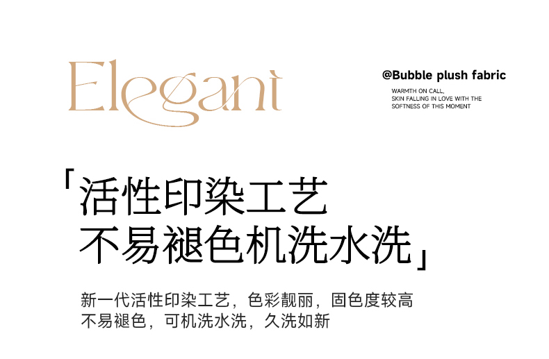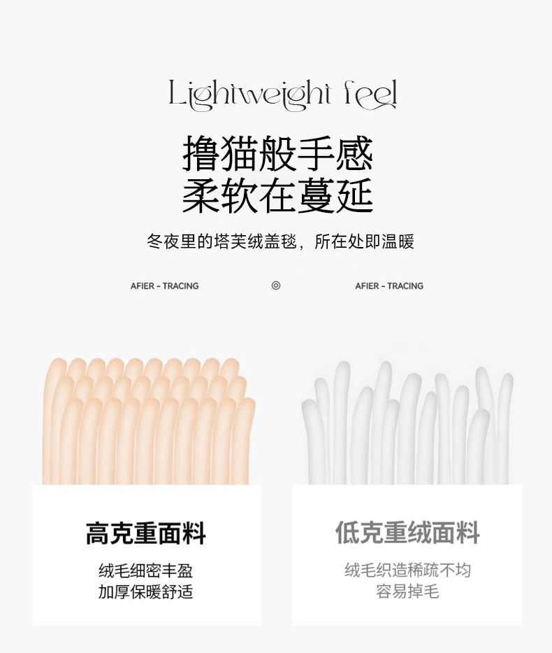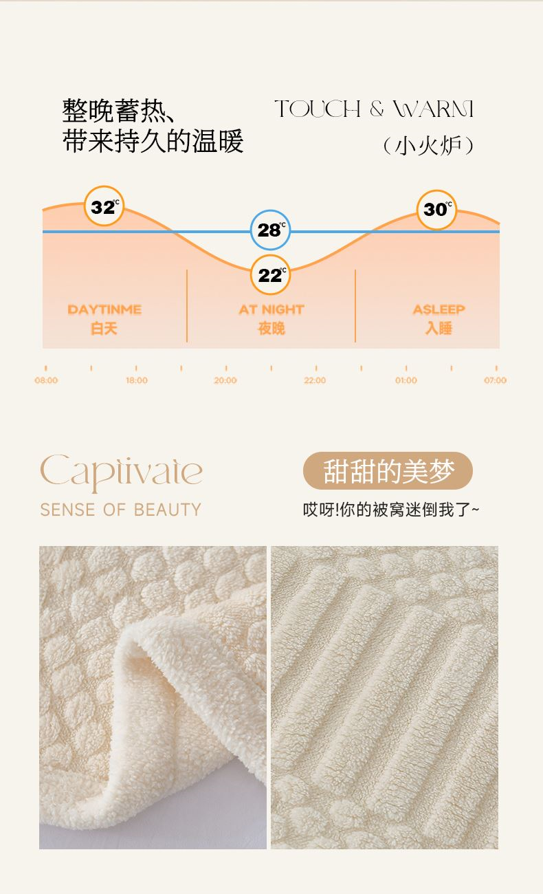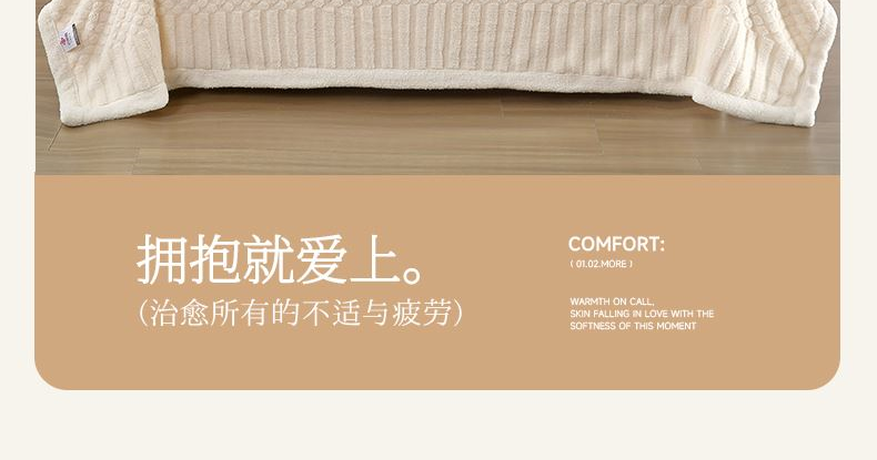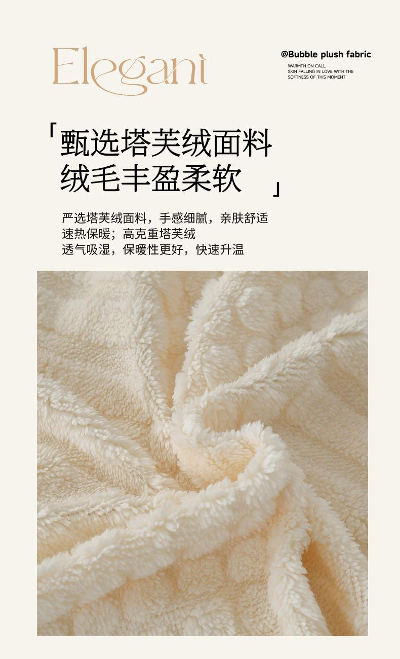 规格:200*220cm 面料:塔芙绒 克重:1800g 执行标准:FZ/T61002-2019 安全类别:GB18401-2010 B类 1.严选塔芙绒面料,手感细腻,亲肤舒适,速热保暖;高克重塔芙绒,透气吸湿,保暖性更好,快速升温;2.内置导电纱,防静电处理,使用更安心;精致的卷工艺,做工精细,针脚细密,不易脱线,牢固耐用。