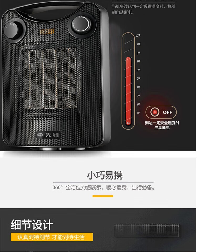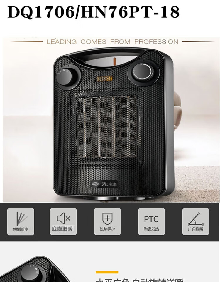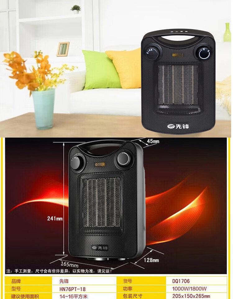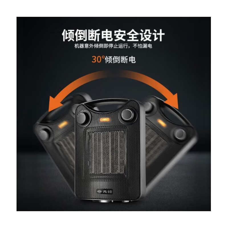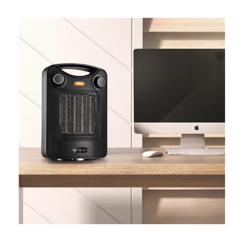 机身小巧,尺寸为 240×128×168mm ,重 1.5kg,外观呈黑色 。 以 PTC 陶瓷为加热元件,加热迅速且高效。额定电压 220V,有两档功率可选,功率达 1800W,能满足不同取暖需求。 温控方式为自动温控,可维持舒适温度。具备倾倒断电功能,保障使用安全。有两种风类,既可供暖,也能提供凉风。 台式摆放,适用于 11 - 20㎡空间,无论是卧室、书房还是办公室,都能快速带来温暖。