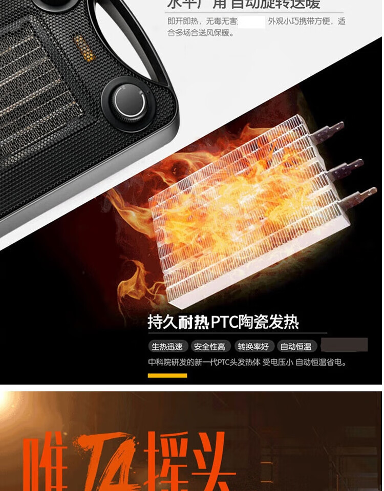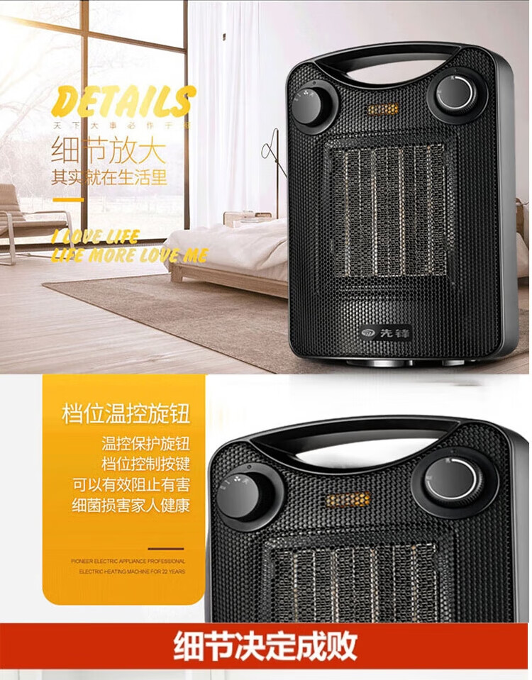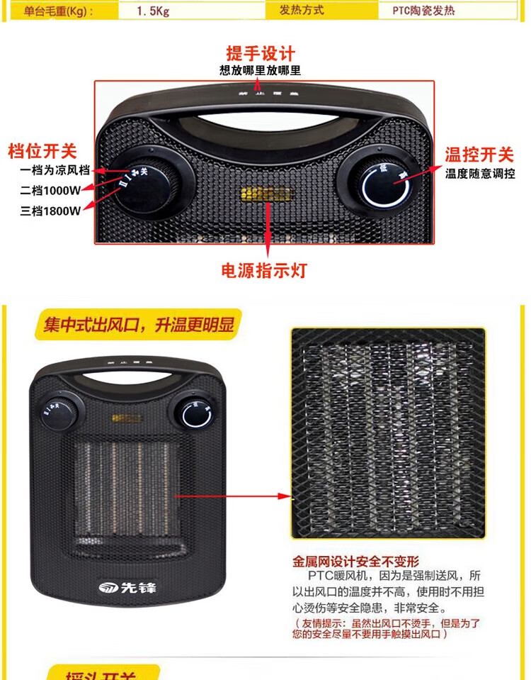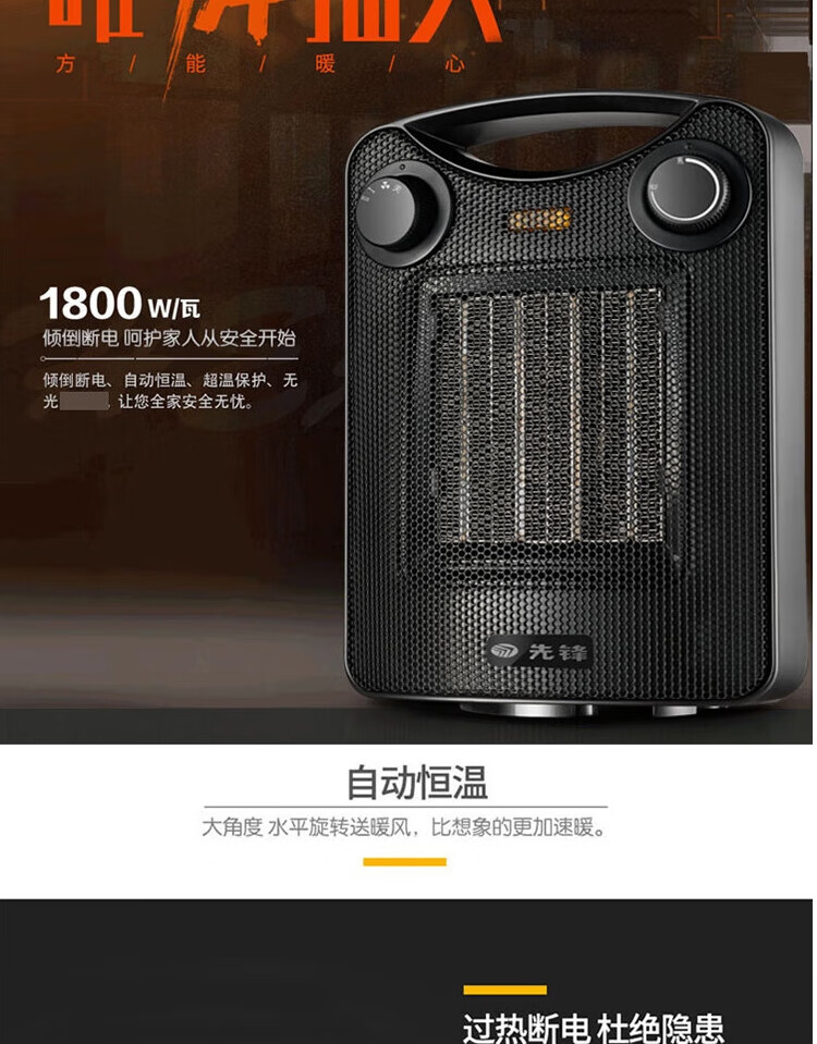 机身小巧,尺寸为 240×128×168mm ,重 1.5kg,外观呈黑色 。 以 PTC 陶瓷为加热元件,加热迅速且高效。额定电压 220V,有两档功率可选,功率达 1800W,能满足不同取暖需求。 温控方式为自动温控,可维持舒适温度。具备倾倒断电功能,保障使用安全。有两种风类,既可供暖,也能提供凉风。 台式摆放,适用于 11 - 20㎡空间,无论是卧室、书房还是办公室,都能快速带来温暖。
