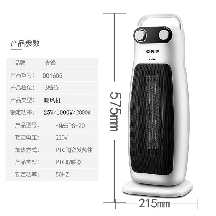 基本参数:产地为中国大陆,颜色为白色,加热方式为陶瓷发热,产品尺寸为 215×215×575 毫米,净重 2.9 千克。
