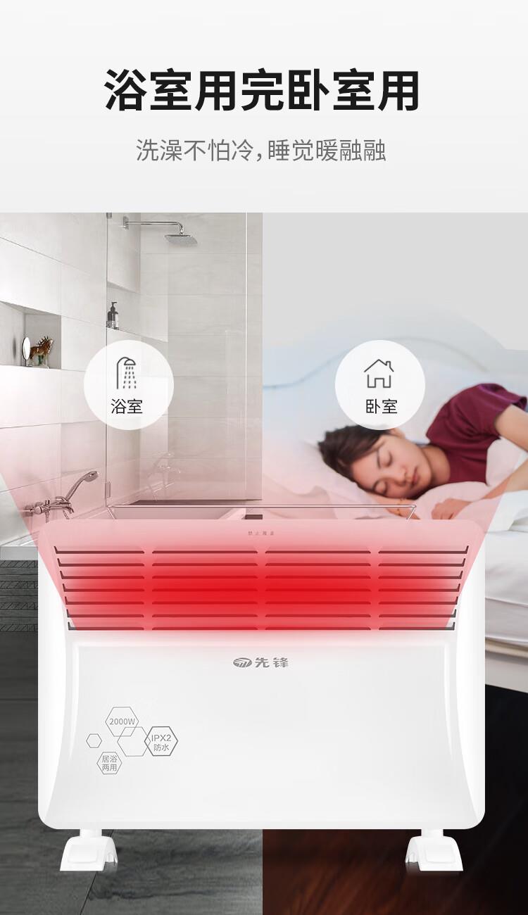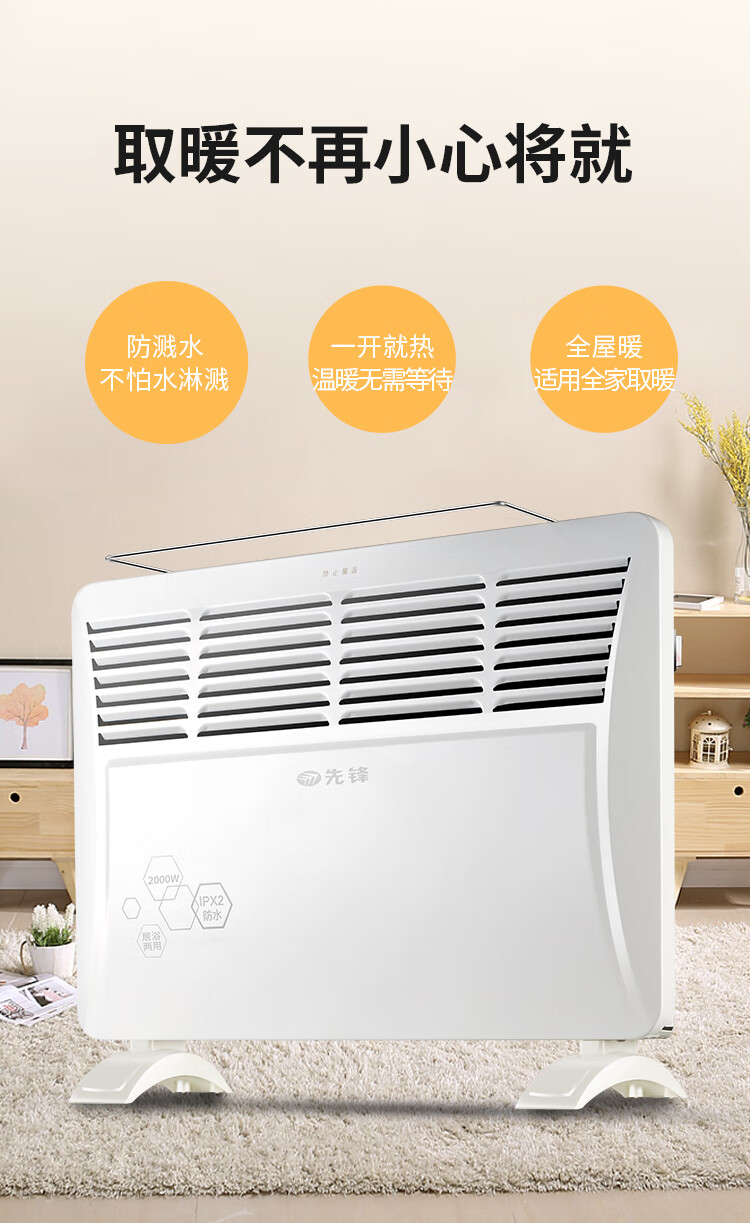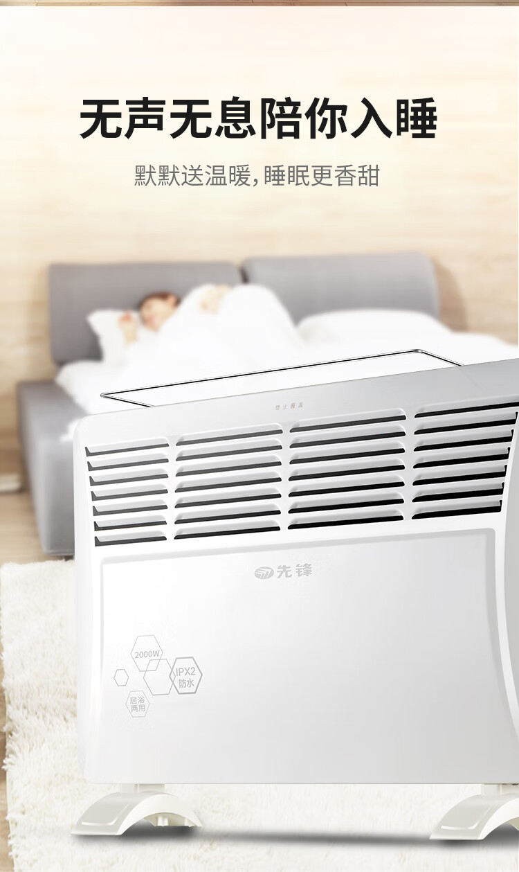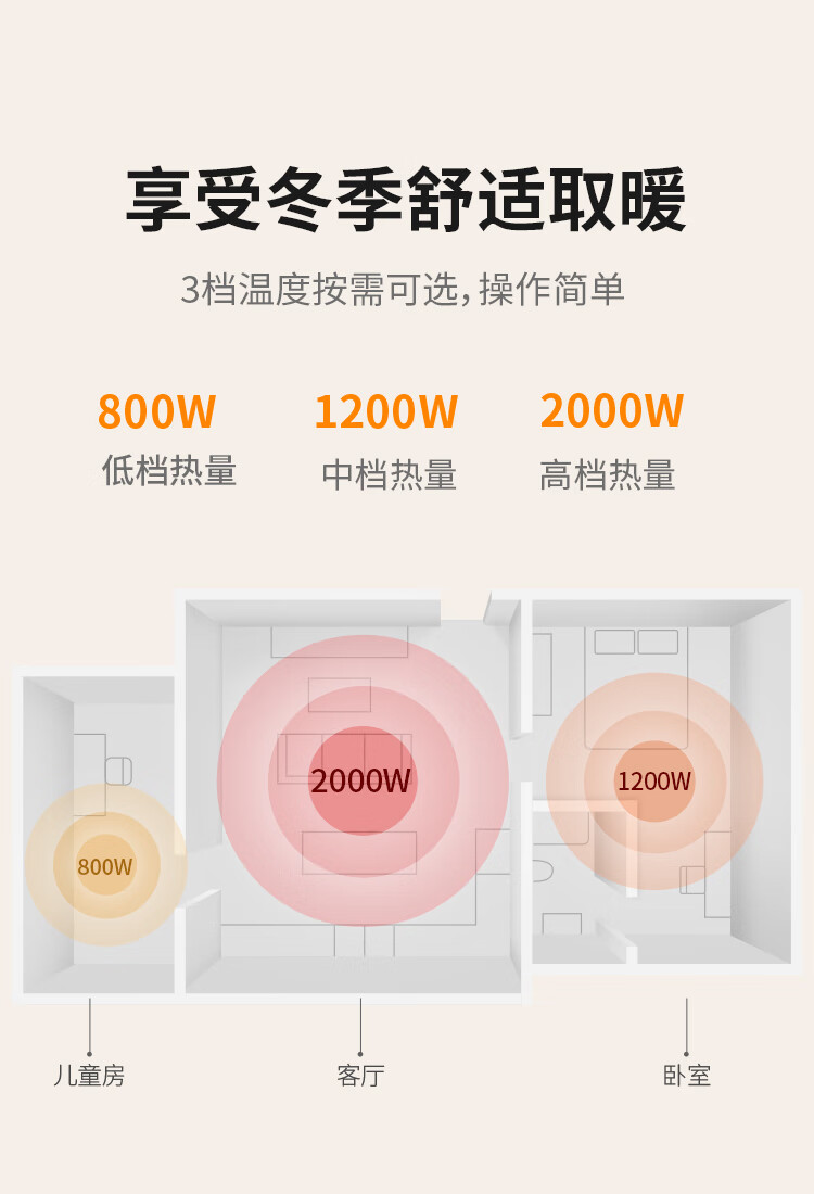 取暖器额定电压 220V,频率 50Hz,有三档功率,分别为 800W、1200W、2000W。控制方式为机械式,具备定时、防水功能,达到 IPX4 防水等级,可居浴两用,还有倾倒断电保护功能,使用安全有保障 。适用面积在 5 - 10㎡,能满足小空间取暖需求,无论是卧室、浴室,都能快速提升室温,带来温暖 。