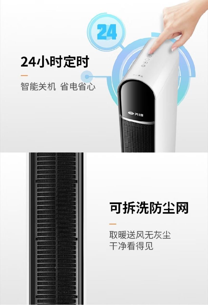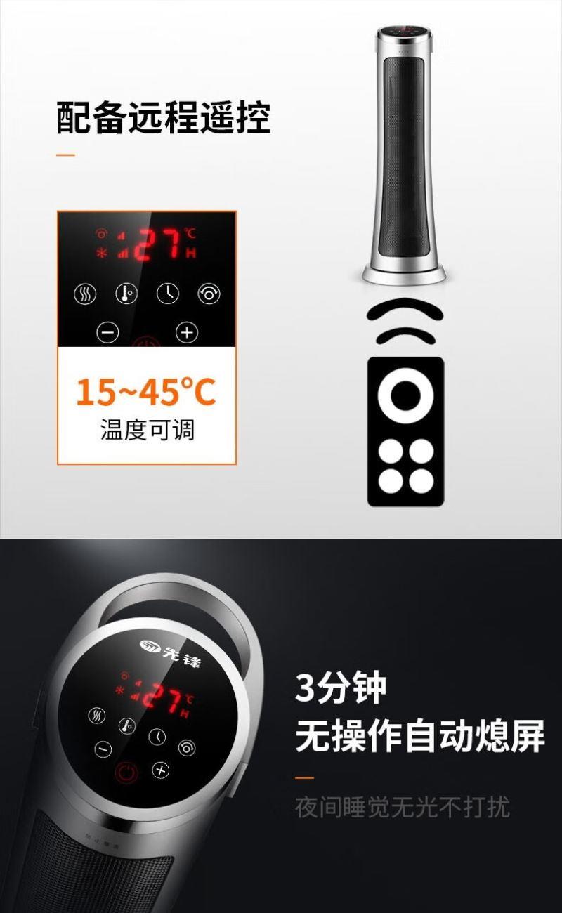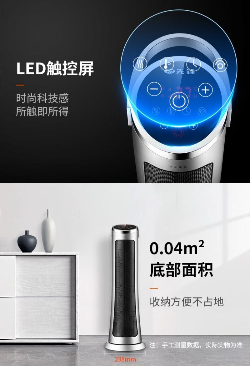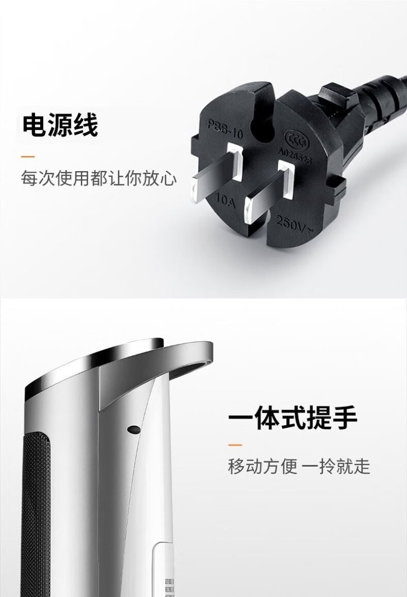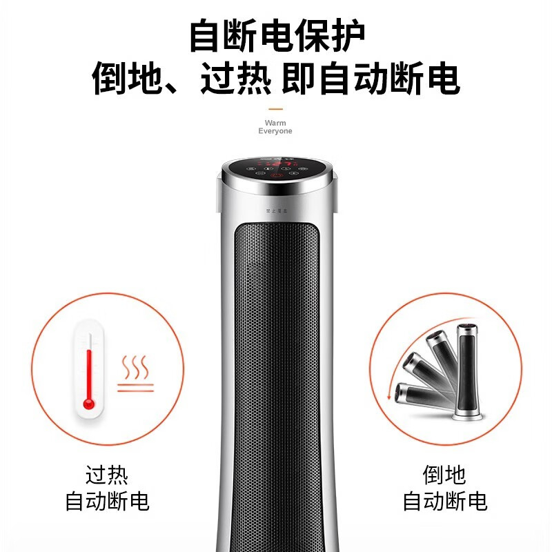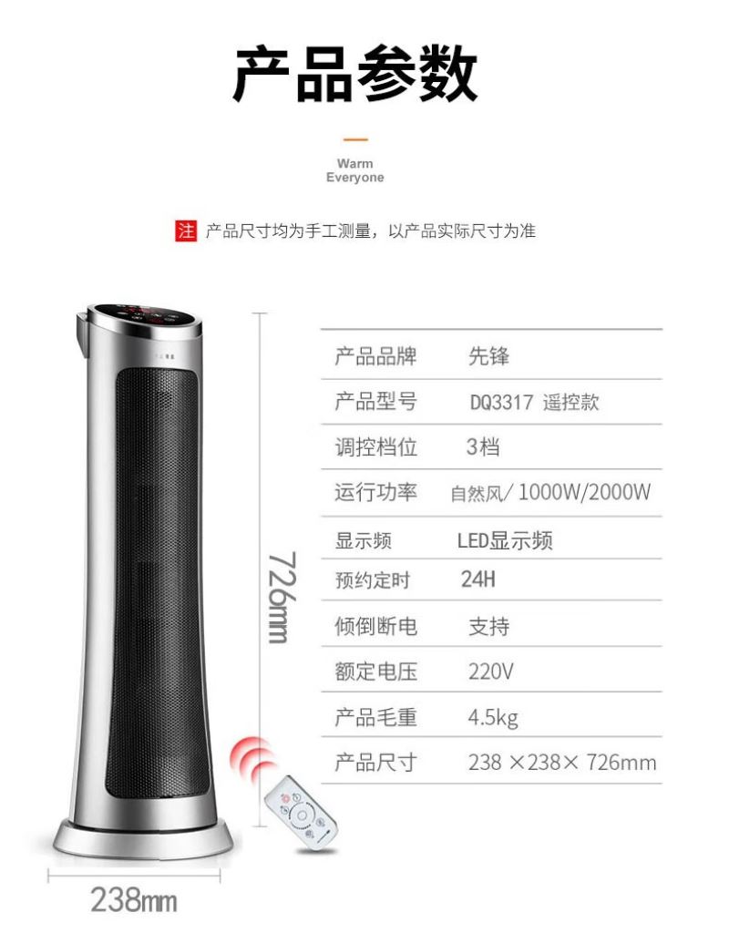 产品特点:外观简约,塔式造型节省空间。采用 PTC 陶瓷加热技术,制热迅速且热量分布均匀。可通过遥控器便捷调节温度和风速,还能设置定时开关机,满足不同场景需求。同时具备过热保护、防干烧保护等,使用安全可靠,且较为节能环保。