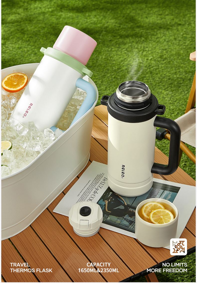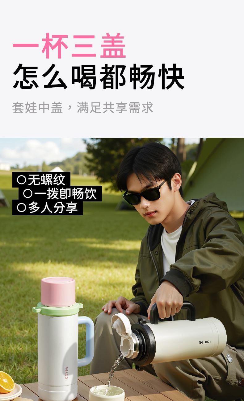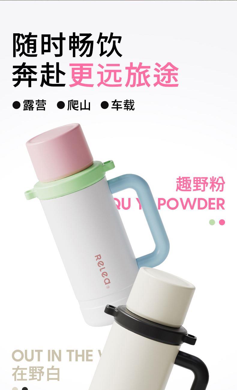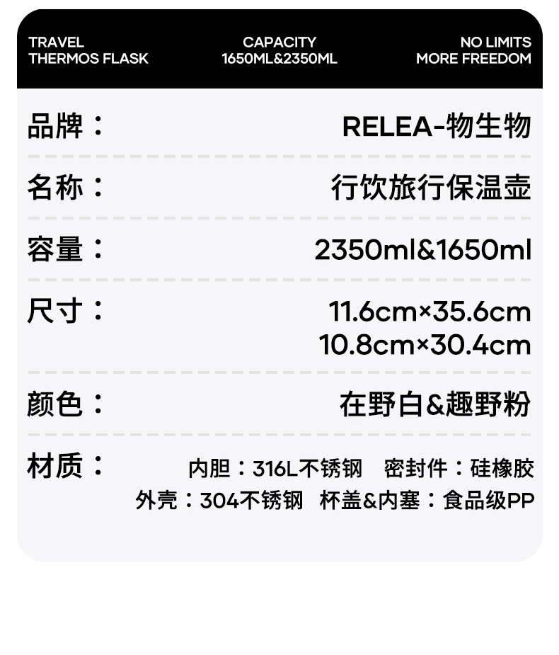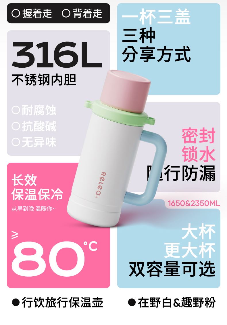 型号:JV022402-2350 颜色:在野白趣野粉 材质:316不锈钢 容量:1650ml/2350ml 此报价为2350ml 1:316L不锈钢内胆,耐腐蚀。抗酸碱,无异味 2:长效保温保冷 3:一杯三盖三种分享方式