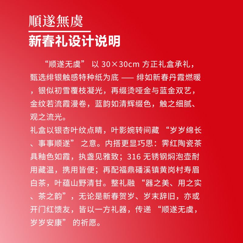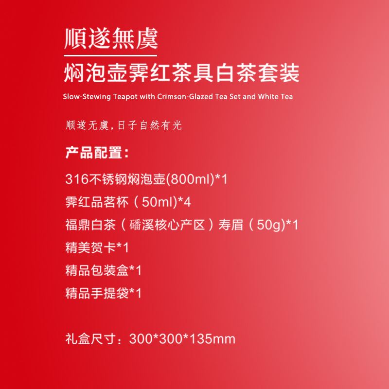 【产品配置】 316不锈钢焖泡壶(800ml)*1 霁红品茗杯(50ml)*4 福鼎白茶(磻溪核心产区)寿眉(50g)*1 精美贺卡*1 精品包装盒*1 精品手提袋*1 【产品卖点】 顺遂无虞寓意,红运新年商务礼赠佳选; 316 不锈钢焖泡壶+霁红品茗杯,茶具品质上乘; 福鼎磻溪核心产区寿眉,白茶口感醇厚; 精美礼盒包装,含手提袋贺卡,档次感足; 集茶具茶叶于一体,商务新年礼赠实用有面。