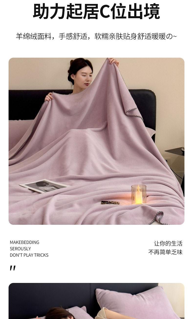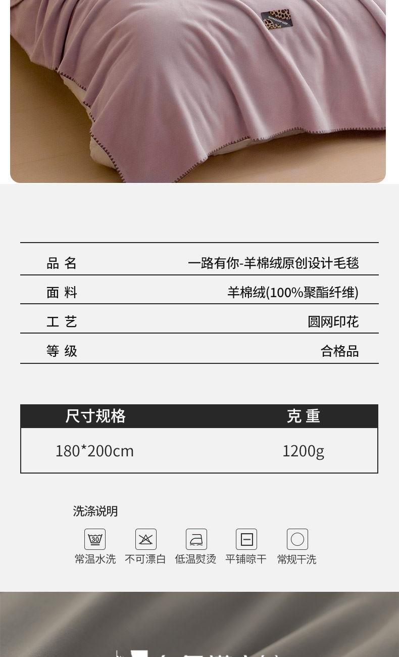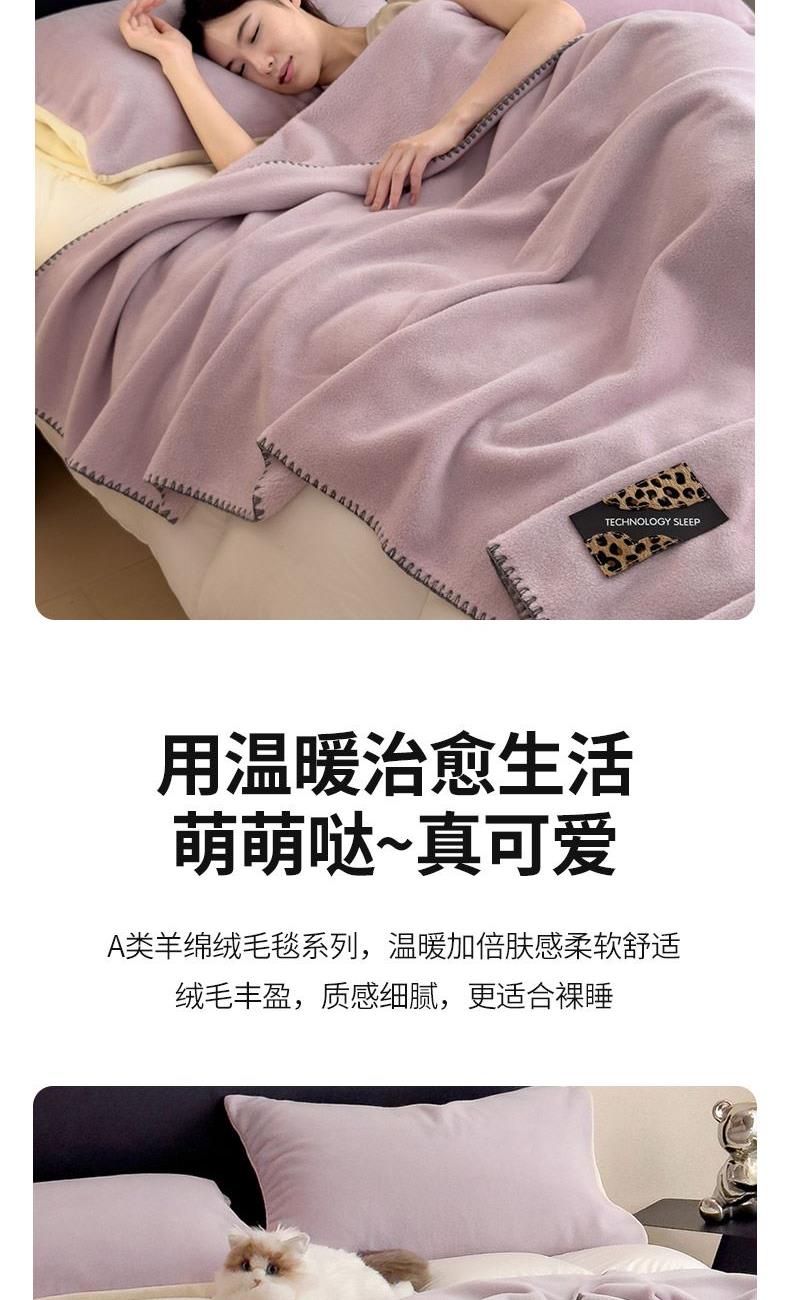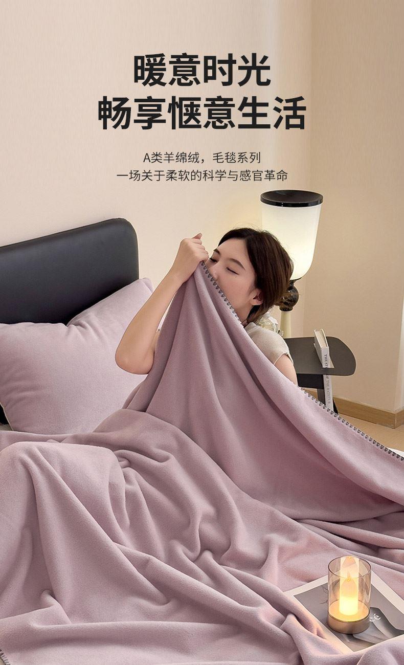 材 质:羊棉绒(聚酯纤维) 尺寸:180*200cm 产品介绍:1.面料采用A类水洗棉.高支高密,柔软亲肤享受高品质 带来的舒适感 2.触感如脂细腻丝滑,不含任何有害物质, 放心接触更安全双面触感,加宽包边设计更美观.