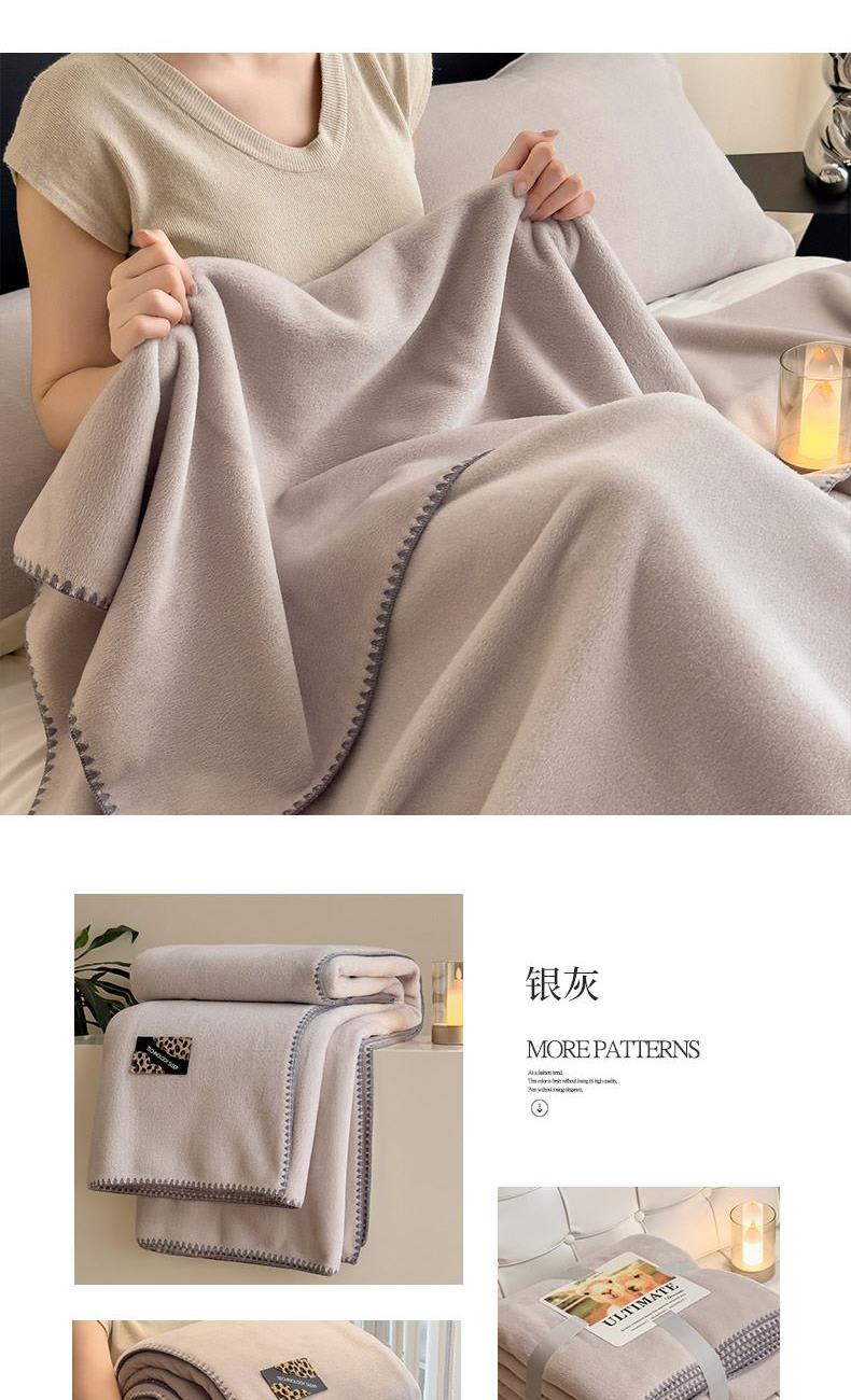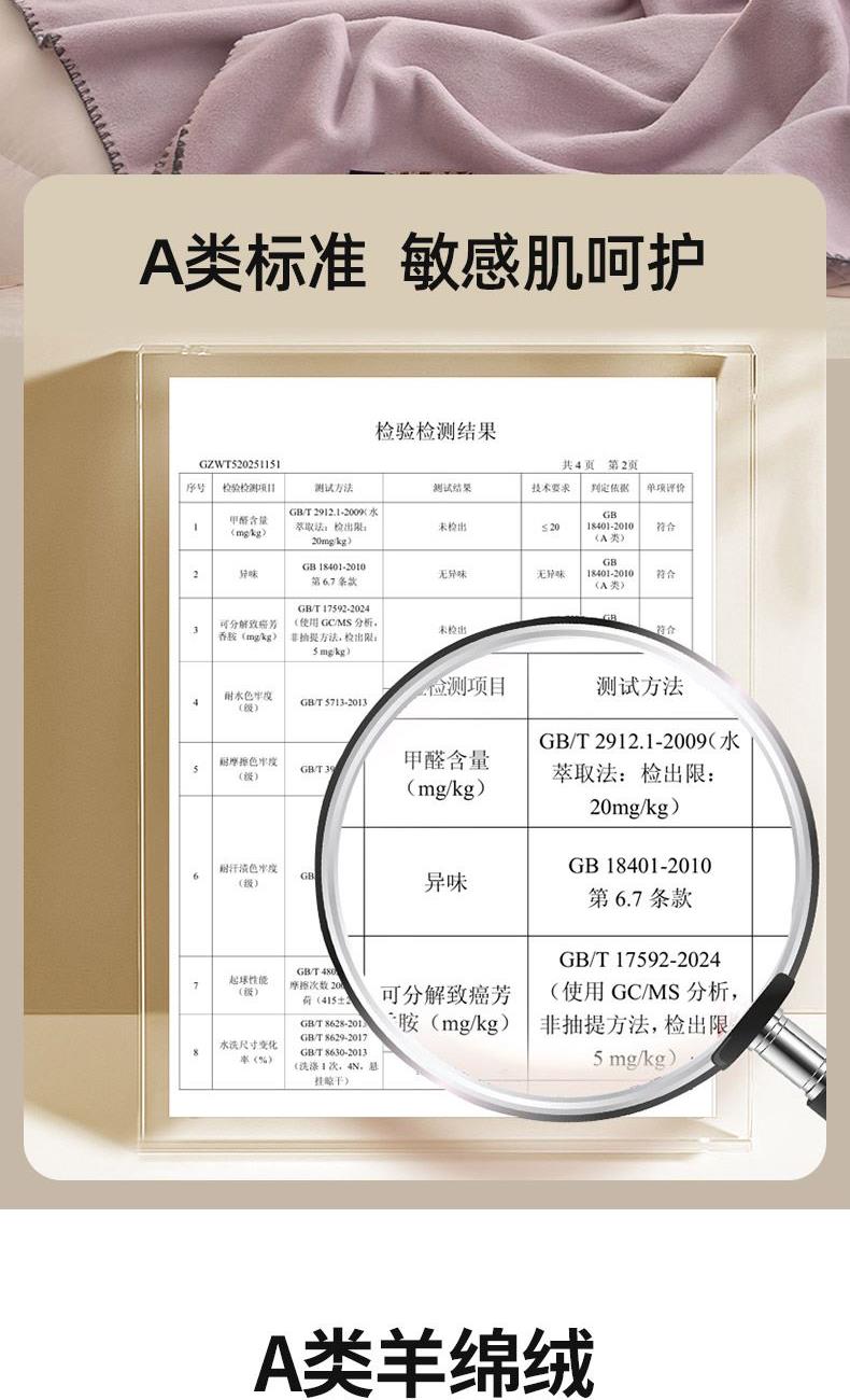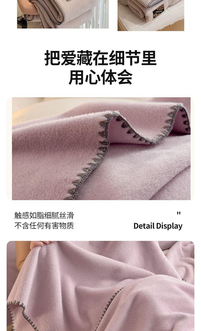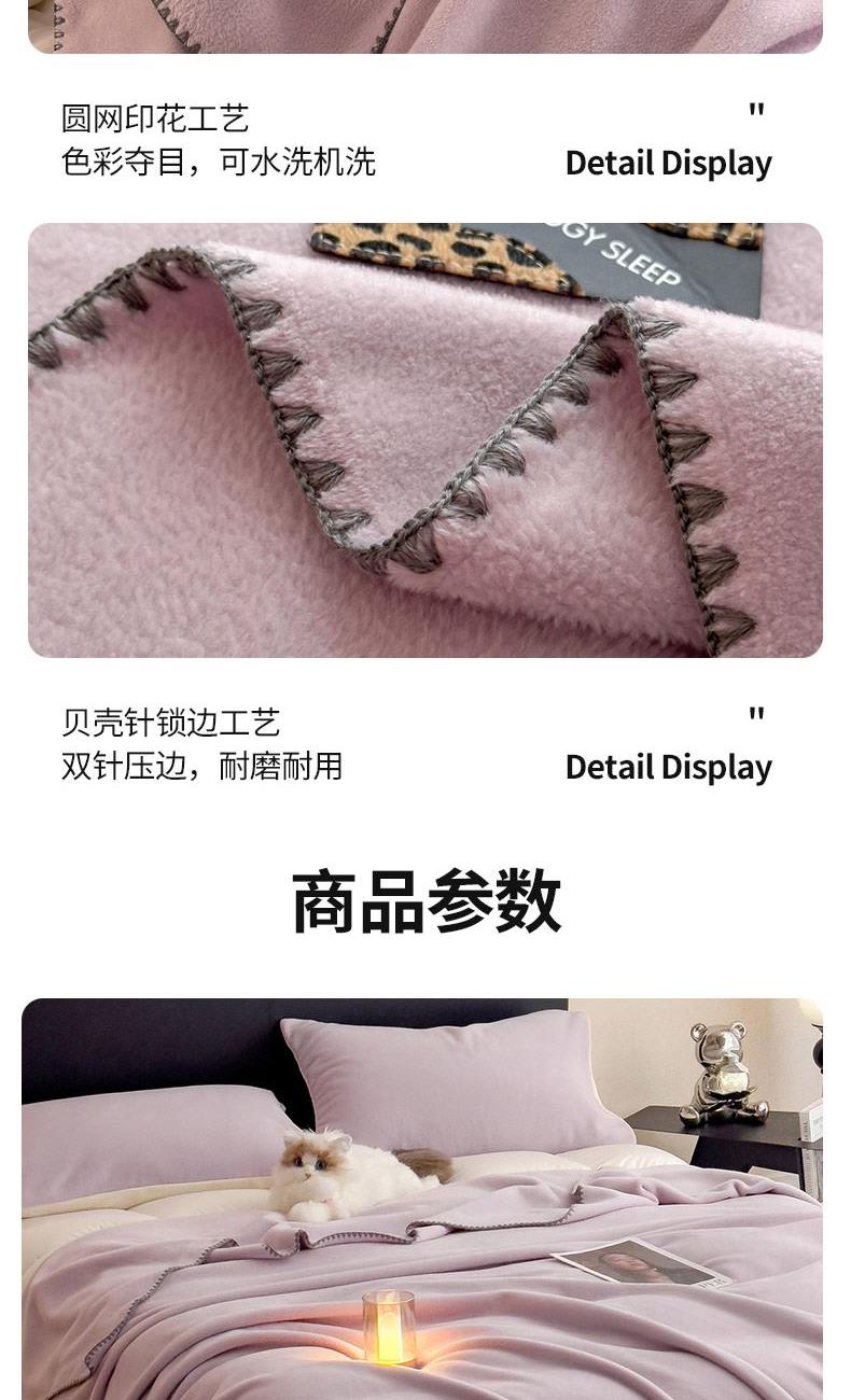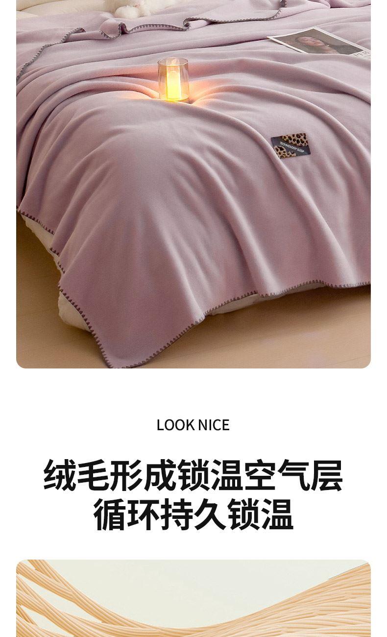 材 质:羊棉绒(聚酯纤维) 尺寸:180*200cm 产品介绍:1.面料采用A类水洗棉.高支高密,柔软亲肤享受高品质 带来的舒适感 2.触感如脂细腻丝滑,不含任何有害物质, 放心接触更安全双面触感,加宽包边设计更美观.