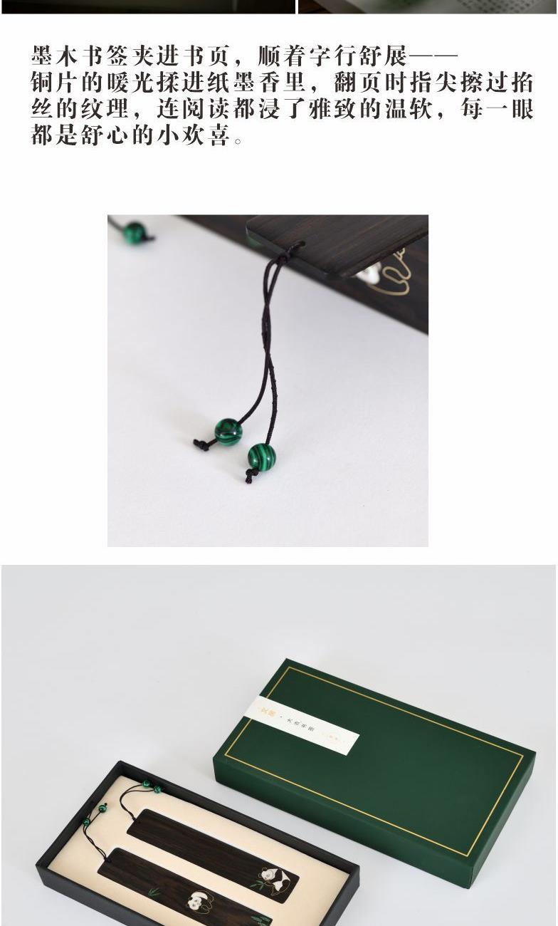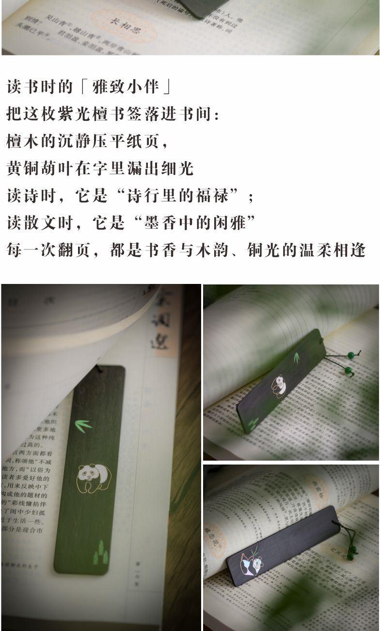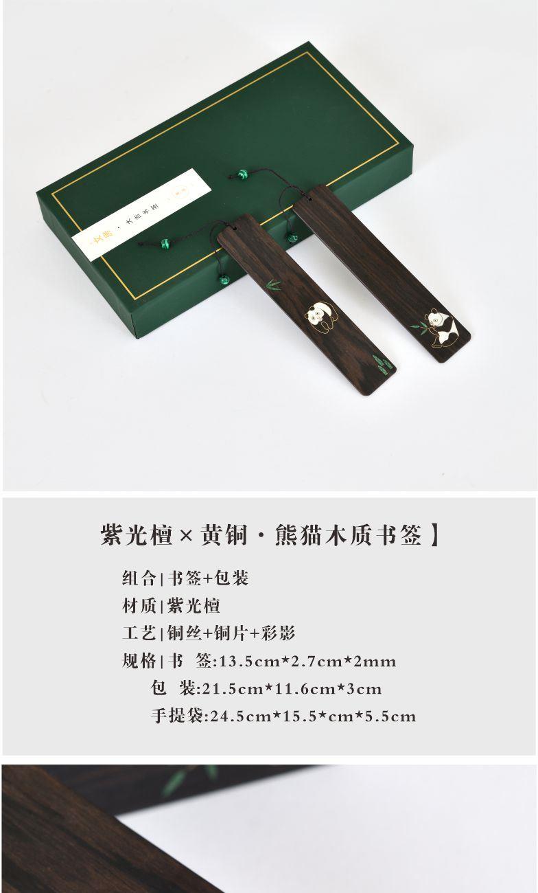 组合|书签+包装 材质|紫光檀 工艺|铜丝+铜片+彩影 规格|书 签:13.5cm*2.7cm*2mm 包 装:21.5cm*11.6cm*3cm 手提袋:24.5cm*15.5*cm*5.5cm