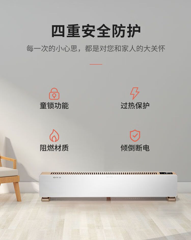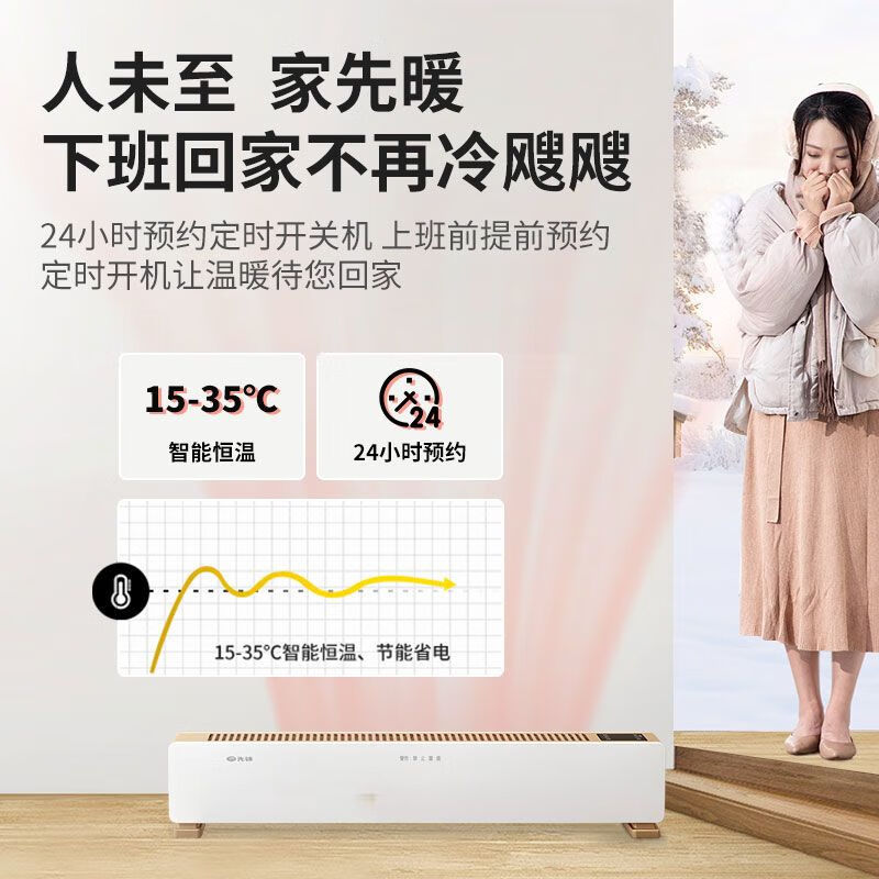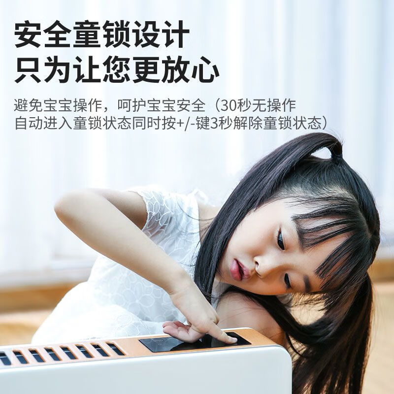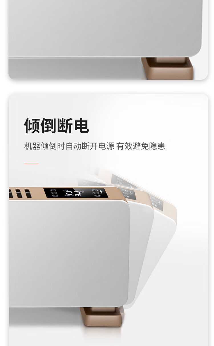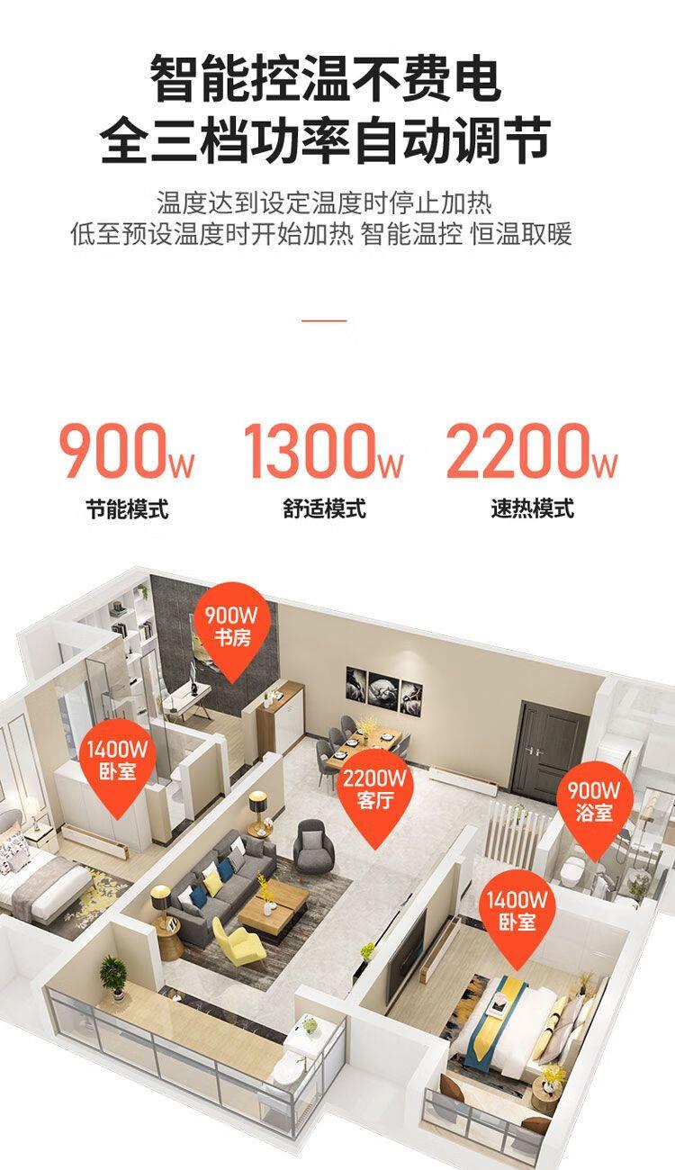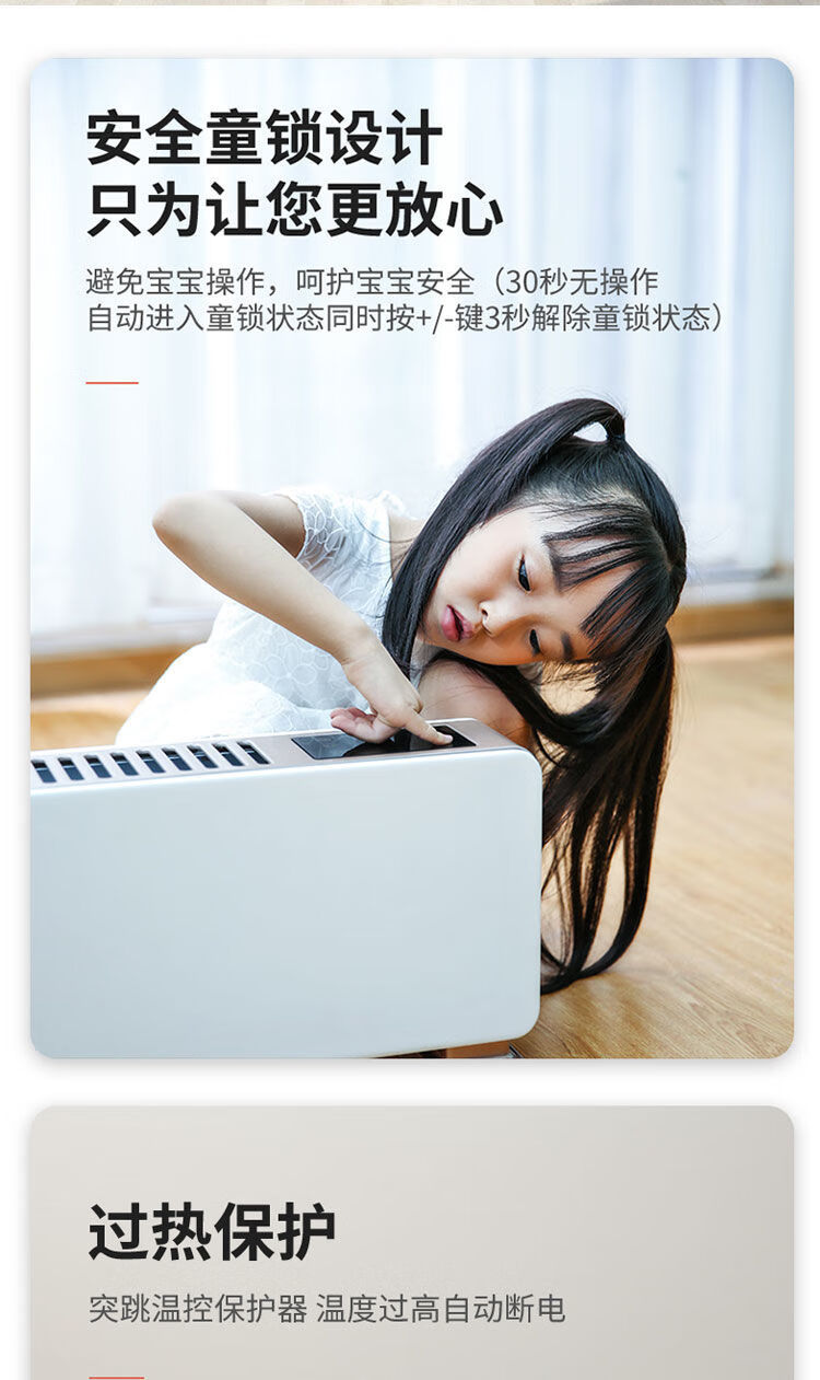 IPX4级防水,居浴两用,360°防溅水 智能温控,恒温取暖(15-35℃度之间任意设定) 顶部人性化触屏操控,操作更方便 24小时定时预约开关机, 远距离遥控(≥6m,左右30°) 无声、无风、不干燥 加大加厚出风口,加快热对流。 石墨烯铝片发热体,热效率更高,寿命更长。 倾倒自动断电,高温断电保护,安全更安心(双突跳自复位温控:120°C/16A/250V) 加厚机身钢板,坚固耐用