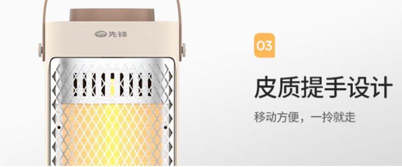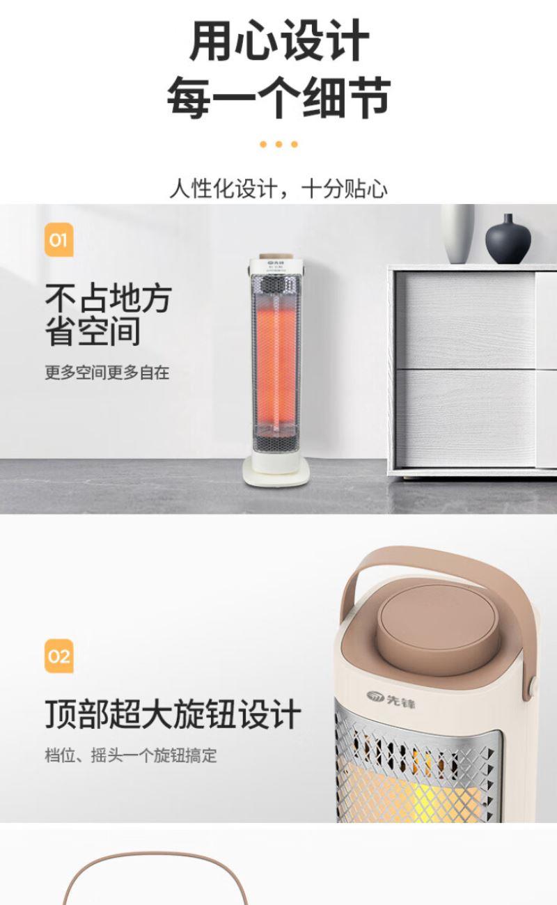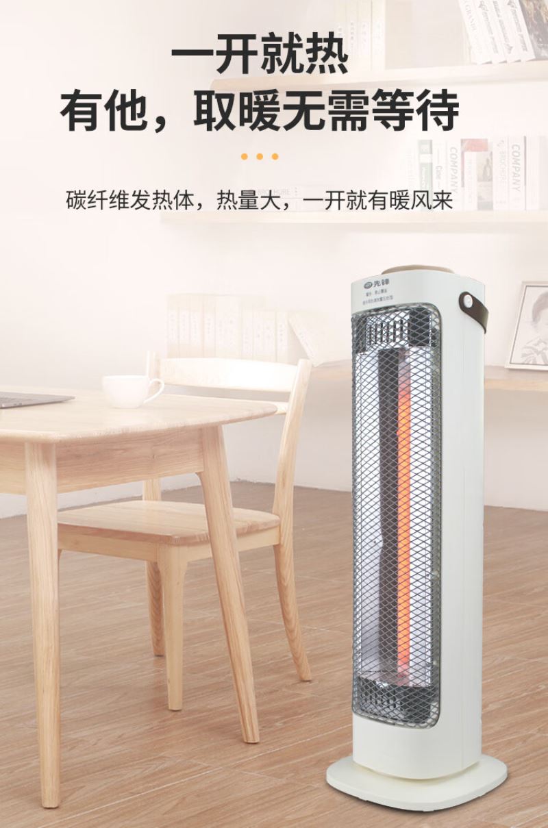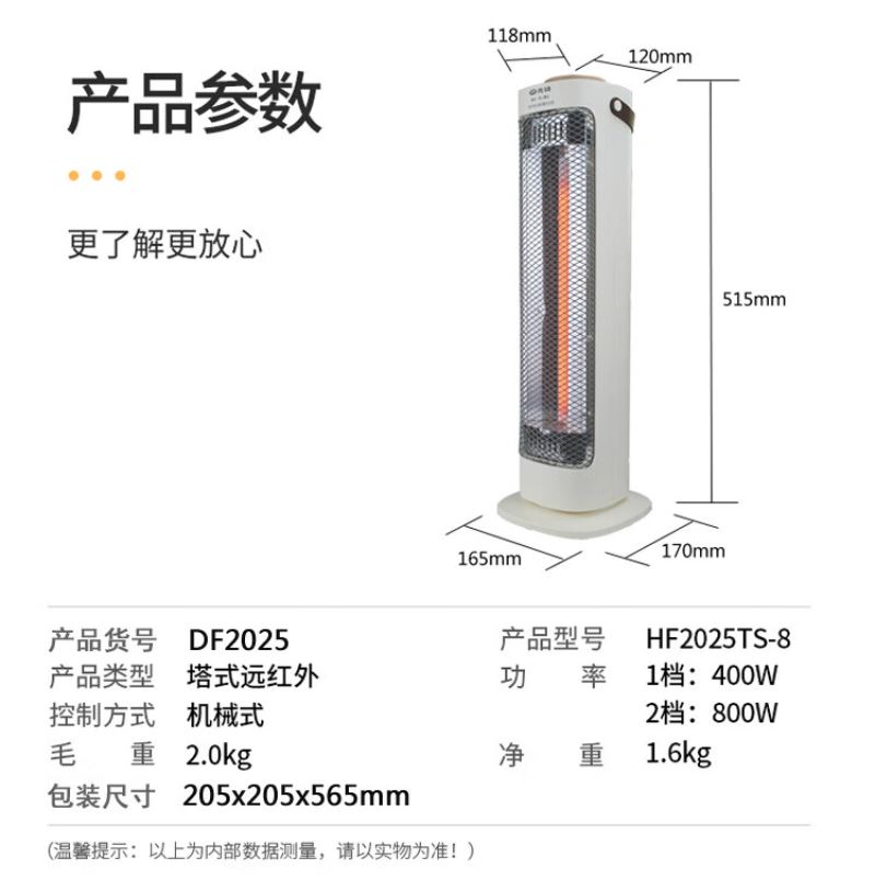 基本参数:产地为中国大陆,颜色白色,加热方式为电热丝发热,摆放方式为落地式,产品尺寸 515mm×170mm×165mm,净重 1.2 千克。 功率参数:额定电压 220V,额定功率 800W,有 400W 等功率档位可选。 功能参数:控制方式为机械式,支持摇头功能,具备倾倒断电保护功能,适用面积为 11-15㎡。 产品特点:采用石英管加热,小巧便携,能快速为局部区域供暖,适合在书桌、沙发旁等位置使用,为用户带来温暖。