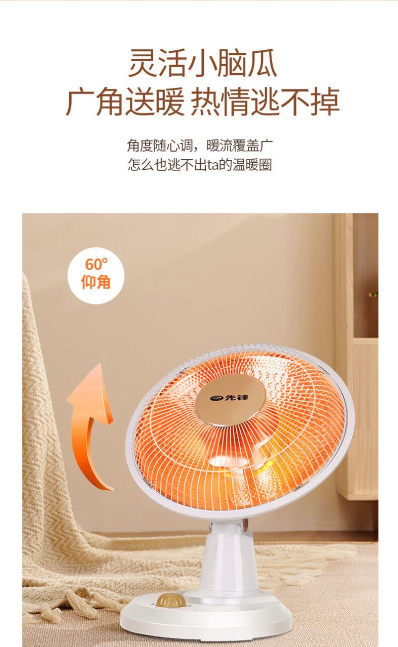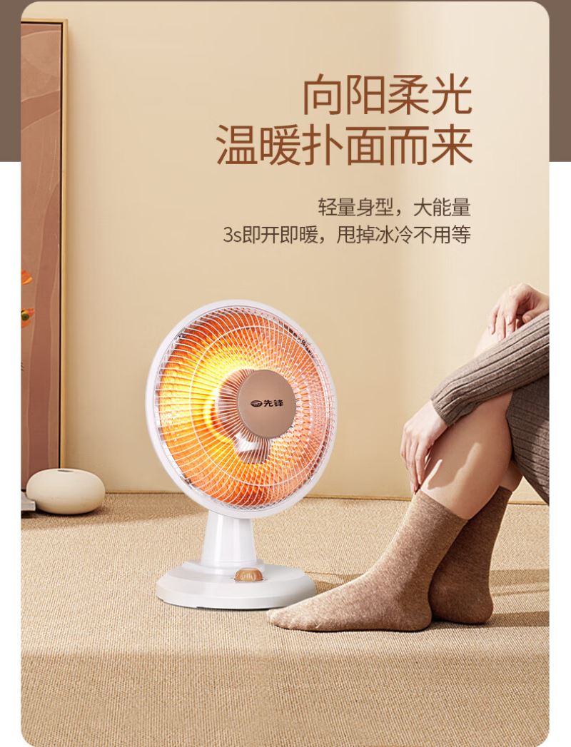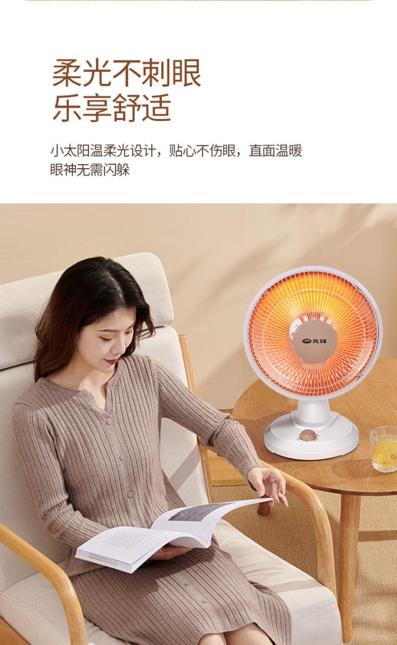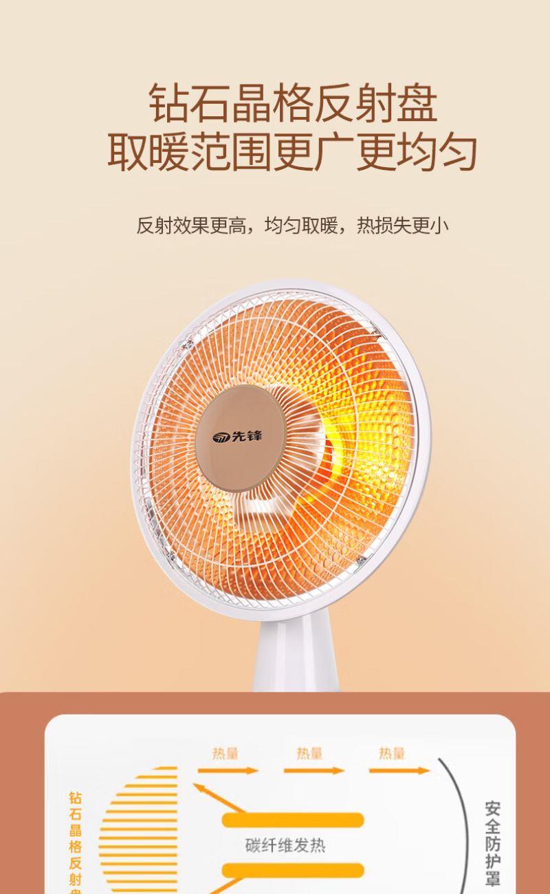 加热方式:通常先锋小太阳采用石英管加热或红外反射式加热,利用石英管发热快的特性,快速提升温度。 功率:可能设有两档功率,功率或在 1500W-2200W 之间,可根据需求选择不同功率档位。 额定电压:一般为 220V/50Hz,符合国内家庭用电标准。 适用面积:参照同系列产品,适用面积在 10㎡以下,适合小空间取暖,如卧室、书房局部区域等。
