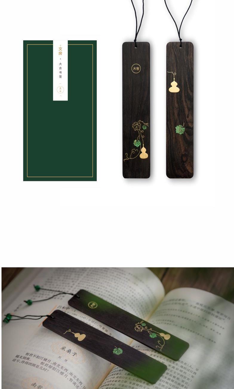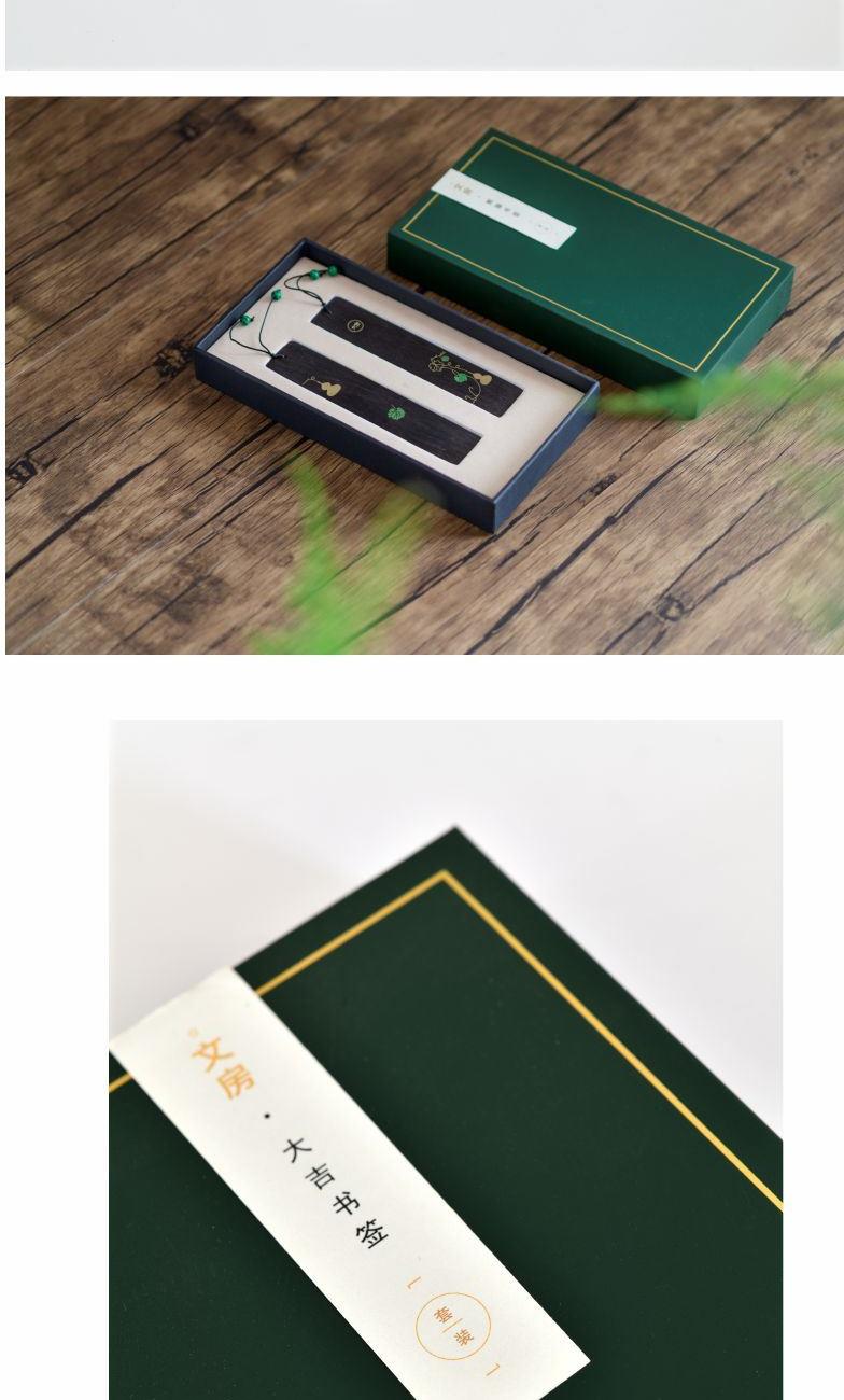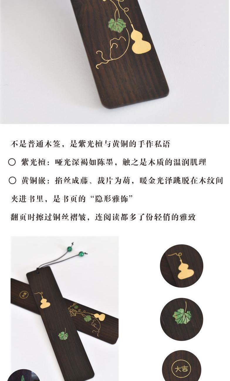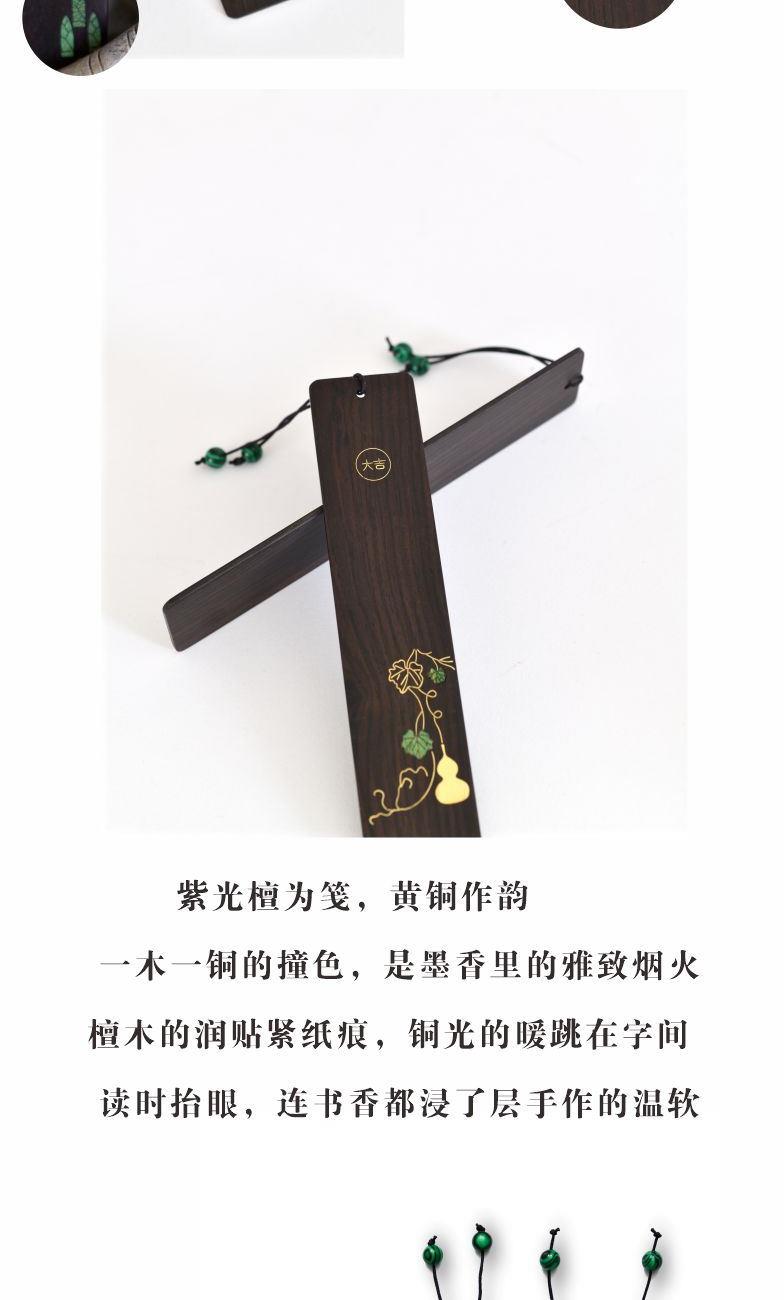 组合|书签+包装 材质|紫光檀 工艺|铜丝+铜片+彩影 规格|书 签:13.5cm*2.7cm*2mm 包 装:21.5cm*11.6cm*3cm 手提袋:24.5cm*15.5*cm*5.5cm