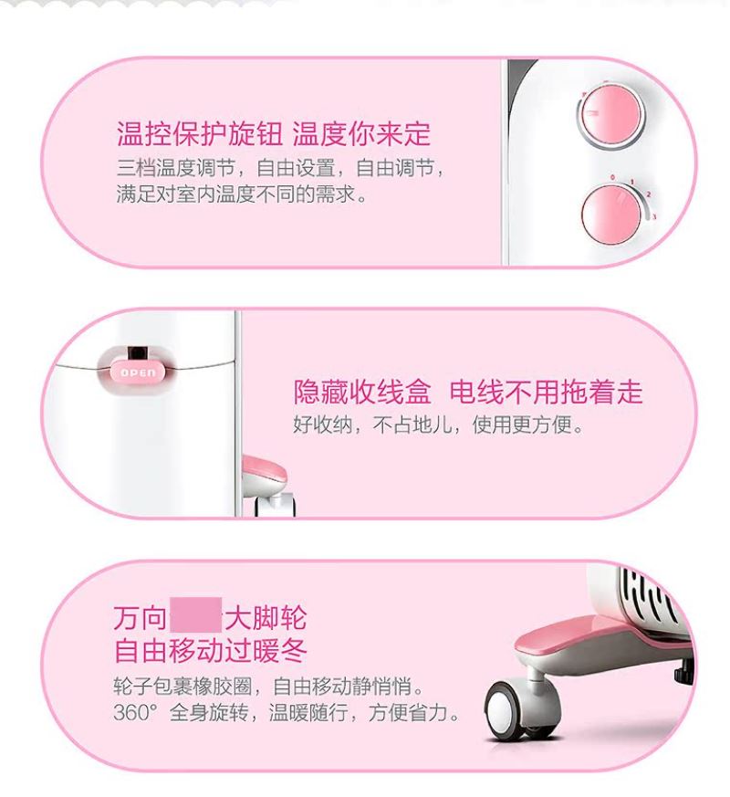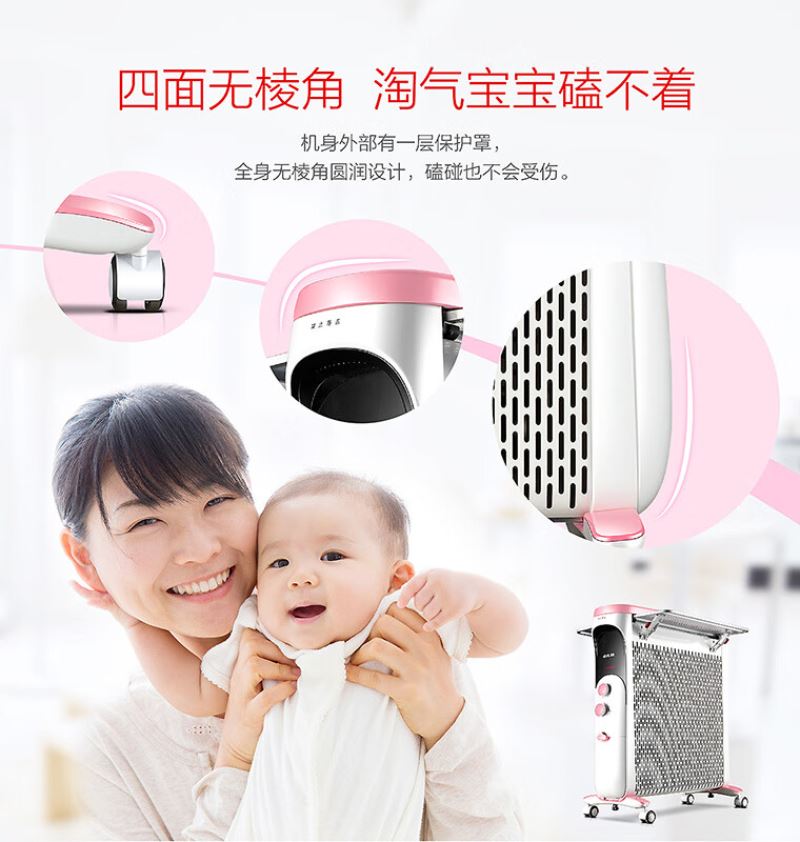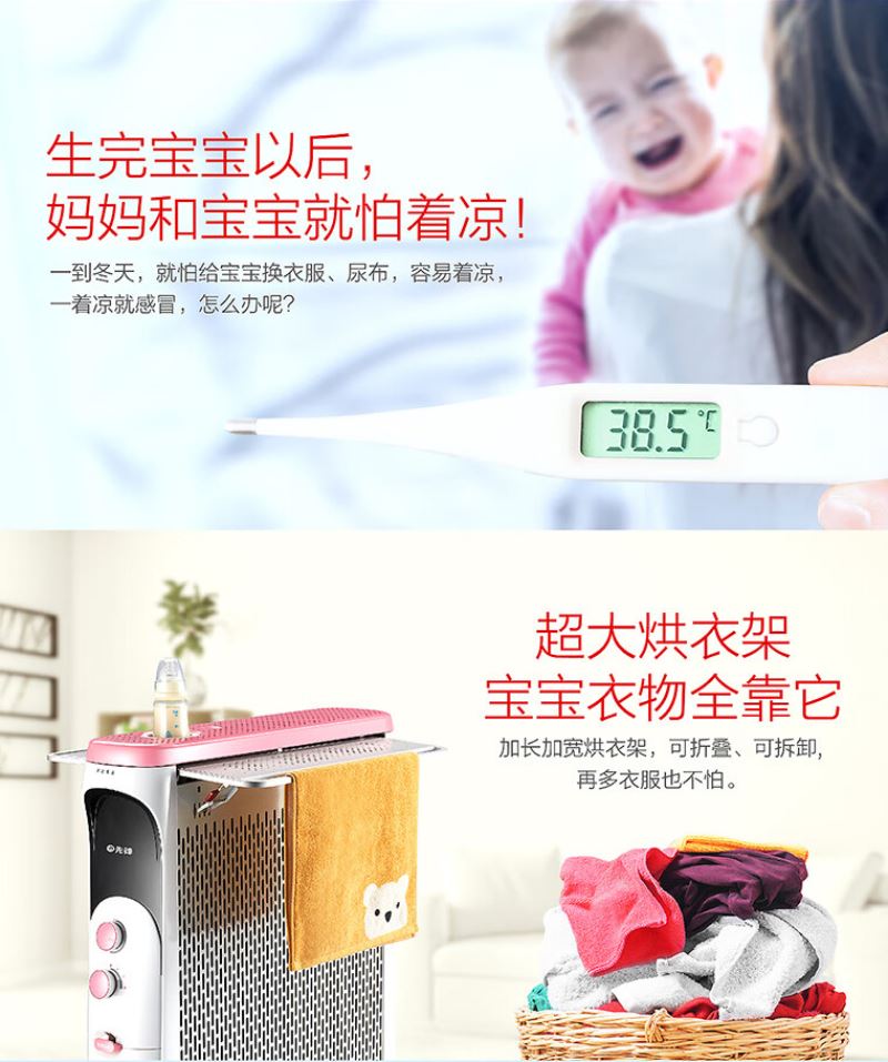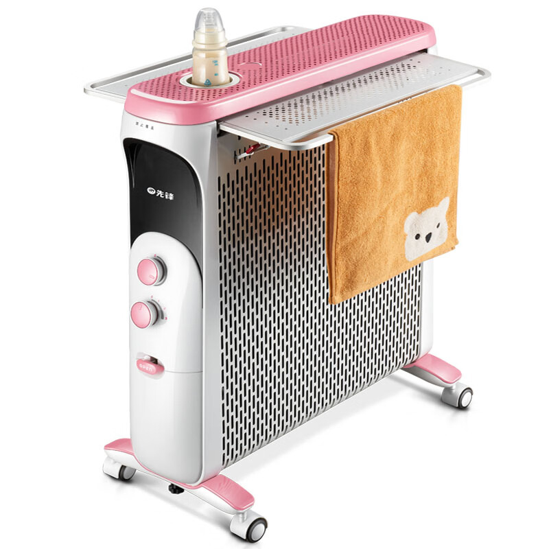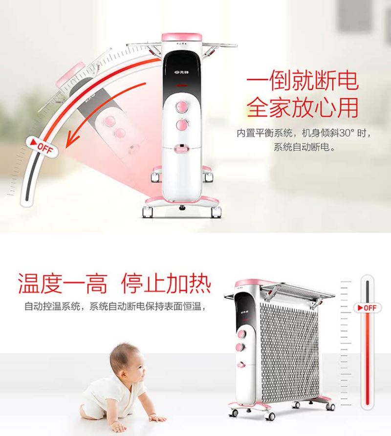 该取暖器额定电压 220 伏特,有 800W、1200W、2000W 三档功率可选,具备恒温功能。控制方式为机械式,带有加湿盒和衣架。它还内置平衡系统,倾斜 30 度自动断电,安全有保障。整体设计简约,适合家庭日常取暖,尤其适合有母婴的环境,能提供温暖舒适的室内温度。