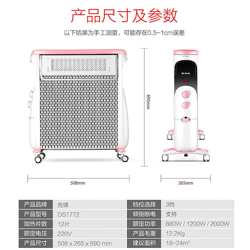 先锋电热油汀 CY77MM-12(DS1772)外观为白色,采用油汀式加热,适用于 18-24 平方米空间。其产品尺寸 615×370×860 毫米,净重约 19.3 千克。