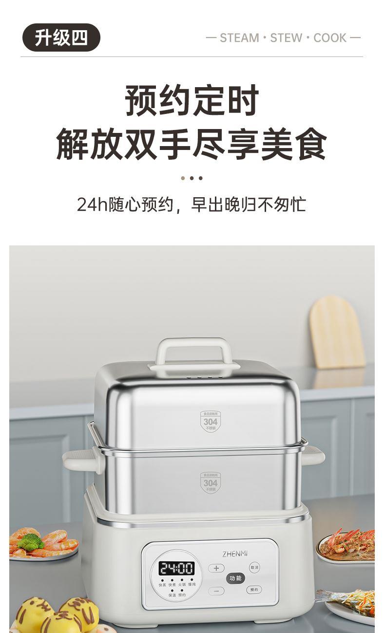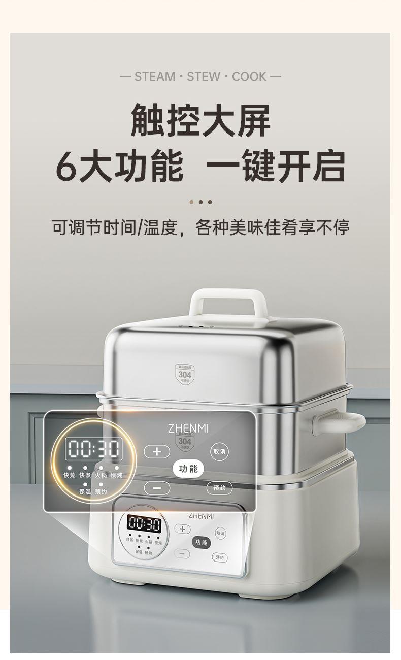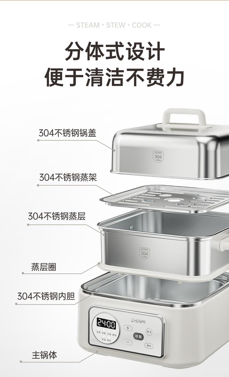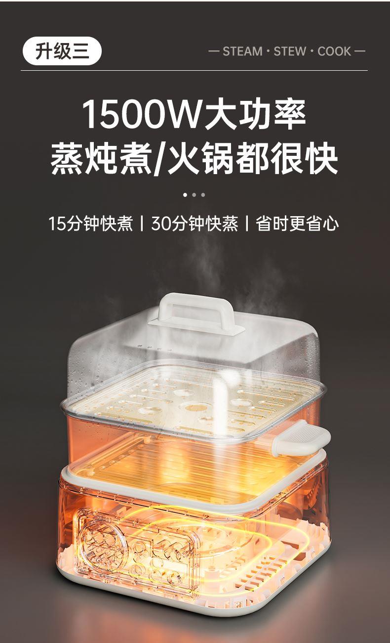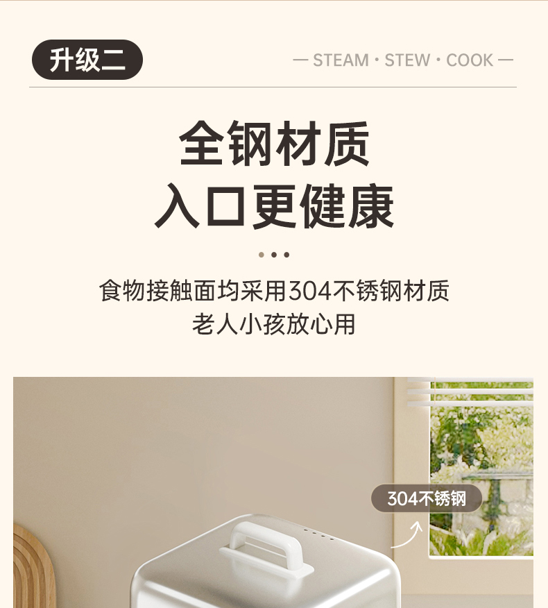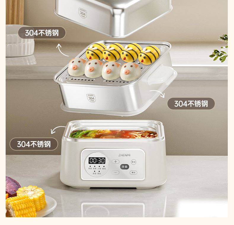 新升级”小钢侠“蒸煮锅,304不锈钢材质,健康美食一锅端 3.5L(锅体容积)+9L(蒸盘)2层大容量;涮火锅蒸谷物海鲜均满足; 1锅≥6台,饮食小管家,{蒸锅+煮锅+炖锅+火锅+辅食机+消毒机) 1500W大功率,快速加热,美食不久等 24小时自由预约/保温,早晚不匆忙,自动保温2小时,晚上回家更暖心 多功能面板,一键满足需求,快蒸/快煮/火锅/慢炖/预约/保温 全身不锈钢,健康耐用,更加适合母婴人群 防干烧保护,拒绝干烧糊底;