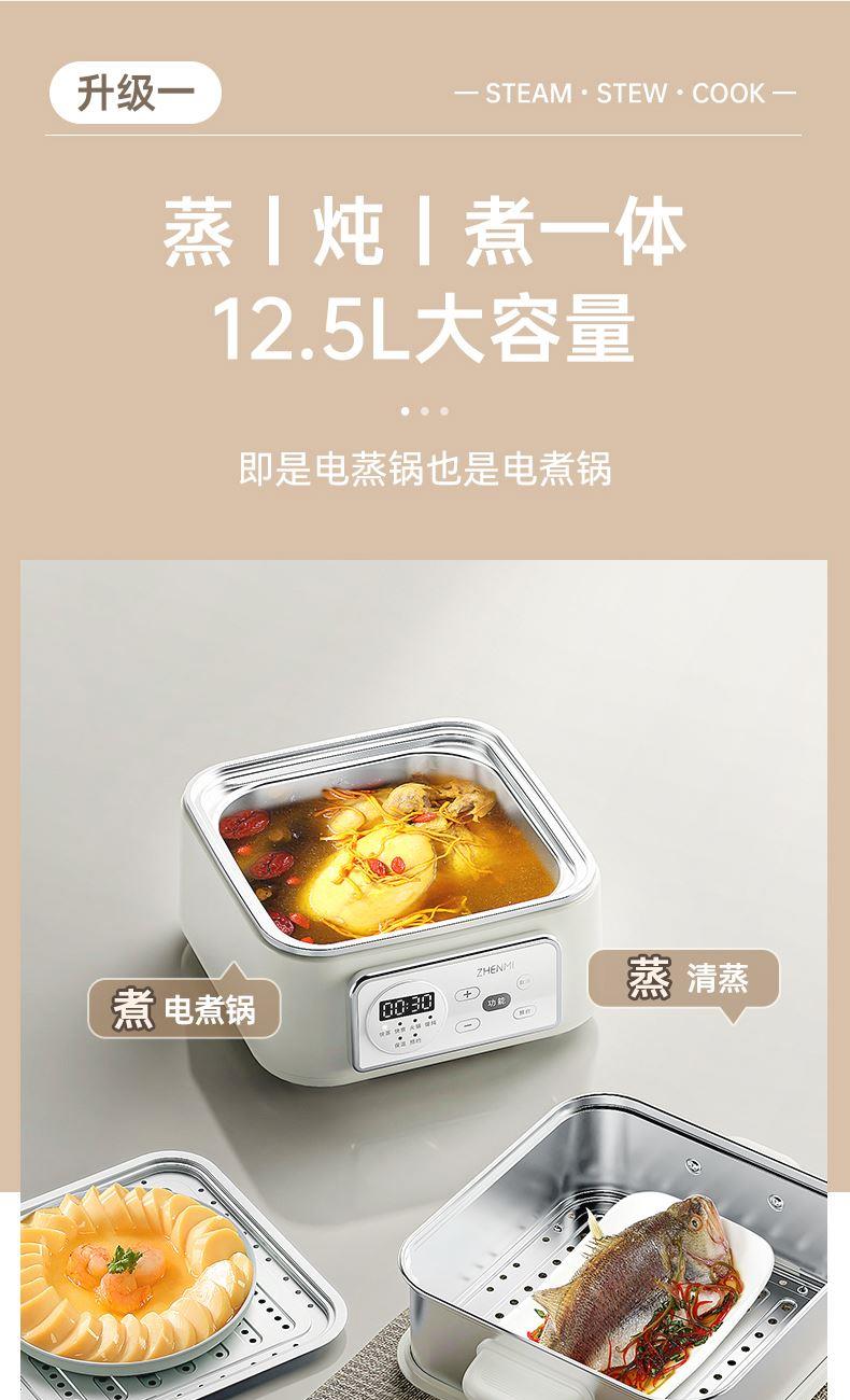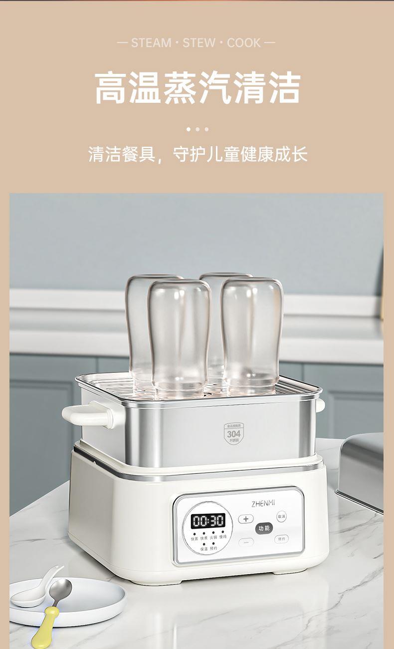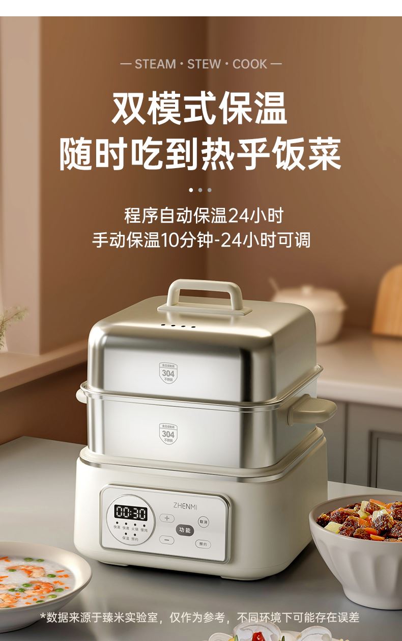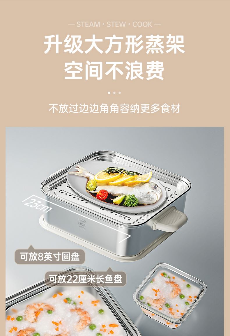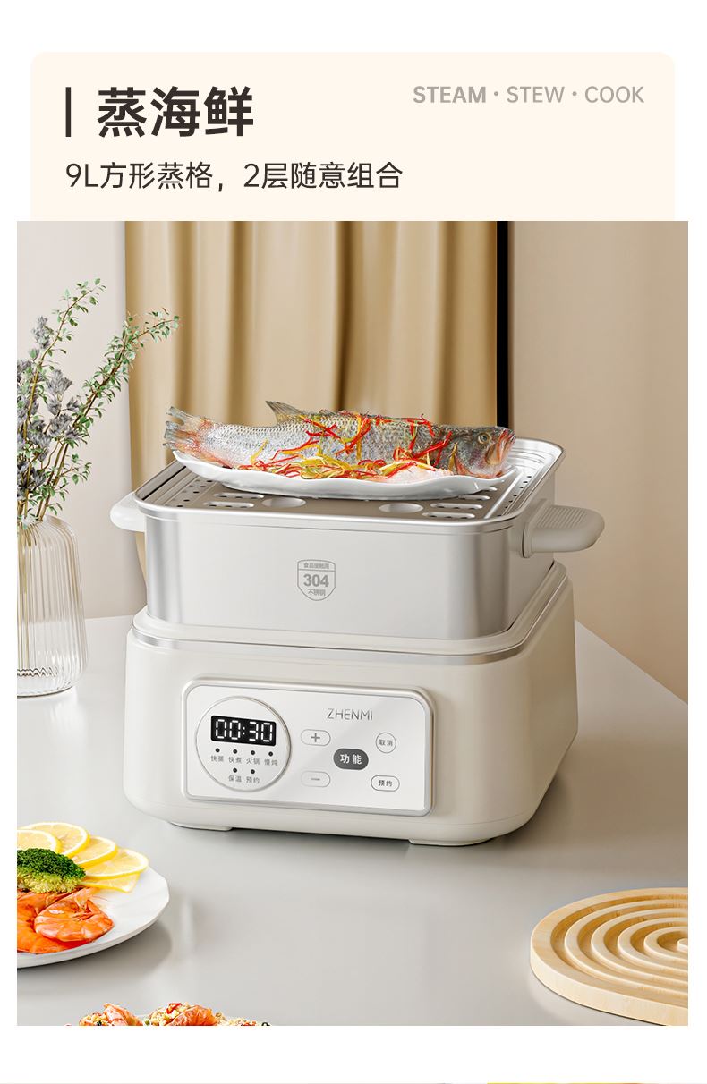 新升级”小钢侠“蒸煮锅,304不锈钢材质,健康美食一锅端 3.5L(锅体容积)+9L(蒸盘)2层大容量;涮火锅蒸谷物海鲜均满足; 1锅≥6台,饮食小管家,{蒸锅+煮锅+炖锅+火锅+辅食机+消毒机) 1500W大功率,快速加热,美食不久等 24小时自由预约/保温,早晚不匆忙,自动保温2小时,晚上回家更暖心 多功能面板,一键满足需求,快蒸/快煮/火锅/慢炖/预约/保温 全身不锈钢,健康耐用,更加适合母婴人群 防干烧保护,拒绝干烧糊底;