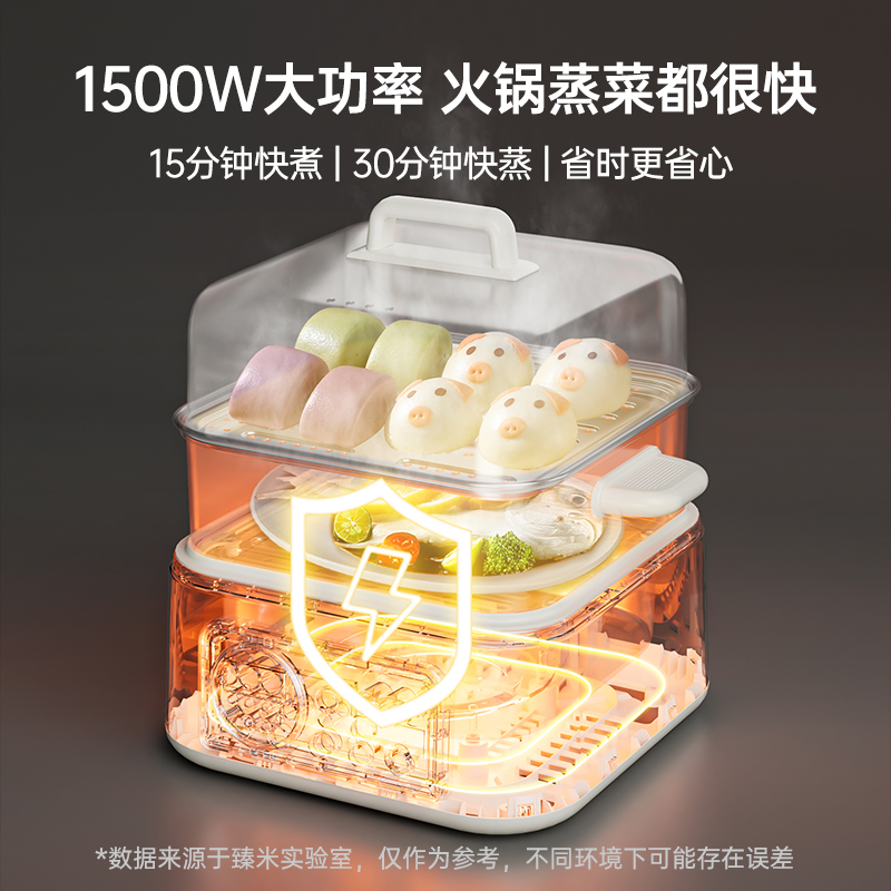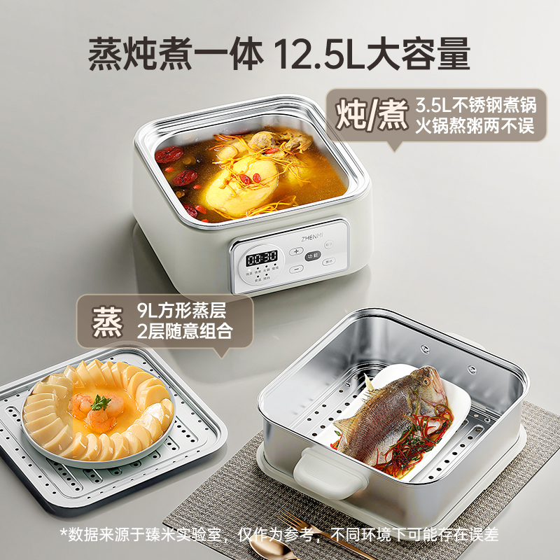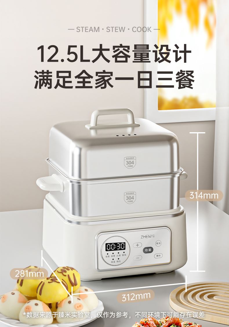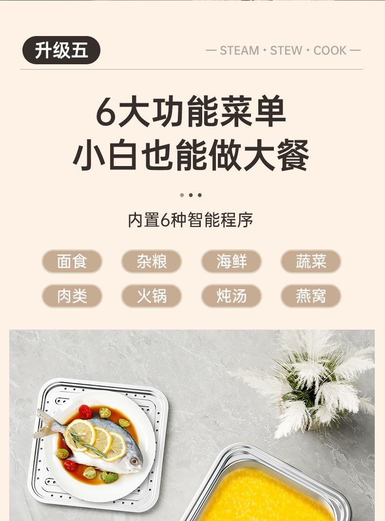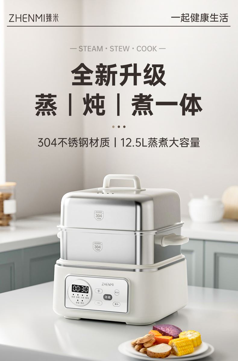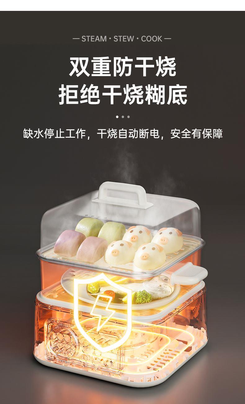 新升级”小钢侠“蒸煮锅,304不锈钢材质,健康美食一锅端 3.5L(锅体容积)+9L(蒸盘)2层大容量;涮火锅蒸谷物海鲜均满足; 1锅≥6台,饮食小管家,{蒸锅+煮锅+炖锅+火锅+辅食机+消毒机) 1500W大功率,快速加热,美食不久等 24小时自由预约/保温,早晚不匆忙,自动保温2小时,晚上回家更暖心 多功能面板,一键满足需求,快蒸/快煮/火锅/慢炖/预约/保温 全身不锈钢,健康耐用,更加适合母婴人群 防干烧保护,拒绝干烧糊底;