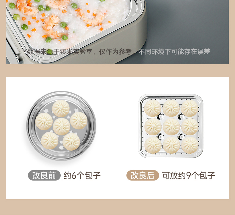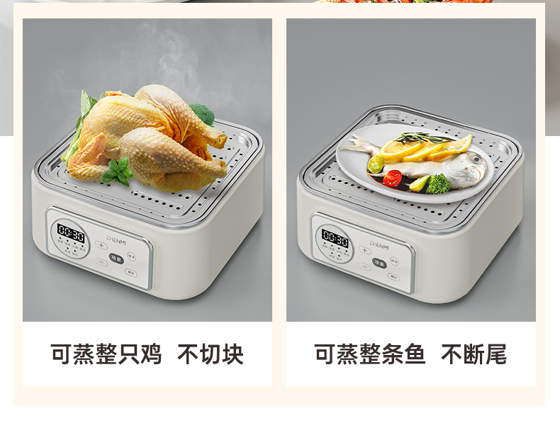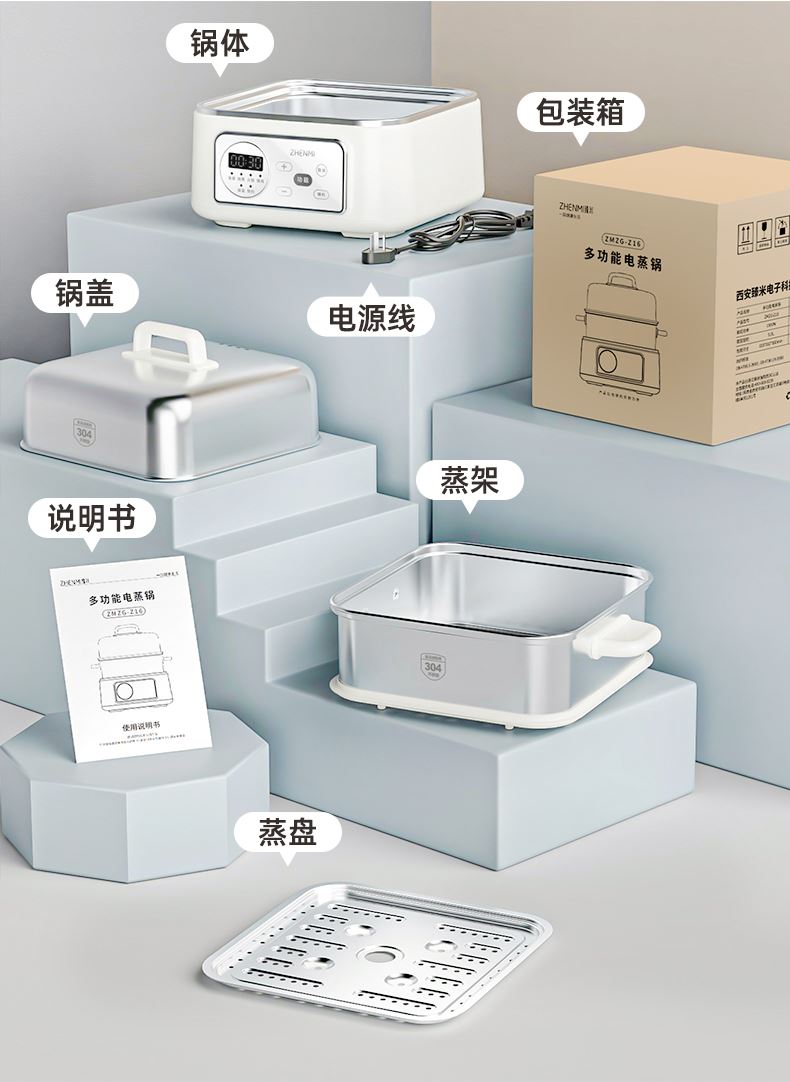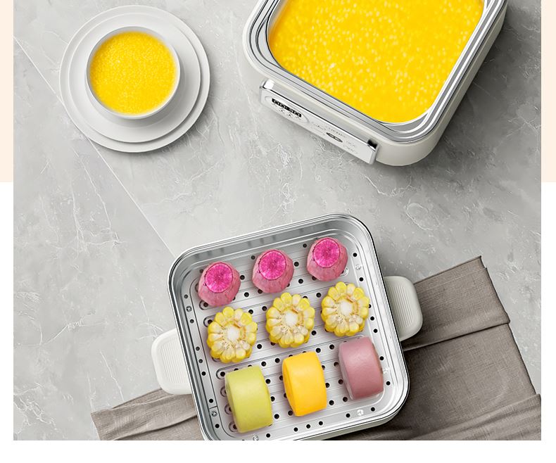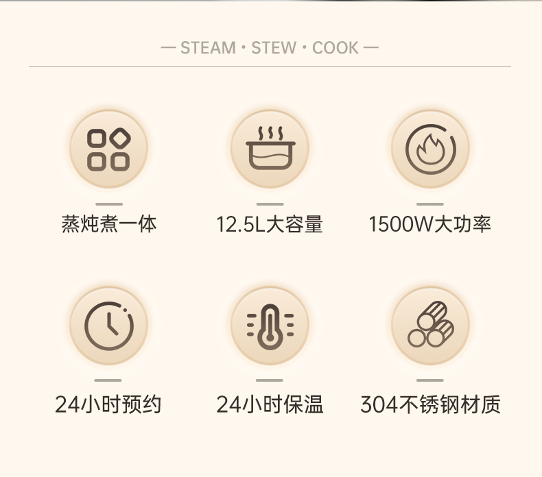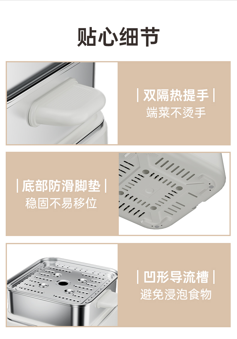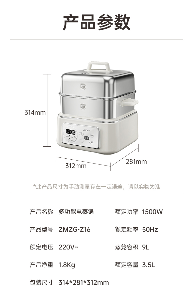 新升级”小钢侠“蒸煮锅,304不锈钢材质,健康美食一锅端 3.5L(锅体容积)+9L(蒸盘)2层大容量;涮火锅蒸谷物海鲜均满足; 1锅≥6台,饮食小管家,{蒸锅+煮锅+炖锅+火锅+辅食机+消毒机) 1500W大功率,快速加热,美食不久等 24小时自由预约/保温,早晚不匆忙,自动保温2小时,晚上回家更暖心 多功能面板,一键满足需求,快蒸/快煮/火锅/慢炖/预约/保温 全身不锈钢,健康耐用,更加适合母婴人群 防干烧保护,拒绝干烧糊底;