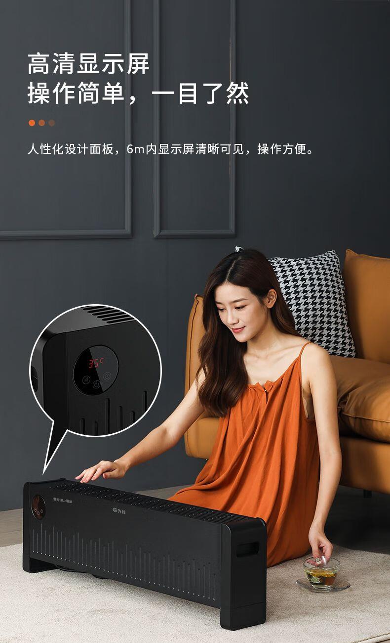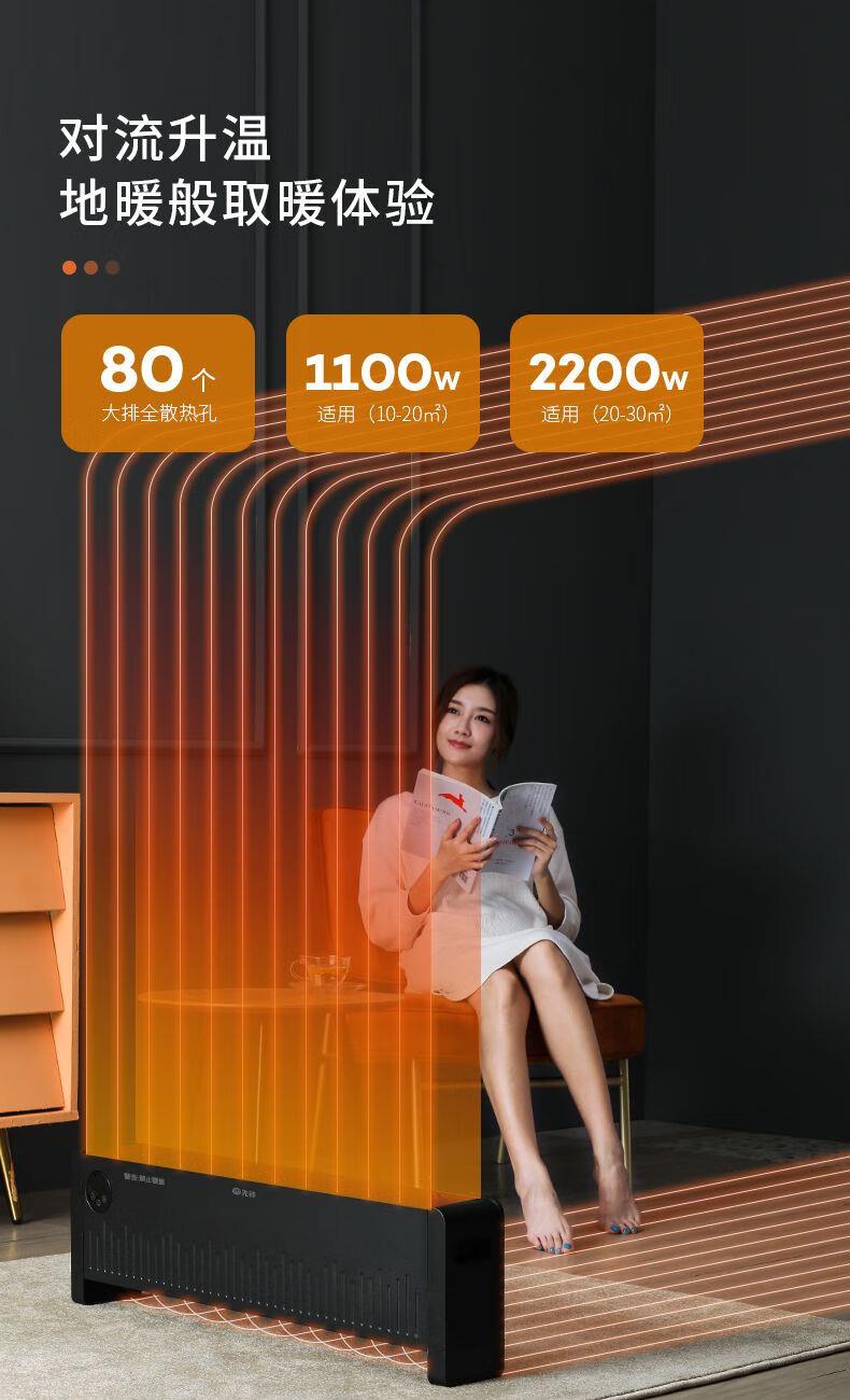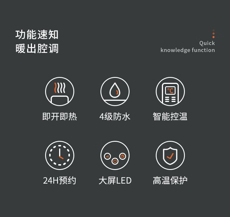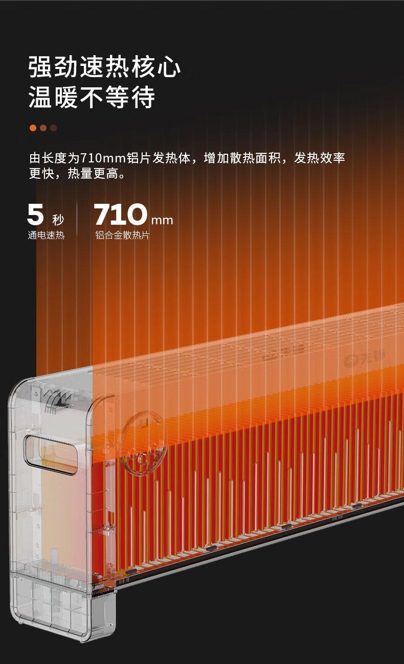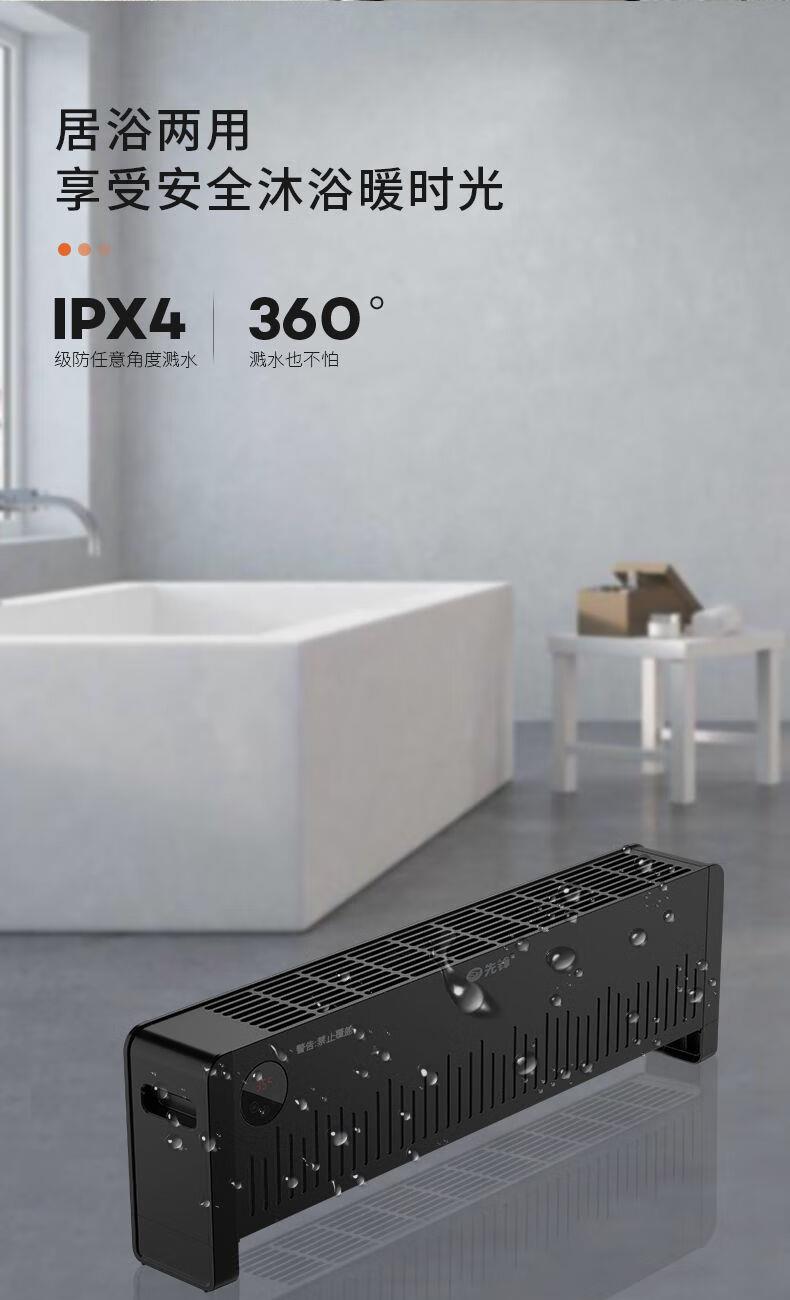IPX4级防水,居浴两用 360°防溅水、浴室用完卧室用 即开即热 石墨烯铝片发热体,热效高、全面提升加热速度与效果 超大三位8显示屏,显示更清晰,操作更方便 24H预约开关机,为你私人订制你的需求时间 6米远距离遥控 0.8米人性化设计,不在让你担心无处安放 0.8mm宽/60mm长,一共80个超大散热孔,散热面积大,对流速度更快、更均匀 高温断电保护,安全更安心