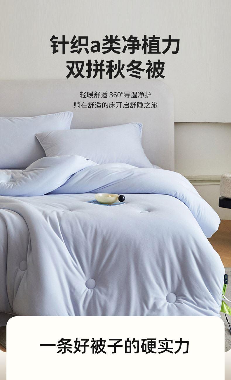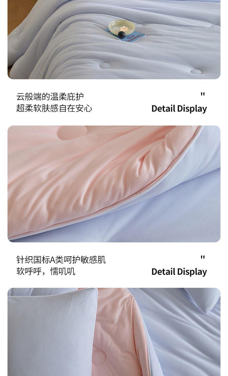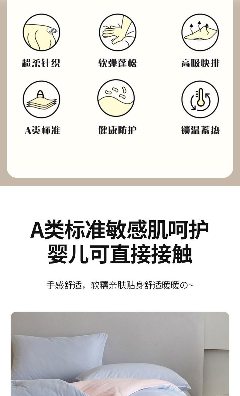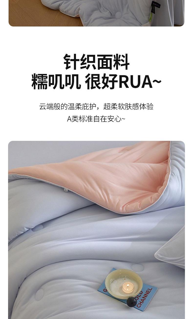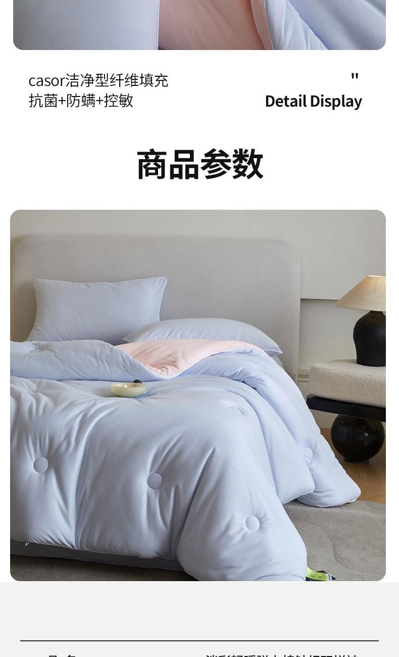 材质:针织棉(聚酯纤维) 填充:羽丝棉 尺寸:200×230cm 产品说明: 1.针织国标A类呵护敏感肌,软呼呼,懦叽叽 2.云般端的温柔庇护,超柔软肤感自在安心。 3. casor洁净型纤维填充+防螨+控敏