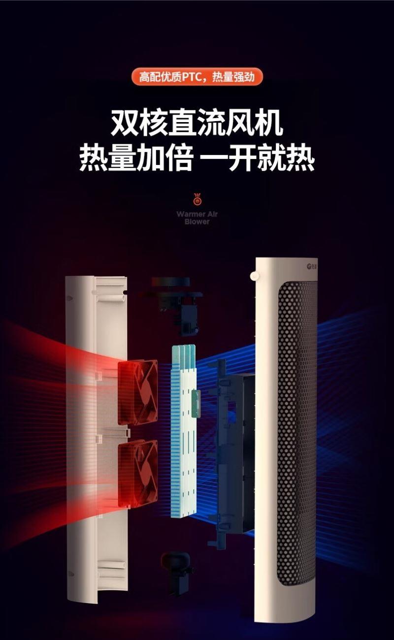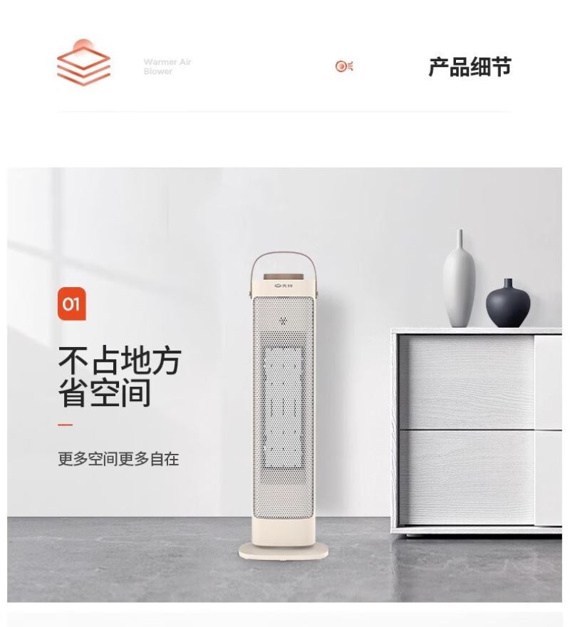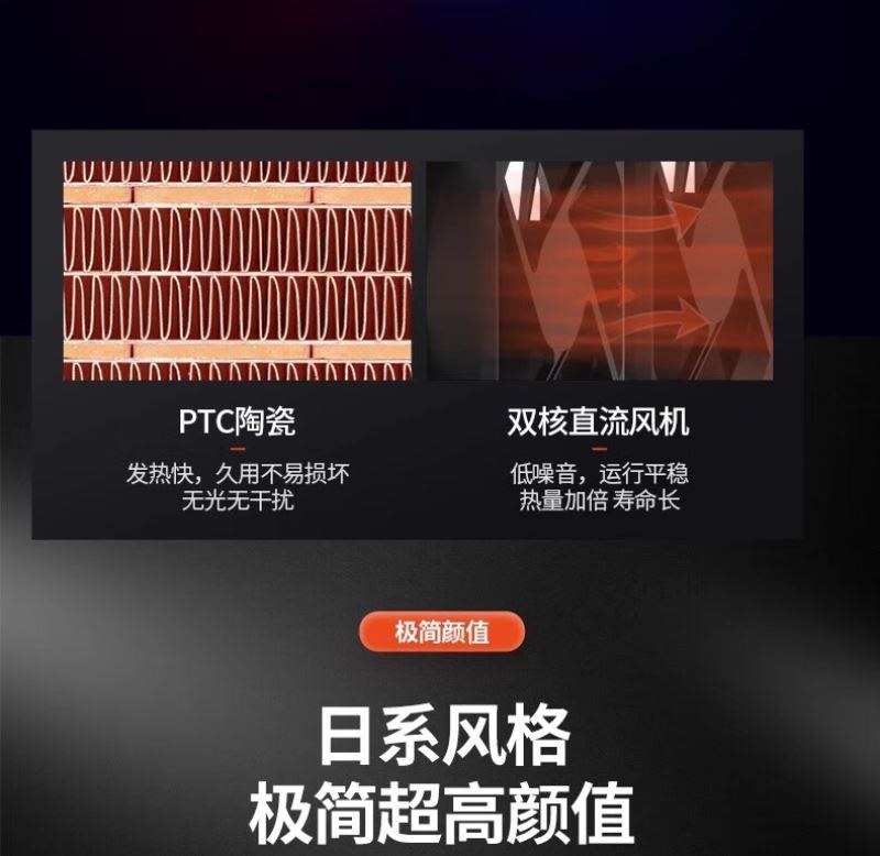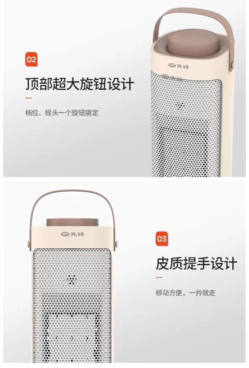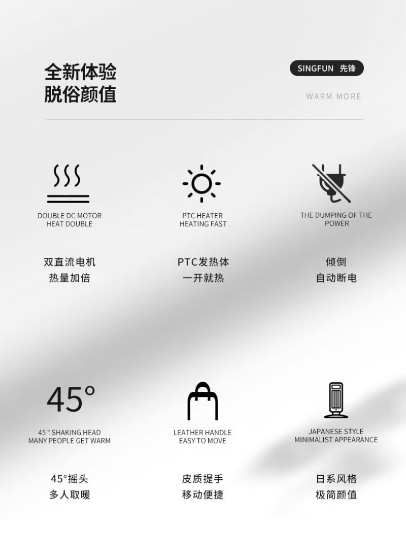 石墨烯前网 PTC陶瓷发热体,热量大,持久热源,寿命长 直流风机,低噪音,运行平稳,寿命长 一开就热,无光不刺眼 日系风格、极简高颜值 顶部超大旋钮设计,档位、摇头一个旋钮搞定 人性化皮质提手设计,移动更方便 超大出风口 左右45°摇头
