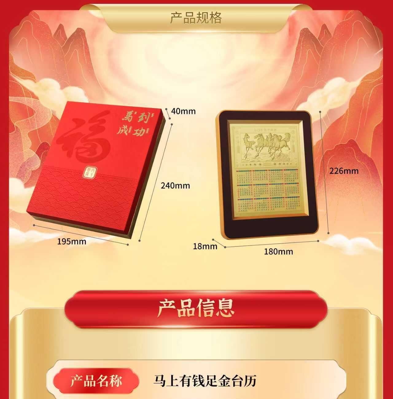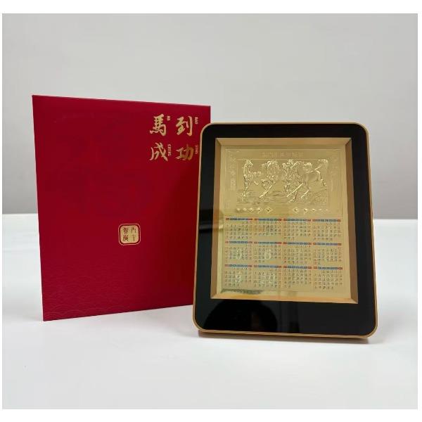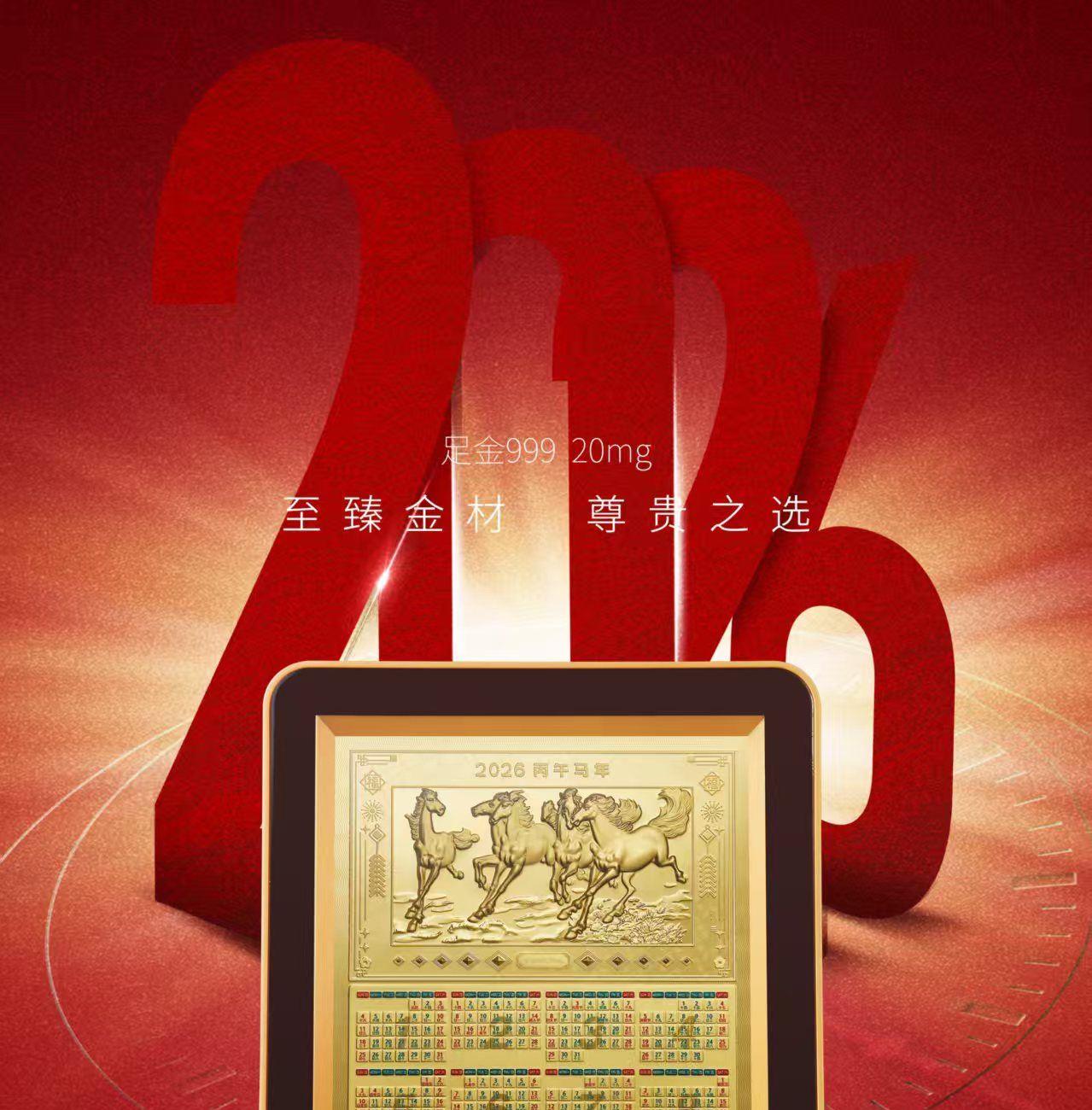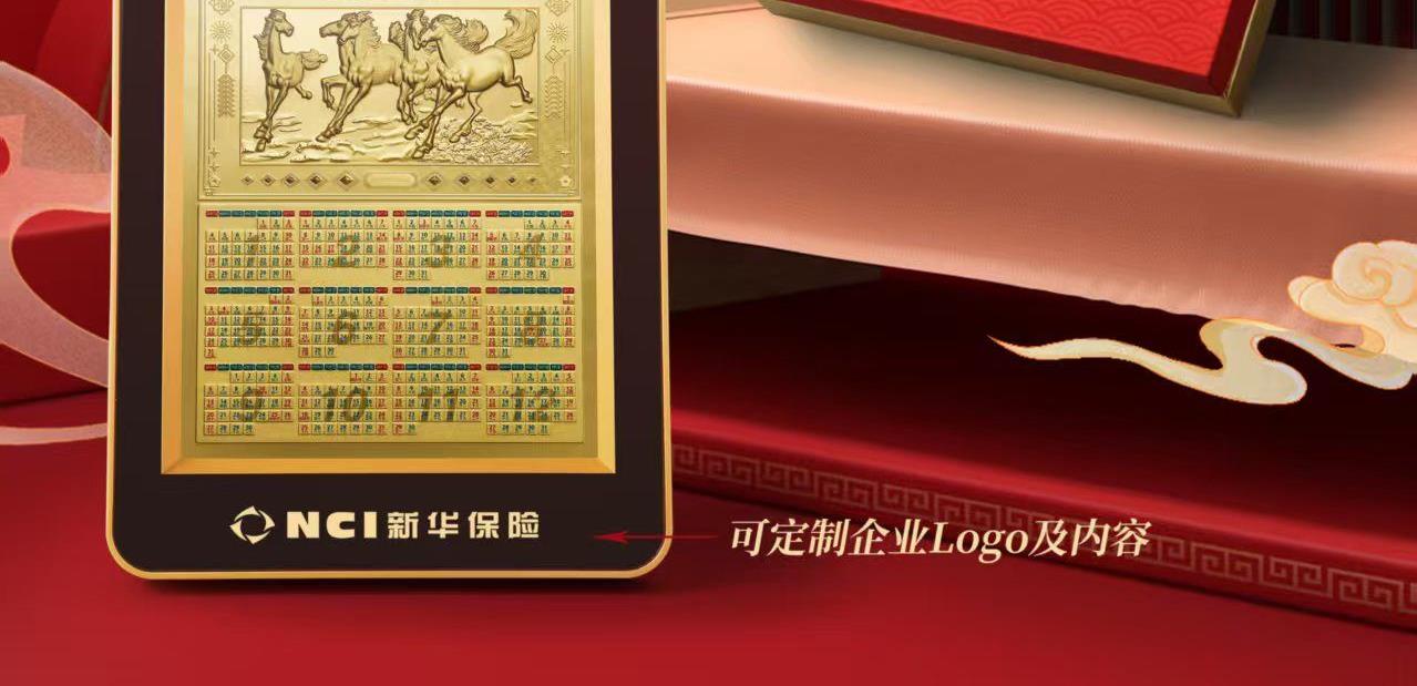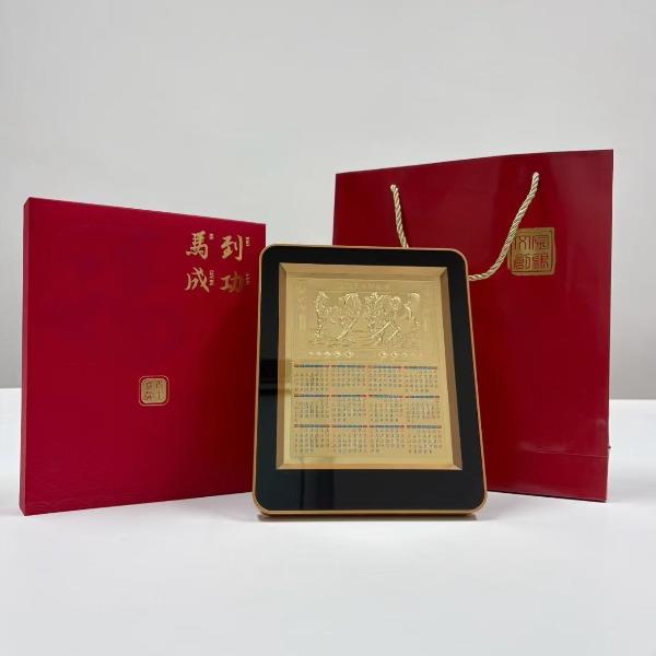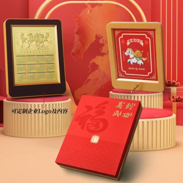 产品配置: 材质: 足金999 20mg 1.黄金台历×1个 2.检测证书×1张 3.精美礼盒×1个 包装尺寸:195*240*40mm 台历尺寸:180*226*18mm 50件起可免费定制 银行好礼,典藏之选 精选足金999,6匹奔腾骏马浮雕跃然其上,鬃毛猎猎,蹄踏祥云,寓意「马到成功,财源奔腾」。搭配2026丙午马年专属日历,佳节节气一目了然,兼具实用价值与艺术典藏性。