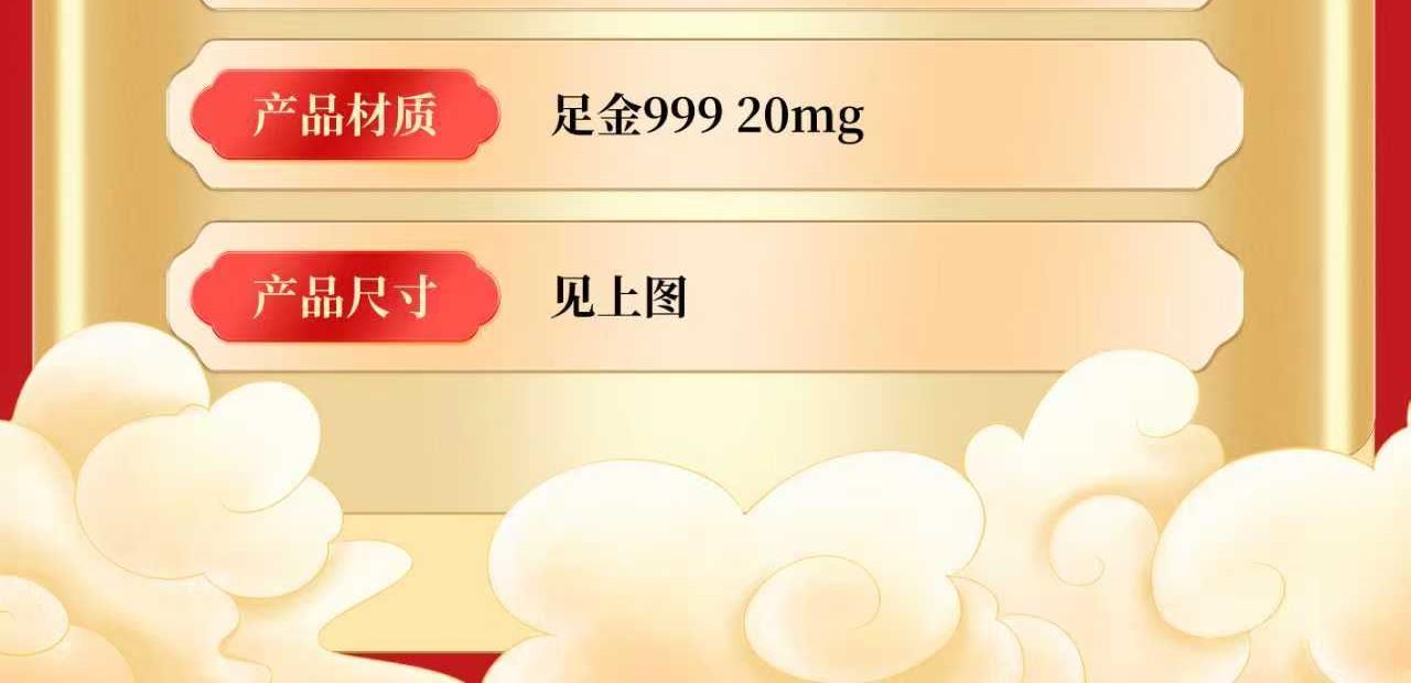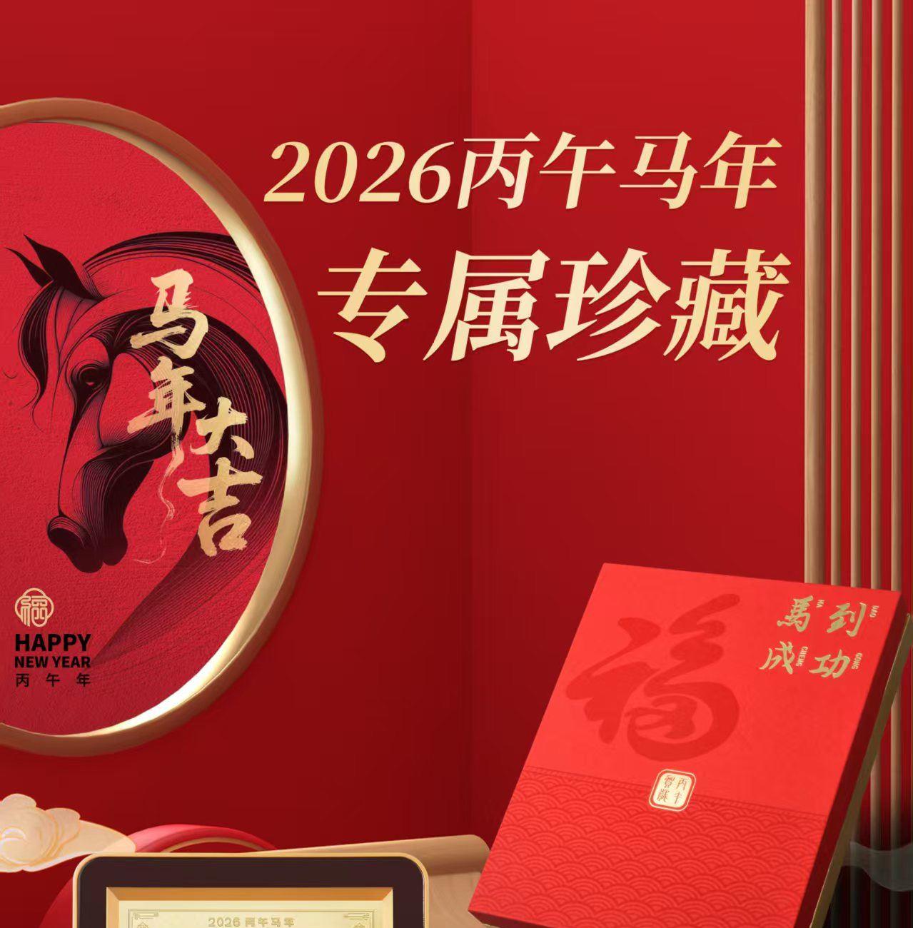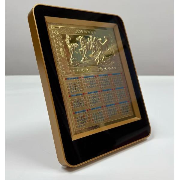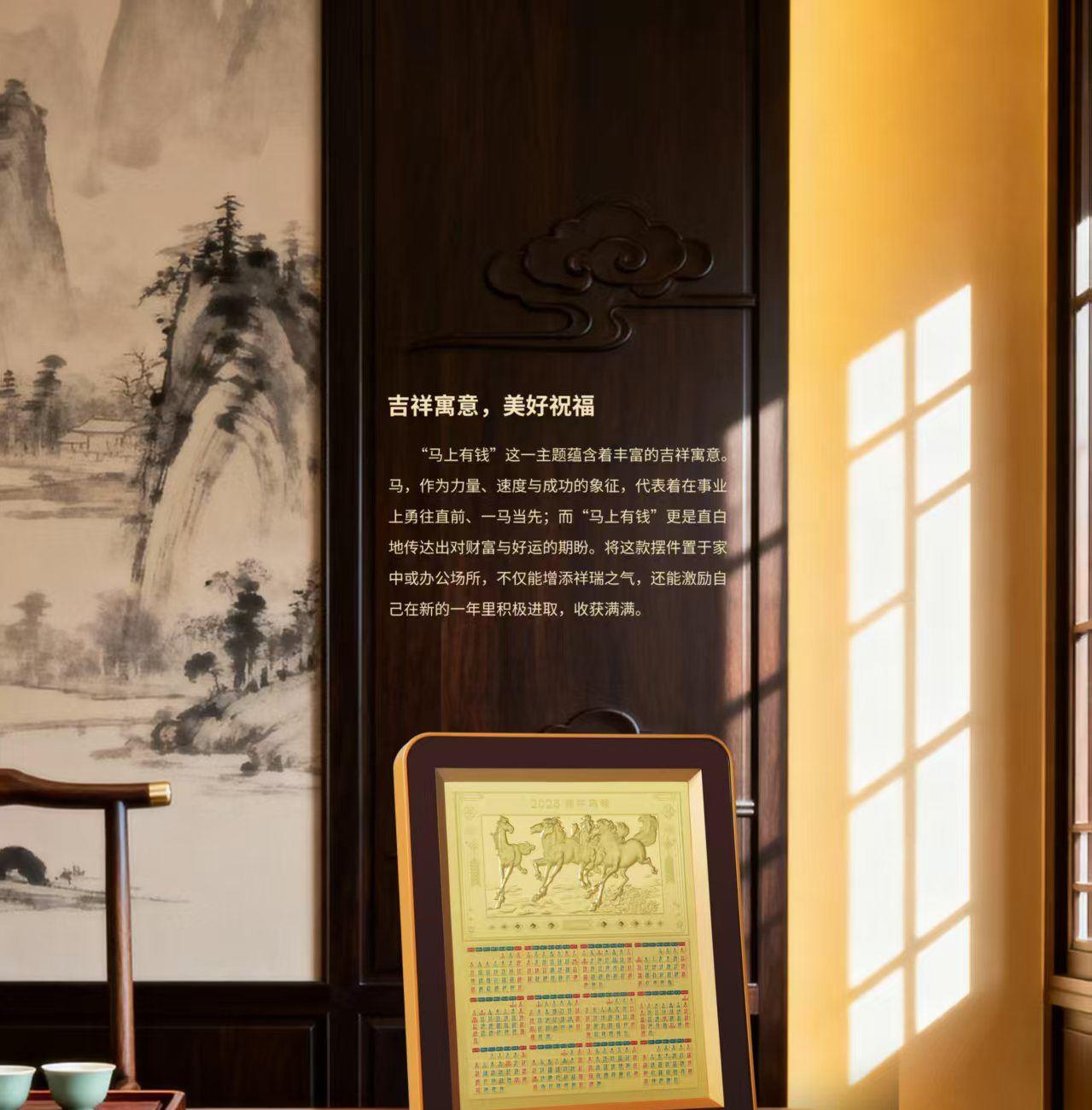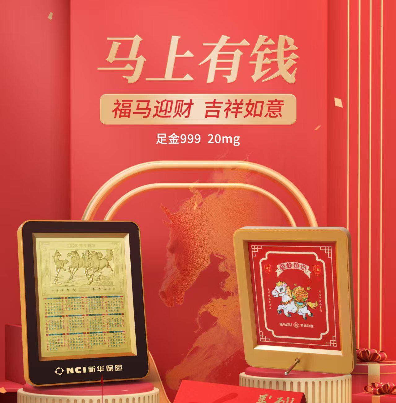 产品配置: 材质: 足金999 20mg 1.黄金台历×1个 2.检测证书×1张 3.精美礼盒×1个 包装尺寸:195*240*40mm 台历尺寸:180*226*18mm 50件起可免费定制 银行好礼,典藏之选 精选足金999,6匹奔腾骏马浮雕跃然其上,鬃毛猎猎,蹄踏祥云,寓意「马到成功,财源奔腾」。搭配2026丙午马年专属日历,佳节节气一目了然,兼具实用价值与艺术典藏性。
