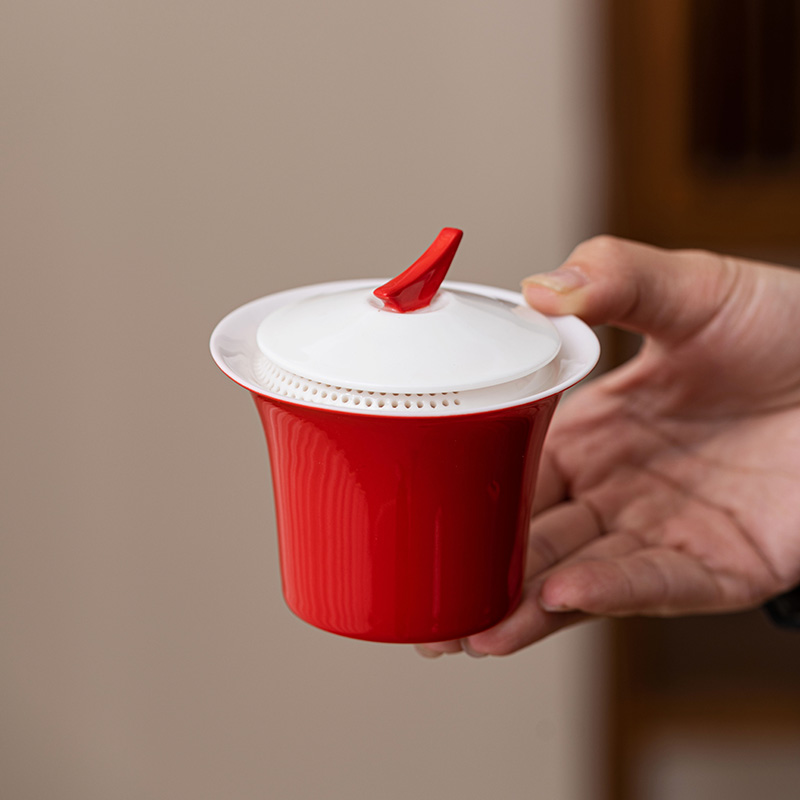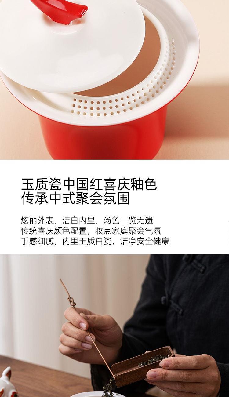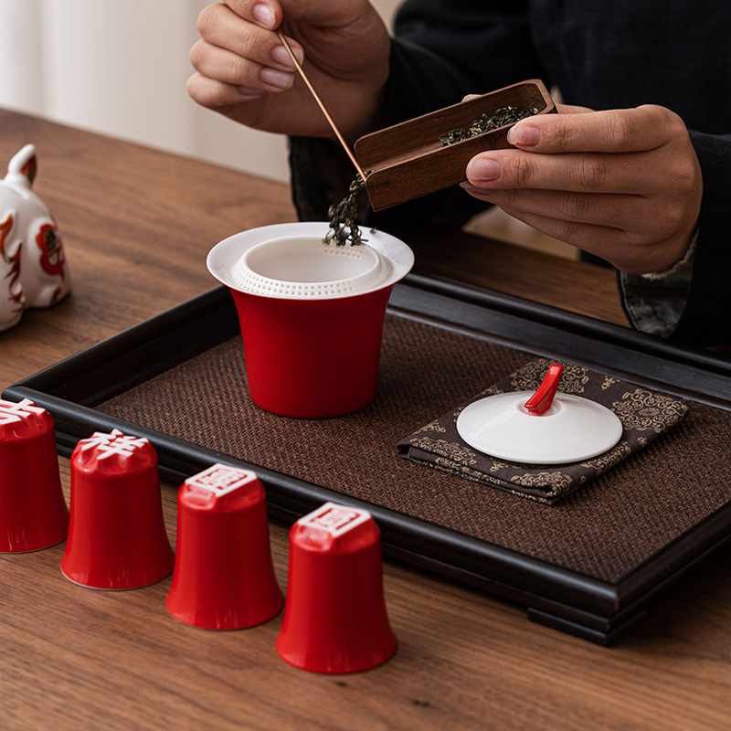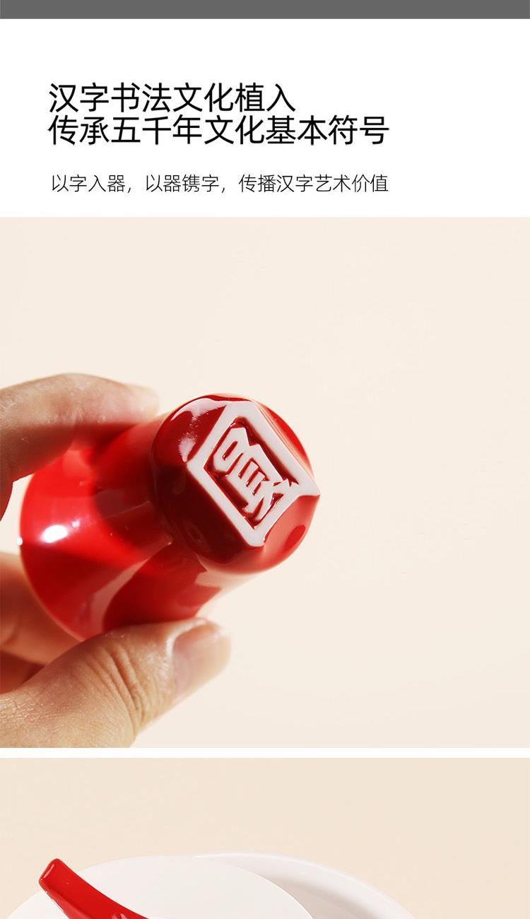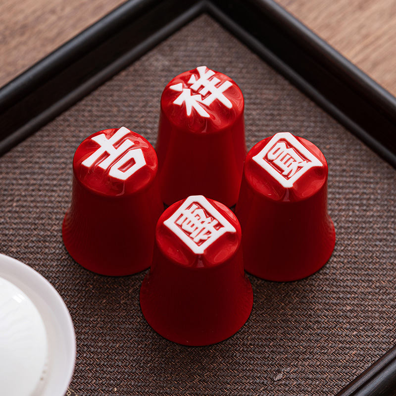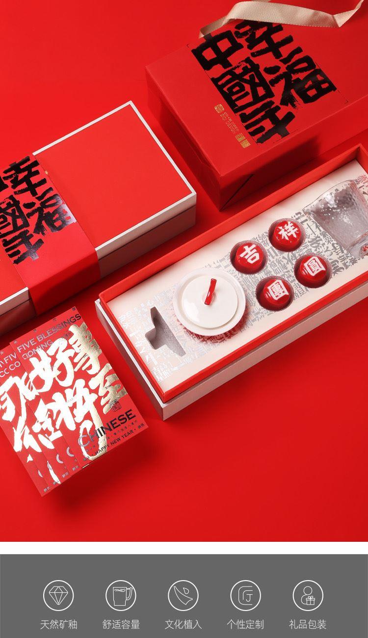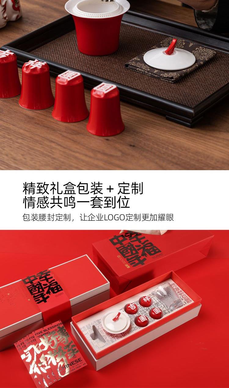 配置:汉字杯*4(吉祥团圆) 旭日东升壶*1 锤纹玻璃公道*1 材质:白玉瓷胎 颜色:中国红 尺寸:包装400*160*95mm 容量:壶150ml公道150ml杯40ml 1:汉字杯历经1300度以上高温烧制,不含铅和镉等重金属。 2:杯型源自竹节,自主开模,手工塑形。 3:传统中国红,结合汉字书法魏碑字体,相得益彰