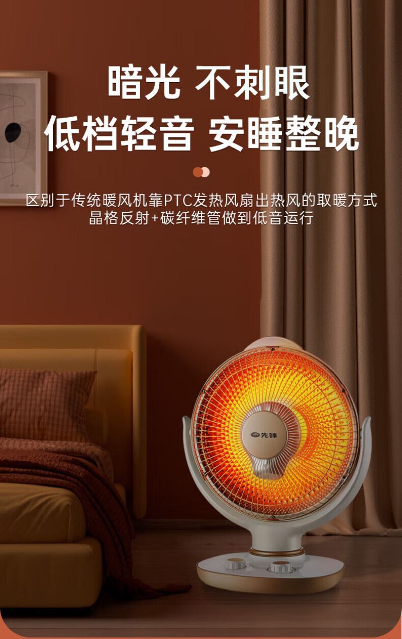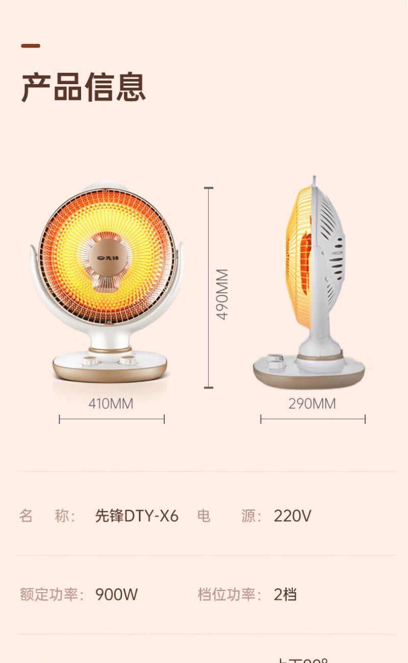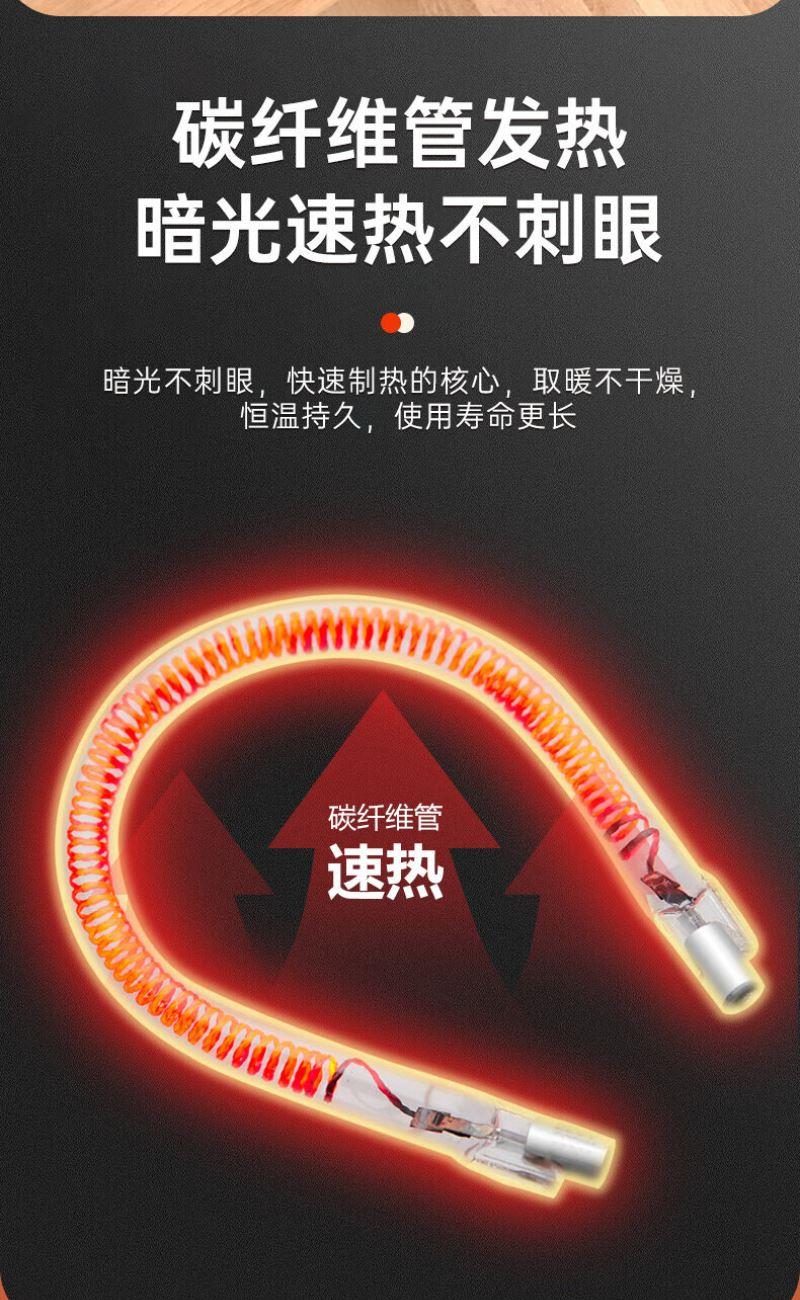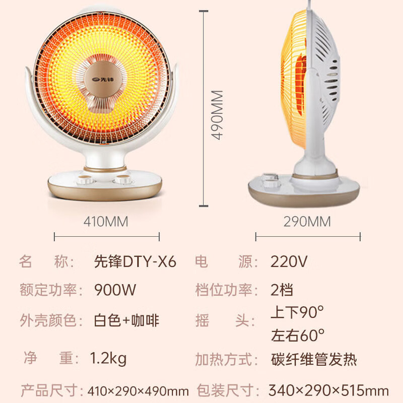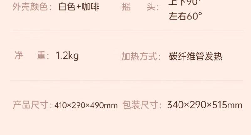 基本参数:产品尺寸为 410mm×290mm×490mm,重量 1.2kg,颜色为白色,发热管材质是碳纤管,温控方式为机械式。 功率参数:额定电压 220V/50Hz,额定功率 900W,有 2 个档位。 功能参数:支持摇头功能,具备倾倒保护功能,加热方式为远红外加热,适用面积为 5-10 平方米。 产品特点:台立两用设计,使用灵活,可根据需求放置。碳纤管加热,能快速升温,通过远红外传热,可实现局部快速取暖。