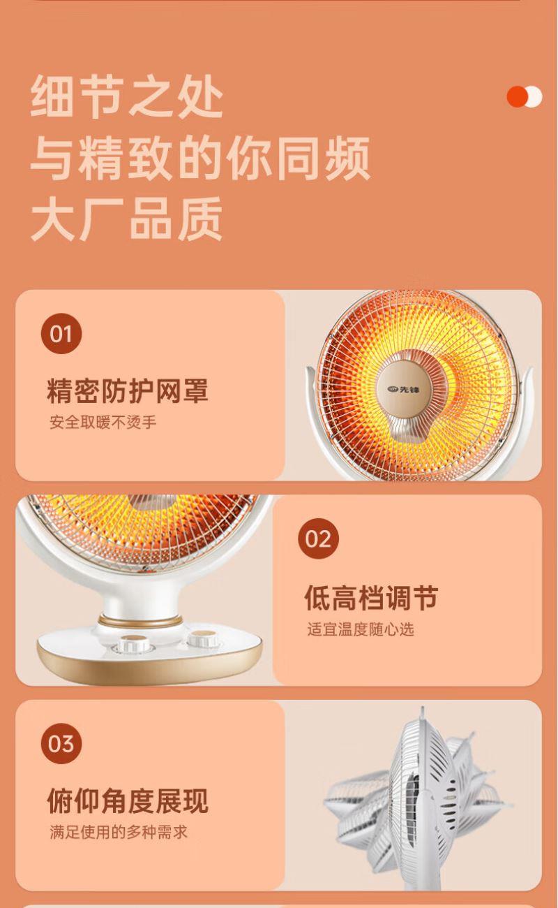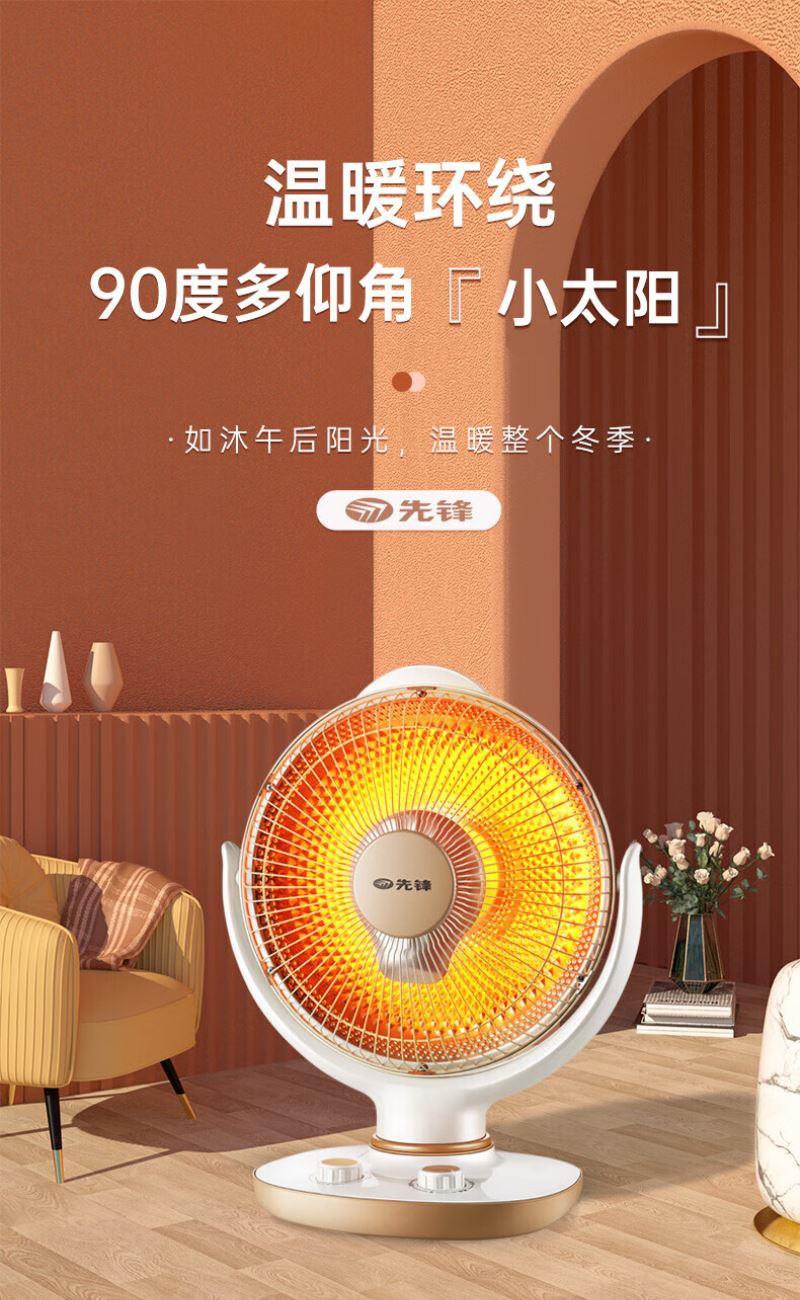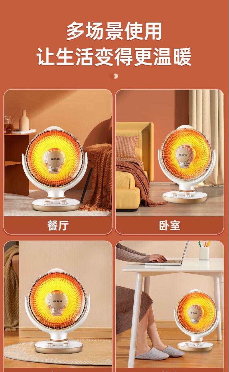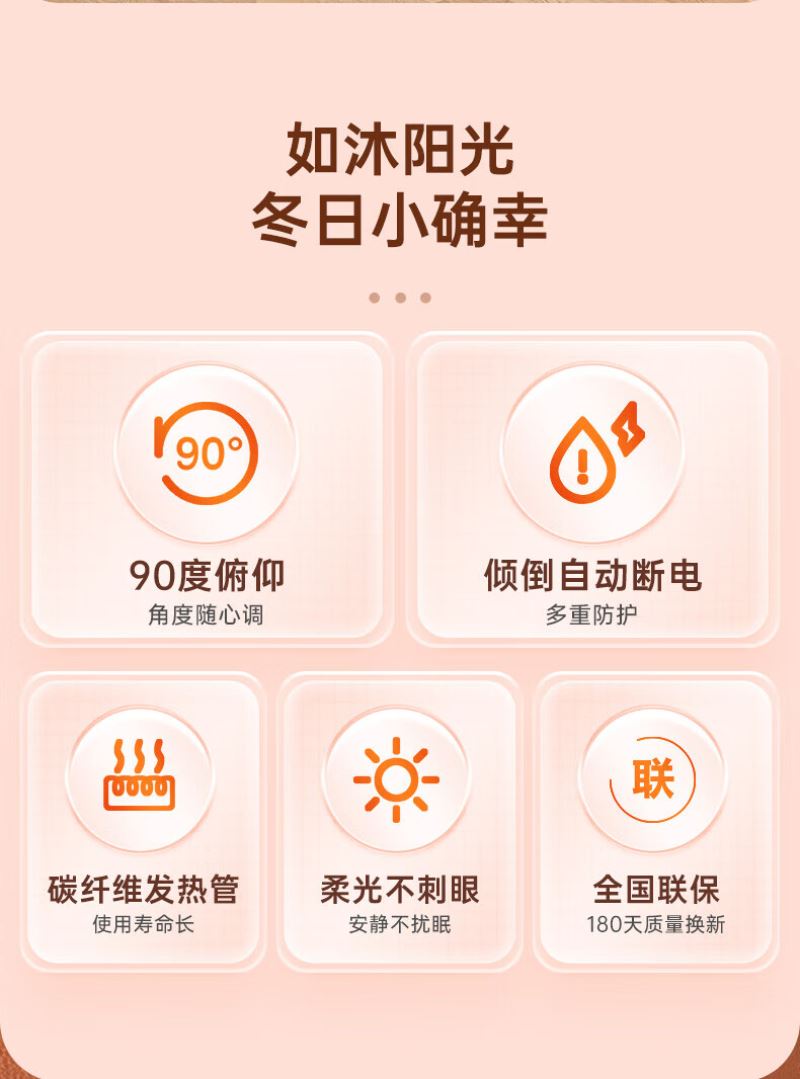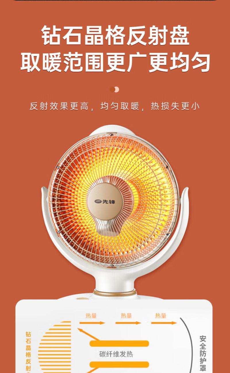 基本参数:产品尺寸为 410mm×290mm×490mm,重量 1.2kg,颜色为白色,发热管材质是碳纤管,温控方式为机械式。 功率参数:额定电压 220V/50Hz,额定功率 900W,有 2 个档位。 功能参数:支持摇头功能,具备倾倒保护功能,加热方式为远红外加热,适用面积为 5-10 平方米。 产品特点:台立两用设计,使用灵活,可根据需求放置。碳纤管加热,能快速升温,通过远红外传热,可实现局部快速取暖。