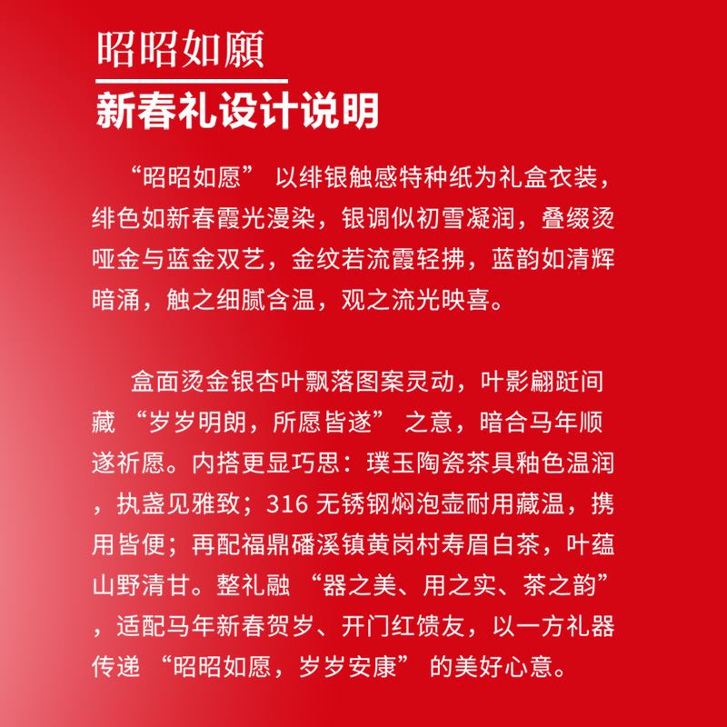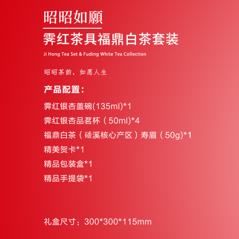 【产品配置】 霁红银杏盖碗(135ml)*1 红银杏品茗杯(50ml)*4 福鼎白茶(磻溪核心产区)寿眉(50g)*1 精美贺卡*1 精品包装盒*1 精品手提袋*1 【产品说明】 霁红茶具+福鼎白茶寿眉,茶器茶品双优; 磻溪核心产区白茶,品质有保障; 银杏元素霁红礼盒,颜值档次高; 商务礼赠、新年礼赠,场景适配广; 茶具茶叶组合,礼赠实用有诚意。